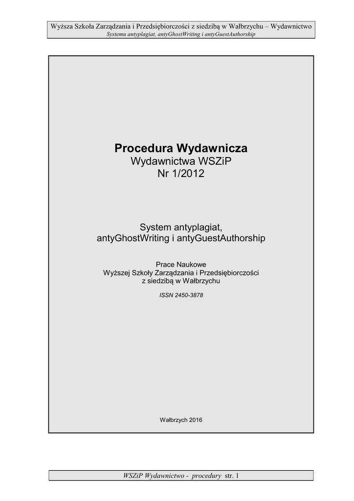 Wyższa Szkoła Zarządzania i Przedsiębiorczości z siedzibą w Wałbrzychu – Wydawnictwo Systemu antyplagiat, antyGhostWriting i antyGuestAuthorship Procedura Wydawnicza Wydawnictwa WSZiP Nr 1/2012 System antyplagiat, antyGhostWriting i antyGuestAuthorship Prace Naukowe Wyższej Szkoły Zarządzania i Przedsiębiorczości z siedzibą w Wałbrzychu ISSN 2450-3878 Wałbrzych 2016 WSZiP Wydawnictwo - procedury str. 1 Wyższa Szkoła Zarządzania i Przedsiębiorczości z siedzibą w Wałbrzychu – Wydawnictwo Systemu antyplagiat, antyGhostWriting i antyGuestAuthorship Opracował: Tadeusz Gospodarek Odpowiedzialni 1. za wdrożenie: Michał Lesman 2. za nadzór nad funkcjonowaniem: Franciszek Mroczko 3. za kontrolę: Michał Lesman Dotyczy: 1. Autorzy i współautorzy prac publikowanych, 2. Recenzenci naukowi, 3. Komitet wydawniczy, 4. Audytorzy zewnętrzni. Data obowiązywania Obowiązuje od: od 01.01.2012 Ważność do: bezterminowo Wersja dokumentu Wersja dokumentu: 1.2 z dnia: 10.03.2016 Zatwierdził: Franciszek Mroczko WSZiP Wydawnictwo - procedury str. 2 Wyższa Szkoła Zarządzania i Przedsiębiorczości z siedzibą w Wałbrzychu – Wydawnictwo Systemu antyplagiat, antyGhostWriting i antyGuestAuthorship SPIS TREŚCI: Opracował: .............................................................................................................................................. 2 Odpowiedzialni ........................................................................................................................................ 2 Dotyczy: ................................................................................................................................................... 2 Data obowiązywania................................................................................................................................ 2 Wersja dokumentu .................................................................................................................................... 2 Zatwierdził: .............................................................................................................................................. 2 I WDROŻENIE I FUNKCJONOWANIA SYSTEMU ETYKI AUTORSKIEJ ................................................................... 4 1. Preambuła............................................................................................................................................ 4 2. Cele procedury ..................................................................................................................................... 4 3. Zakres działania procedury ................................................................................................................. 4 4. Zasady działania procedury................................................................................................................. 4 5. Wynik działania procedury .................................................................................................................. 5 II OPIS FUNKCJONALNY PROCEDURY ............................................................................................................. 6 1. Instrukcja dla autorów ......................................................................................................................... 6 2. Wewnętrzna kontrola ........................................................................................................................... 6 III FORMULARZE ........................................................................................................................................... 7 1. Formularz FE-01 ................................................................................................................................. 7 2. Formularz FE-02 ................................................................................................................................. 8 WSZiP Wydawnictwo - procedury str. 3 Wyższa Szkoła Zarządzania i Przedsiębiorczości z siedzibą w Wałbrzychu – Wydawnictwo Systemu antyplagiat, antyGhostWriting i antyGuestAuthorship I Wdrożenie i funkcjonowania systemu etyki autorskiej 1. Preambuła Z dokumentu Polskiej Bibliografii Naukowej1: „Rzetelność w nauce stanowi jeden z jej jakościowych fundamentów. Czytelnicy powinni mieć pewność, iż autorzy publikacji w sposób przejrzysty, rzetelny i uczciwy prezentują rezultaty swojej pracy, niezależnie od tego, czy są jej bezpośrednimi autorami, czy też korzystali z pomocy wyspecjalizowanego podmiotu (osoby fizycznej lub prawnej). Dowodem etycznej postawy pracownika naukowego oraz najwyższych standardów redakcyjnych powinna być jawność informacji o podmiotach przyczyniających się do powstania publikacji (wkład merytoryczny, rzeczowy, finansowy etc.), co jest przejawem nie tylko dobrych obyczajów, ale także społecznej odpowiedzialności.” 2. Cele procedury 1. 2. 3. 4. 5. 6. Zapewnienie transparentności autorskiej publikacji. Zapewnienie rzetelności naukowej prac przyjętych do publikacji. Zapewnienie informacji na temat financial disclosure publikacji. Eliminacja plagiatów oraz przypadków ghostwriting i guestauthorship Stworzenie systemu dokumentowania naruszeń etyki publikowania. Stworzenie systemu wymiany informacji na temat naruszeń etyki publikowania. 3. Zakres działania procedury 1. Procedura dotyczy wszelkich publikacji sygnowanych przez Wydawnictwo WSZiP numerem ISSN 2450-3878 lub ISBN 978-83-60904-XX-X. 2. Procedura dotyczy wszystkich autorów prac złożonych do publikacji w czasopiśmie lub autorów fragmentów druków zwartych złożonych do opublikowania przez Wydawnictwo. 3. Procedura dotyczy wszystkich osób odpowiedzialnych za nadzór nad zachowaniem zasada etycznych publikacji Wydawnictwa WSZiP. 4. Procedura dotyczy wszystkich interesariuszy procesu transparentności oraz rzetelności naukowej publikacji. 4. Zasady działania procedury 1. Redakcja będzie