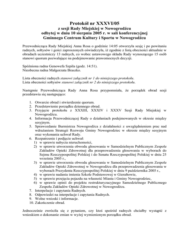 Protokół nr XXXVI/05 z sesji Rady Miejskiej w Nowogrodźcu odbytej w dniu 10 sierpnia 2005 r. w sali konferencyjnej Gminnego Centrum Kultury i Sportu w Nowogrodźcu Przewodnicząca Rady Miejskiej Anna Rosa o godzinie 14:05 otworzyła sesję i po powitaniu radnych, sołtysów i gości zaproszonych oświadczyła, iż zgodnie z listą obecności aktualnie w obradach uczestniczy 13 radnych, co wobec ustawowego składu Rady wynoszącego 15 osób stanowi quorum pozwalające na podejmowanie prawomocnych decyzji. Spóźniona radna Genowefa Szpila (godz. 14:51). Nieobecna radna Małgorzata Braszko. Lista obecności radnych stanowi załącznik nr 1 do niniejszego protokołu. Lista obecności sołtysów stanowi załącznik nr 2 do niniejszego protokołu. Następnie Przewodnicząca Rady Anna Rosa przypomniała, że porządek obrad sesji przedstawia się następująco: 1. Otwarcie obrad i stwierdzenie quorum. 2. Przedstawienie porządku dziennego obrad. 3. Przyjęcie protokołu z XXXIII, XXXIV i XXXV Sesji Rady Miejskiej w Nowogrodźcu. 4. Informacja Przewodniczącej Rady o działaniach podejmowanych w okresie między sesyjnym. 5. Sprawozdanie Burmistrza Nowogrodźca z działalności z uwzględnieniem prac nad wdrażaniem Strategii Rozwoju Gminy Nowogrodziec w okresie między sesyjnym oraz wykonania uchwał Rady. 6. Rozpatrzenie i podjęcie uchwał: 1) w sprawie nabycia nieruchomości, 2) w sprawie utworzenia obwodu głosowania w Samodzielnym Publicznym Zespole Zakładów Opieki Zdrowotnej dla przeprowadzenia głosowania w wyborach do Sejmu Rzeczypospolitej Polskiej i do Senatu Rzeczypospolitej Polskiej w dniu 25 września 2005 r., 3) w sprawie utworzenia obwodu głosowania w Samodzielnym Publicznym Zespole Zakładów Opieki Zdrowotnej w Nowogrodźcu dla przeprowadzenia głosowania w wyborach Prezydenta Rzeczypospolitej Polskiej w dniu 9 października 2005 r., 4) w sprawie nadania imienia Szkole Podstawowej w Gierałtowie, 5) w sprawie przejęcia pojazdu na własność Miasta i Gminy Nowogrodziec, 6) w sprawie opinii do projektu restrukturyzacyjnego Samodzielnego Publicznego Zespołu Zakładów Opieki Zdrowotnej w Nowogrodźcu. 7. Interpelacje i zapytania Radnych. 8. Odpowiedzi na interpelacje i zapytania Radnych. 9. Wolne wnioski i informacje. 10. Zakończenie obrad. Jednocześnie zwróciła się z pytaniem, czy ktoś spośród radnych chciałby wystąpić z wnioskiem o dokonanie zmian w wyżej wymienionym porządku obrad. 2 Z-ca Burmistrza Tadeusz Kupczak zgłosił wniosek o wprowadzenie do porządku obrad projektu uchwały w sprawie bezprzetargowej sprzedaży nieruchomości niezabudowanej uzasadniając, że jest to powrót do wcześniej podjętej uchwały ponieważ Koncern Energetyczny wystąpił z wnioskiem o sprzedaż dodatkowej części gruntu. Przewodnicząca Rady Anna Rosa zaproponowała przegłosowanie wniosku. W głosowaniu jawnym brało udział radnych, „za” wprowadzeniem do porządku obrad projektu uchwały w sprawie bezprzetargowej sprzedaży nieruchomości niezabudowanej – 13, „przeciw” – 0, „wstrzymujących się” – 0. Radny Robert Relich zgłosił wniosek aby projekt uchwały w sprawie nadania imienia Szkole Podstawowej w Gierałtowie przenieść do pkt 6 ppkt 1) Przewodnicząca Rady Anna Rosa zaproponowała przegłosowanie wniosku. W głosowaniu jawnym brało udział radnych, „za” przeniesieniem projektu uchwały – 12, „przeciw” – 0, „wstrzymujących się” – 1. Następnie Przewodnicząca Rady Anna Rosa odczytała pkt 6 porządku po wprowadzonych zmianach, który przedstawia się następująco: 1) w sprawie nadania imienia Szkole Podstawowej w Gierałtowie, 2) w sprawie nabycia nieruchomości, 3) w sprawie utworzenia obwodu głosowania w Samodzielnym Publicznym Zespole Zakładów Opieki Zdrowotnej dla przeprowadzenia głosowania w wyborach do Sejmu Rzeczypospolitej Polskiej i do Senatu Rzeczypospolitej Polskiej w dniu 25 września 2005 r., 4) w sprawie utworzenia obwodu głosowania w Samodzielnym Publicznym Zespole Zakładów Opieki Zdrowotnej w Nowogrodźcu dla przeprowadzenia głosowania w wyborach Prezydenta Rzeczypospolitej Polskiej w dniu 9 października 2005 r., 5) w sprawie przejęcia pojazdu na własność Miasta i Gminy Nowogrodziec, 6) w sprawie opinii do projektu restrukturyzacyjnego Samodzielnego Publicznego Zespołu Zakładów Opieki Zdrowotnej w Nowogrodźcu, 7) w sprawie bezprzetargowej sprzedaży nieruchomości niezabudowanej. W głosowaniu jawnym brało udział radnych, „za” przyjęciem porządku – 13, „przeciw” – 0, „wstrzymujących się” – 0. Ad. 3. Protokoły z XXXIII, XXXIV i XXXV Sesji Rady Miejskiej w Nowogrodźcu przyjęto. Ad. 4. Przewodnicząca Rady przedłożyła Radzie informację o działaniach podjętych w okresie międzysesyjnym, która stanowi załącznik nr 4 do niniejszego protokołu. Ad. 5. Sprawozdanie Burmistrza Nowogrodźca z działalności z uwzględnieniem prac nad wdrażaniem Strategii Rozwoju Gminy Nowogrodziec w okresie między sesyjnym oraz wykonania uchwał Rady przedstawił Z-ca Burmistrza Tadeusz Kupczak. 1. Sprawy związane z przygotowaniem dożynek, które odbędą się w Wykrotach 4 września br. Przeprowadzono wiele spotkań (zarówno z księdzem proboszczem i sołtysem). Omawiano sprawy dróg. Uzyskano od sponsora 80 litrów farby „Śnieżka” na rzecz dożynek celem przeprowadzenia remontu elewacji świetlicy. 2. Sprawy wniosków związanych z wodociągowaniem Kierżna, Milikowa. 3 Odbyło się spotkanie z Posłem Poniźnikiem i Senatorem Matusiakiem aby nadać dalszy ciąg wnioskom. Pozytywnie przeszły ocenę u Marszałka Województwa i zostały przekazane do Wojewody celem dalszej oceny. 3. Prowadzone są prace przygotowawcze do projektu na oczyszczalnię ścieków. Przeprowadzono konsultacje ze znanymi biurami projektowymi tj. Ekoprojekt z Zabrza i Waserunion z Poznania jak i z biurem urbanistyki z Jeleniej Góry celem doboru technologii dla oczyszczalni, która musi ulec