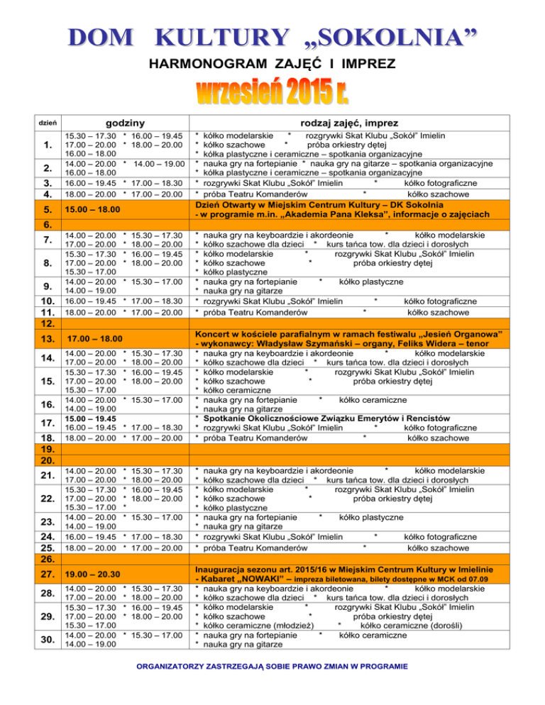 DOM KULTURY „SOKOLNIA” HARMONOGRAM ZAJĘĆ I IMPREZ dzień 3. 4. 15.30 – 17.30 17.00 – 20.00 16.00 – 18.00 14.00 – 20.00 16.00 – 18.00 16.00 – 19.45 18.00 – 20.00 5. 15.00 – 18.00 1. 2. rodzaj zajęć, imprez godziny * 16.00 – 19.45 * 18.00 – 20.00 * 14.00 – 19.00 * 17.00 – 18.30 * 17.00 – 20.00 * kółko modelarskie * rozgrywki Skat Klubu „Sokół” Imielin * kółko szachowe * próba orkiestry dętej * kółka plastyczne i ceramiczne – spotkania organizacyjne * nauka gry na fortepianie * nauka gry na gitarze – spotkania organizacyjne * kółka plastyczne i ceramiczne – spotkania organizacyjne * rozgrywki Skat Klubu „Sokół” Imielin * kółko fotograficzne * próba Teatru Komanderów * kółko szachowe Dzień Otwarty w Miejskim Centrum Kultury – DK Sokolnia - w programie m.in. „Akademia Pana Kleksa”, informacje o zajęciach 6. 7. 8. 9. 10. 11. 12. 13. 14.00 – 20.00 17.00 – 20.00 15.30 – 17.30 17.00 – 20.00 15.30 – 17.00 14.00 – 20.00 14.00 – 19.00 16.00 – 19.45 18.00 – 20.00 * * * * 15.30 – 17.30 18.00 – 20.00 16.00 – 19.45 18.00 – 20.00 * 15.30 – 17.00 * 17.00 – 18.30 * 17.00 – 20.00 17.00 – 18.00 14.00 – 20.00 * 15.30 – 17.30 14. 17.00 – 20.00 * 18.00 – 20.00 15. 16. 17. 18. 19. 20. 15.30 – 17.30 17.00 – 20.00 15.30 – 17.00 14.00 – 20.00 14.00 – 19.00 15.00 – 19.45 16.00 – 19.45 18.00 – 20.00 * 16.00 – 19.45 * 18.00 – 20.00 * 15.30 – 17.00 * 17.00 – 18.30 * 17.00 – 20.00 14.00 – 20.00 * 15.30 – 17.30 21. 17.00 – 20.00 * 18.00 – 20.00 15.30 – 17.30 * 16.00 – 19.45 22. 17.00 – 20.00 * 18.00 – 20.00 23. 24. 25. 26. 15.30 – 17.00 14.00 – 20.00 14.00 – 19.00 16.00 – 19.45 18.00 – 20.00 * * 15.30 – 17.00 * 17.00 – 18.30 * 17.00 – 20.00 27. 19.00 – 20.30 14.00 – 20.00 * 15.30 – 17.30 28. 17.00 – 20.00 * 18.00 – 20.00 29. 30. 15.30 – 17.30 * 16.00 – 19.45 17.00 – 20.00 * 18.00 – 20.00 15.30 – 17.00 14.00 – 20.00 * 15.30 – 17.00 14.00 – 19.00 * * * * * * * * * nauka gry na keyboardzie i akordeonie * kółko modelarskie kółko szachowe dla dzieci * kurs tańca tow. dla dzieci i dorosłych kółko modelarskie * rozgrywki Skat Klubu „Sokół” Imielin kółko szachowe * próba orkiestry dętej kółko plastyczne nauka gry na fortepianie * kółko plastyczne nauka gry na gitarze rozgrywki Skat Klubu „Sokół” Imielin * kółko fotograficzne próba Teatru Komanderów * kółko szachowe Koncert w kościele parafialnym w ramach festiwalu „Jesień Organowa” - wykonawcy: Władysław Szymański – organy, Feliks Widera – tenor * nauka gry na keyboardzie i akordeonie * kółko modelarskie * kółko szachowe dla dzieci * kurs tańca tow. dla dzieci i dorosłych * kółko modelarskie * rozgrywki Skat Klubu „Sokół” Imielin * kółko szachowe * próba orkiestry dętej * kółko ceramiczne * nauka gry na fortepianie * kółko ceramiczne * nauka gry na gitarze * Spotkanie Okolicznościowe Związku Emerytów i Rencistów * rozgrywki Skat Klubu „Sokół” Imielin * kółko fotograficzne * próba Teatru Komanderów * kółko szachowe * * * * * * * * * nauka gry na keyboardzie i akordeonie * kółko modelarskie kółko szachowe dla dzieci * kurs tańca tow. dla dzieci i dorosłych kółko modelarskie * rozgrywki Skat Klubu „Sokół” Imielin kółko szachowe * próba orkiestry dętej kółko plastyczne nauka gry na fortepianie * kółko plastyczne nauka gry na gitarze rozgrywki Skat Klubu „Sokół” Imielin * kółko fotograficzne próba Teatru Komanderów * kółko szachowe Inauguracja sezonu art. 2015/16 w Miejskim Centrum Kultury w Imielinie - Kabaret „NOWAKI” – impreza biletowana, bilety dostępne w MCK od 07.09 * nauka gry na keyboardzie i akordeonie * kółko modelarskie * kółko szachowe dla dzieci * kurs tańca tow. dla dzieci i dorosłych * kółko modelarskie * rozgrywki Skat Klubu „Sokół” Imielin * kółko szachowe * próba orkiestry dętej * kółko ceramiczne (młodzież) * kółko ceramiczne (dorośli) * nauka gry na fortepianie * kółko ceramiczne * nauka gry na gitarze ORGANIZATORZY ZASTRZEGAJĄ SOBIE PRAWO ZMIAN W PROGRAMIE