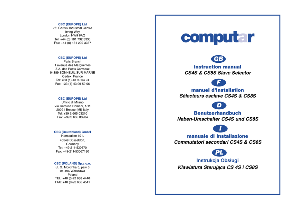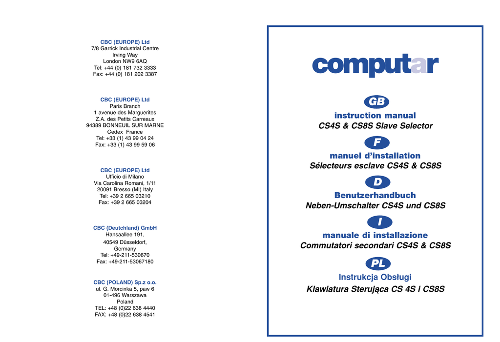 CBC (EUROPE) Ltd 7/8 Garrick Industrial Centre Irving Way London NW9 6AQ Tel: +44 (0) 181 732 3333 Fax: +44 (0) 181 202 3387 CBC (EUROPE) Ltd Paris Branch 1 avenue des Marguerites Z.A. des Petits Carreaux 94389 BONNEUIL SUR MARNE Cedex France Tel: +33 (1) 43 99 04 24 Fax: +33 (1) 43 99 59 06 CBC (EUROPE) Ltd Ufficio di Milano Via Carolina Romani, 1/11 20091 Bresso (MI) Italy Tel: +39 2 665 03210 Fax: +39 2 665 03204 CBC (Deutchland) GmbH Hansaallee 191, 40549 Düsseldorf, Germany Tel: +49-211-530670 Fax: +49-211-53067180 CBC (POLAND) Sp.z o.o. ul. G. Morcinka 5, paw 6 01-496 Warszawa Poland TEL: +48 (0)22 638 4440 FAX: +48 (0)22 638 4541 computar GB instruction manual CS4S & CS8S Slave Selector F manuel d’installation Sélecteurs esclave CS4S & CS8S D Benutzerhandbuch Neben-Umschalter CS4S und CS8S I manuale di installazione Commutatori secondari CS4S & CS8S PL Instrukcja Obs∏ugi Klawiatura Sterujàca CS 4S i CS8S GB p3 Installation Instructions for CS4S & CS8S Slave Selector 5 4 3 6 2 p5 Operating Instructions for the CS4S & CS8S Slave Selector 7 ➚➚ 1 p7 Instructions d’installation pour les sélecteurs esclave CS4S et CS8S p9 Instructions de fonctionnement pour les sélecteurs esclave CS4S & CS8S D p11 Installationsanweisung für die Neben-Umschalter CS4S und CS8S p13 Bedienungsanleitung für die Neben-Umschalter CS4S und CS8S I p15 p17 Istruzioni per l’installazione dei commutatori secondari CS4S & CS8S Instruzioni operative per commutatori secondari CS8S & CS4S PL p19 Instrukcja instalacji dla Klawiatury Sterujàcej CS 4S i CS8S p22 Instrukcja obs∏ugi dla Klawiatury Sterujàcej CS 4S i CS8S 2 CS8S Aby wybraç kamer´ naciÊnij przycisk wyboru kamery. AUTO ➚ F 8 MON ➚ SKIP Aby zmieniç ustawienie sekwencji naciÊnij i przytrzymaj przycisk 'SKIP' a nast´pnie naciÊnij przyciski wyboru kamer. computar Aby sterowaç innym monitorem naciÊnij przycisk 'MON'. Aby rozpoczàç sekwencj´ naciÊnij przycisk 'AUTO'. Je˝eli zapali si´ kontrolka nad przyciskiem wówczas kamera ta zosta∏a w∏àczona do sekwencji. Je˝eli kontrolka zgaÊnie oznacza to ˝e kamera zosta∏a wy∏àczona z sekwencji. Zwolnij przycisk 'Skip' aby powróciç do normalnej pracy. Prosz´ pami´taç ˝e sekwencja musi sk∏adaç si´ minimum z dwóch kamer aby dzia∏a∏a prawid∏owo. Je˝eli spróbujesz w∏àczyç sekwencj´ sk∏adajàcà si´ z mniej ni˝ dwóch kamer, wówczas automatycznie zostanà w∏àczone do sekwencji kamery 1 do 4. Aby sterowaç innym monitorem NaciÊnij przycisk 'MON'. Wtedy dowolna kamera lub wybrana sekwencja zostanà wykonane na tym monitorze. Aby powróciç do poprzedniego monitora naciÊnij ponownie 'MON'. Kiedy ZGAÂNIE kontrolka nad przyciskiem, wtedy sterowany jest MONITOR B, a jeÊli kontrolka si´ PALI - MONITOR A. 23 Instrukcja obs∏ugi dla Klawiatury Sterujàcej CS 16S Uwaga: Skróconà instrukcj´ u˝ytkowania klawiatury mo˝na tak˝e znaleêç na spodzie urzàdzenia. Installation Instructions for CS4S & CS8S Slave Selector 1) IMPORTANT SAFETY INSTRUCTIONS Before commencing with the installation of this equipment read these instructions carefully and act on the information herein. Aby wybraç kamer´ do monitora:PrzyciÊnij przycisk znajdujàcy si´ nad numerem potrzebnej kamery. Zapali si´ kontrolka powy˝ej przycisku wskazujàca, z której kamery jest aktualnie wyÊwietlany obraz na monitorze. Aby wyÊwietliç na monitorze sekwencj´ kamer:NaciÊnij przycisk 'Auto'. Zapali si´ kontrolka powy˝ej przycisku 'Auto' informujàca o uruchomieniu sekwencji i monitor b´dzie pokazywa∏ kolejno obrazy z kamer. Czas w którym b´dzie pokazywany obraz z ka˝dej kamery - dwell time, mo˝e byç regulowany od oko∏o 1 sekundy do 60 sekund za pomocà panelu prze∏àczania typu 'premium'. Pos∏u˝ si´ instrukcjami zawartymi poni˝ej, aby zmieniç bie˝àce ustawienie czasu zatrzymania - dwell time. Never attempt to gain access to the equipment without first disconnecting the power supply to the unit. Consideration should be given as to the correct installation of the unit. The equipment has been designed for indoor use only and must not be installed in any situation where air flow around the unit is restricted, where there are strong heat sources (such as intense direct sunlight, radiators etc.) or in areas of extreme cold. Before siting the unit, ensure that the user can operate the equipment comfortably without causing repetitive strain. Each unit has been designed to minimise the amount of user fatigue that may be caused during normal operation. Never operate the equipment with damp or wet hands. Do not push any objects into openings. Mo˝na tak˝e zmieniç kamery, z których b´dzie pokazywany obraz podczas sekwencji. W poni˝szej sekcji podano sposób w∏àczania lub wy∏àczania kamer z sekwencji. Do not use the equipment whilst drinking or allow the equipment to be used near to areas which may get wet. Spillages invariably cause damage to the unit and may result in personal injury. Aby zatrzymaç sekwencj´ Only use the power supply unit that was supplied with your switcher. Do not use this power supply for any other purpose. Failure to comply may result in damage or serious injury. PrzyciÊnij któryÊ z przycisków wyboru kamery. Niezale˝nie od tego, która kamera zostanie wybrana, na monitorze zostanie pokazany jej obraz i zgaÊnie kontrolka nad przyciskiem 'Auto'. Aby zmieniç bie˝àce ustawienie czasu zatrzymania “Dwell-Time” Ustaw potencjometr na tylnym panelu prze∏àcznika typu 'premium'. Przy najwy˝szym ustawieniu potencjometru dwell-time wyniesie oko∏o 60 sekund, a przy najni˝szym ustawieniu - oko∏o 1 sekundy. Aby w∏àczyç lub wy∏àczyç kamer´ w sekwencji PrzyciÊnij i przytrzymaj przycisk 'Skip'. Zapalà si´ kontrolki nad przyciskami wyboru kamery dla tych kamer które sà aktualnie w∏àczone do sekwencji. Trzymajàc przycisk 'Skip', nale˝y nacisnàç przycisk wyboru kamery, spowoduje to w∏àczenie lub wy∏àcznie k