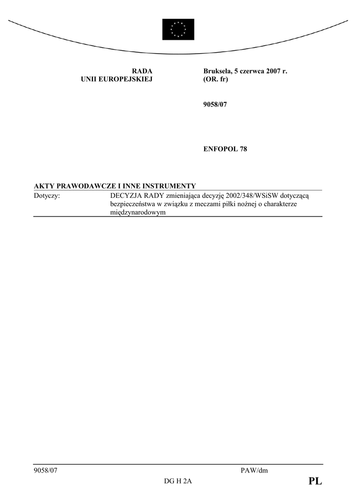 RADA UNII EUROPEJSKIEJ Bruksela, 5 czerwca 2007 r. (OR. fr) 9058/07 ENFOPOL 78 AKTY PRAWODAWCZE I INNE INSTRUMENTY Dotyczy: DECYZJA RADY zmieniająca decyzję 2002/348/WSiSW dotyczącą bezpieczeństwa w związku z meczami piłki nożnej o charakterze międzynarodowym 9058/07 PAW/dm DG H 2A PL DECYZJA RADY 2007/…/WSiSW z dnia zmieniająca decyzję 2002/348/WSiSW dotyczącą bezpieczeństwa w związku z meczami piłki nożnej o charakterze międzynarodowym RADA UNII EUROPEJSKIEJ, uwzględniając Traktat o Unii Europejskiej, w szczególności jego art. 30 ust. 1 lit. a) i b) oraz art. 34 ust. 2 lit. c), uwzględniając inicjatywę Republiki Austrii1, uwzględniając opinię Parlamentu Europejskiego2, 1 2 Dz.U. C 164 z 15.7.2006, str. 30. Opinia z 22 marca 2007 r. (dotychczas nieopublikowana w Dzienniku Urzędowym). 9058/07 PAW/dm DG H 2A 1 PL a także mając na uwadze, co następuje: (1) Celem Unii Europejskiej jest, między innymi, zapewnienie obywatelom wysokiego poziomu bezpieczeństwa w ramach przestrzeni wolności, bezpieczeństwa i sprawiedliwości przez wspólne działanie państw członkowskich w dziedzinie współpracy policyjnej. 25 kwietnia 2002 r. Rada przyjęła decyzję 2002/348/WSiSW3, na mocy której utworzono (2) w każdym z państw członkowskich narodowe punkty informacyjne dla piłki nożnej jako wyznaczone punkty wymiany informacji policyjnych na temat meczów piłki nożnej o charakterze międzynarodowym. Decyzja ta określa zadania realizowane przez każdy z narodowych punktów informacyjnych dla piłki nożnej oraz stosowane przez nie procedury. (3) W świetle doświadczeń ostatnich lat, takich jak mistrzostwa Europy w 2004 r., oraz specjalistycznej oceny międzynarodowej współpracy policyjnej w trakcie tych mistrzostw, a także ogólnej intensywnej współpracy policyjnej w odniesieniu do rozgrywanych w Europie meczów międzynarodowych i klubowych, decyzja 2002/348/WSiSW powinna zostać zmieniona i uaktualniona. W ostatnich latach wciąż rośnie liczba kibiców wyjeżdżających za granicę, aby uczestniczyć w meczach. Konieczne jest więc pogłębienie współpracy właściwych organów oraz zapewnienie profesjonalnej wymiany informacji w celu zapobiegania zakłóceniom porządku publicznego oraz umożliwienia wszystkim państwom członkowskim dokonania skutecznej oceny ryzyka. Proponowane zmiany są wynikiem doświadczeń kilku narodowych punktów informacyjnych zdobytych w ich codziennej pracy i powinny umożliwić im działanie w sposób bardziej uporządkowany i profesjonalny, zapewniając wysokiej jakości wymianę informacji. (4) Zmiany pozostają bez uszczerbku dla obowiązujących przepisów krajowych, w szczególności dla podziału kompetencji między różne organy i służby w danych państwach członkowskich, oraz dla wykonywania przez Komisję jej uprawnień wynikających z Traktatu ustanawiającego Wspólnotę Europejską, 3 Dz.U. L 121 z 8.5.2002, str. 1. 9058/07 PAW/dm DG H 2A 2 PL STANOWI, CO NASTĘPUJE: Artykuł 1 Niniejszym wprowadza się następujące zmiany do decyzji Rady 2002/348/WSiSW: 1) w art. 2 wprowadza się następujące zmiany: a) ust. 2 otrzymuje brzmienie: „2. Narodowe punkty informacyjne dla piłki nożnej, zgodnie z mającymi zastosowanie przepisami krajowymi i międzynarodowymi, mają dostęp do informacji obejmujących dane osobowe kibiców stanowiących ryzyko”. b) dodaje się ust. 6 w brzmieniu: „6. Narodowe punkty informacyjne dla piłki nożnej opracowują i rozpowszechniają wśród innych narodowych punktów informacyjnych regularne ogólne lub tematyczne oceny krajowych zakłóceń porządku związanych z piłką nożną”; 2) w art. 3 wprowadza się następujące zmiany: a) w ust. 3 zdanie pierwsze otrzymuje brzmienie: „3. Dane osobowe mogą być wymieniane zgodnie z mającymi zastosowanie przepisami krajowymi i międzynarodowymi z uwzględnieniem zasad Konwencji Rady Europy nr 108 z dnia 28 stycznia 1981 r. o ochronie osób w związku z automatycznym przetwarzaniem danych osobowych oraz, w odpowiednich przypadkach, zalecenia nr R (87)15 z dnia 17 września 1987 r. Komitetu Ministrów Rady Europy regulującego wykorzystanie danych osobowych w sektorze policji”; 9058/07 PAW/dm DG H 2A 3 PL b) dodaje się ust. 4 w brzmieniu: „4. Wymiana informacji odbywa się przy wykorzystaniu odpowiednich formularzy określonych w dodatku do podręcznika zaleceń w zakresie międzynarodowej współpracy policyjnej oraz w zakresie działań prewencyjnych i kontrolnych związanych z aktami przemocy i zakłóceniami porządku podczas międzynarodowych meczów piłki nożnej, w których uczestniczy co najmniej jedno państwo członkowskie. Narodowe punkty informacyjne zapewniają, że informacje przez nie przekazywane są pełne i zgodne z tymi formularzami”. Artykuł 2 Rada ocenia realizację niniejszej decyzji w terminie do dnia ….* Artykuł 3 Niniejsza decyzja staje się skuteczna następnego dnia po jej opublikowaniu w Dzienniku Urzędowym Unii Europejskiej. Sporządzono w Brukseli, W imieniu Rady Przewodniczący * Trzy lata od daty przyjęcia niniejszej decyzji. 9058/07 PAW/dm DG H 2A 4 PL
