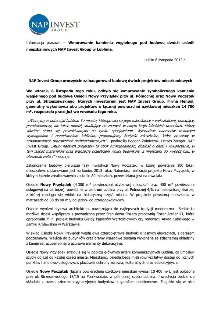 Informacja prasowa – Wmurowanie kamienia węgielnego pod budowę dwóch osiedli mieszkaniowych NAP Invest Group w Lublinie. Lublin 6 listopada 2012 r. NAP Invest Group uroczyście zainaugurował budowę dwóch projektów mieszkaniowych We wtorek, 6 listopada tego roku, odbyło się wmurowanie symbolicznego kamienia węgielnego pod budowę Osiedli Nowy Przylądek przy ul. Północnej oraz Nowy Początek przy ul. Strzeszewskiego, których inwestorem jest NAP Invest Group. Firma Henpol, generalny wykonawca obu projektów o łącznej powierzchni użytkowej mieszkań 14 700 m², rozpoczęła prace już we wrześniu tego roku. „Wierzymy w potencjał Lublina. To miasto, którego siłą są jego mieszkańcy – wykształceni, pracujący, przedsiębiorczy, ale także młodzi, studiujący na znanych w całym kraju lubelskich uczeniach, którzy wkrótce staną się poszukiwanymi na rynku specjalistami. Wychodząc naprzeciw rosnącym wymaganiom i oczekiwaniom lublinian, proponujemy budynki mieszkalne, które powstały w renomowanych pracowniach architektonicznych” – podkreśla Bogdan Żołnierzak, Prezes Zarządu NAP Invest Group. „Atuty naszych projektów to obok funkcjonalności, dbałość o detal i wykończenie, w tym jakość materiałów oraz aranżację przestrzeni wokół budynków, z miejscami do wypoczynku, w otoczeniu zieleni” - dodaje. Zakończenie budowy pierwszej fazy inwestycji Nowy Początek, w której powstanie 100 lokali mieszkalnych, planowane jest na koniec 2013 roku. Natomiast realizacja projektu Nowy Przylądek, w którym łącznie zrealizowanych zostanie 80 mieszkań, przewidziana jest na dwa lata. Osiedle Nowy Przylądek (4 300 m² powierzchni użytkowej mieszkań oraz 400 m² powierzchni usługowej na parterze), powstanie w centrum Lublina przy ul. Północnej 4/6, na malowniczej skarpie, z której rozciąga się widok na historyczną część miasta. W projekcie powstaną mieszkania w metrażach od 38 do 90 m², od jedno- do czteropokojowych. Osiedle wyróżni stylowa architektura, nawiązująca do najlepszych tradycji modernizmu. Będzie to możliwe dzięki współpracy z prowadzoną przez Stanisława Fiszera pracownią Fiszer Atelier 41, która opracowała m.in. projekt budynku Giełdy Papierów Wartościowych czy renowacji Arkad Kubickiego w Zamku Królewskim w Warszawie. W skład Osiedla Nowy Przylądek wejdą dwa czteropiętrowe budynki o jasnych elewacjach, z garażem podziemnym. Wejścia do budynków oraz bramy wjazdowe zostaną wykonane ze szlachetnej okładziny z kamienia, uzupełnionej o ażurowe elementy dekoracyjne. Osiedle Nowy Przylądek znajduje się w pobliżu głównych arterii komunikacyjnych Lublina, co umożliwi szybki dojazd do każdej części miasta. Mieszkańcy osiedla będą mieli również łatwy dostęp do licznych punktów handlowo-usługowych, placówek ochrony zdrowia, kulturalnych oraz edukacyjnych. Osiedle Nowy Początek (łączna powierzchnia użytkowa mieszkań wynosi 10 400 m²), jest położone przy ul. Strzeszewskiego 13/15 na Ponikwodzie, w północnej części Lublina. Inwestycja będzie się składała z trzech czterokondygnacyjnych budynków z garażem podziemnym. Znajdzie się w nich łącznie 180 jasnych i przestronnych mieszkań, z czego ponad połowa zostanie zrealizowana w ramach pierwszej fazy inwestycji. Projekt architektoniczny inwestycji powstał w pracowni SDA Szcześniak – Denier Architekci. Budynki będą posiadały jasne elewacje ozdobione okładziną klinkierową. Wyróżni je dynamiczna kompozycja okien, loggii i balkonów. Architekci zadbali także o atrakcyjne zagospodarowanie przestrzeni wspólnych oraz okolicznych terenów zielonych wraz z elementami małej architektury. Metraż mieszkań wyniesie od 30 do 85 m². W sprzedaży dostępne są lokale jedno-, dwu-, trzy- i czteropokojowe. O NAP Invest Group: Inwestorem i deweloperem Osiedli Nowy Początek i Nowy Przylądek jest NAP Invest Group. Grupa prowadzi działalność inwestycyjną związaną z budownictwem mieszkaniowym i komercyjnym na terenie całego kraju. Najbardziej znane inwestycje firmy to Galeria Rembielińska w Warszawie oraz nowy format centrum handlowego – Centrum Zakupów. W przyszłym roku firma planuje rozpoczęcie realizacji trzech nowych Centrów Zakupów, w tym jednego w Świdniku k/Lublina. Kontakt dla mediów: Agnieszka Podbielska, +48 600 375 516, [email protected], www.napinvest.com.pl Anna Rudnicka-Sipayłło, +48 604 444 724, [email protected]