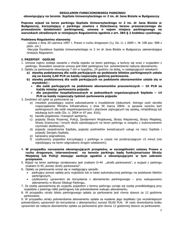 REGULAMIN FUNKCJONIWANIA PARKINGU obowiązujący na terenie Szpitala Uniwersyteckiego nr 2 im. dr Jana Biziela w Bydgoszczy Poprzez wjazd na teren parkingu Szpitala Uniwersyteckiego nr 2 im. dr Jana Biziela w Bydgoszczy, korzystający z parkingu zawiera z Dzierżawcą terenu przeznaczonego do prowadzenia działalności parkingowej, umowę o najem miejsca parkingowego na warunkach określonych w niniejszym Regulaminie zgodnie z art. 384 § 2 kodeksu cywilnego. Podstawę Regulaminu stanowią: -ustawa z dnia 20 czerwca 1997 r. Prawo o ruchu drogowym (t.j. Dz. U. z 2005 r. Nr 108 poz. 908 z późn. zm.) -Decyzja Dyrektora Szpitala Uniwersyteckiego nr 2 im dr Jana Biziela w Bydgoszczy zatwierdzająca niniejszy Regulamin. I. PRZEPISY OGÓLNE 1. Umowa najmu zostaje zawarta z chwilą wjazdu na teren parkingu, a kończy się wraz z wyjazdem z parkingu. Dowodem zawarcia umowy jest bilet parkingowy lub potwierdzenie nabycia abonamentu. 2. Opłaty za parkowanie obowiązują 7 dni w tygodniu, 24 godziny na dobę, w następujących stawkach: a) stawkę podstawową dla osób parkujących na podstawie biletów parkingowych ustala się na kwotę 3,00 PLN za każdą rozpoczętą godzinę parkowania. b) stawkę podstawową dla osób parkujących na podstawie abonamentów ustala się w wysokości : dla osób parkujących na podstawie abonamentów pracowniczych – 10 PLN za każdy miesiąc parkowania pojazdu dla pacjentów hospitalizowanych w jednostkach organizacyjnych Szpitala – 14 PLN za każdy rozpoczęty tydzień parkowania pojazdu 3. Zwolnieni od opłat za parkowanie są : a) inwalidzi posiadający ważne zaświadczenie o inwalidztwie (dokument. którego wzór określa rozporządzenie Ministra Infrastruktury z dnia 30 marca 2004r. w sprawie wzorów kart parkingowych dla osób niepełnosprawnych i placówek zajmujących się opieką, rehabilitacją lub edukacją tych osób (Dz. U. 2004 nr 67 poz. 616); b) karetki pogotowia i transport sanitarny, c) pojazdy Straży Pożarnej, Policji, Żandarmerii Wojskowej, Straży Więziennej, Straży Miejskiej, Straży Granicznej i innych służb wjeżdżających na teren parkingu w związku z wykonywaniem czynności służbowych, d) pojazdy zaopatrzenia Szpitala, pojazdy podmiotów świadczących usługi na rzecz Szpitala i pojazdy Zarządu Szpitala, e) karawany pogrzebowe, f) użytkownicy pojazdów korzystający z parkingu w czasie nie przekraczającym 15 minut (nie wjeżdżający na teren odgrodzony drugim szlabanem). 4. W przypadku naruszenia obowiązujących przepisów, w szczególności ustawy Prawo o ruchu drogowym, interweniować na terenie parkingu będą funkcjonariusze Straży Miejskiej lub Policji stosując sankcje zgodnie z obowiązującymi w tym zakresie przepisami. 5. Wjazd na teren parkingu oznakowany jest znakiem D-44 „strefa parkowania”, a wyjazd z parkingu znakiem D-45 „koniec strefy parkowania”. 6. Opłaty za parkowanie wnosi się w następujący sposób: parkujący ponosi opłatę przy wyjeździe lub w kasie automatycznej parkingu na podstawie biletów parkingowych, użytkownicy uprawnieni do korzystania z abonamentu parkingowego – przy wykupywaniu abonamentu w Biurze Obsługi Parkingu, 7. Za osobę upoważnioną do wyjazdu pojazdem z terenu parkingu uznaje się osobę przedkładającą przy wyjeździe z parkingu bilet parkingowy lub potwierdzenie wykupu abonamentu. 8. W przypadku utraty biletu parkingowego opłata za parkowanie jest równa stawce za 12 godzinne parkowanie. 9. W przypadku utraty potwierdzenia abonamentu opłata za wydanie jego duplikatu (po wcześniejszym potwierdzeniu uprawnień do korzystania z abonamentu) wynosi 50,00 PLN. W razie stwierdzenia braku uprawnień do nabycia abonamentu opłata za parkowanie jest równa 12 godzinnej stawce za parkowanie. 1 10. W przypadku utraty biletu parkingowego/potwierdzenia abonamentu korzystający z parkingu przy wyjeździe zobowiązany jest wykazać się w sposób wiarygodny uprawnieniami do korzystania z pojazdu. Do czasu okazania stosownych uprawnień pojazd nie może opuścić parkingu. 11. Maksymalny czas parkowania na podstawie biletu parkingowego wynosi 2 tygodnie, a na podstawie abonamentu zgodnie z okresem, za który uiszczono opłatę. II. ZASADY KORZYSTANIA Z PARKINGU, KONTROLA PARKOWANIA I OPŁATY DODATKOWE. 1. Teren Szpitala zostaje podzielony na strefy parkingowe według przeznaczenia, i tak: a) parking bezpłatny w okolicach Oddziału Klinicznego Medycyny Ratunkowej służący wyłącznie pacjentom i ich rodzinom, którzy zgłaszają się do Izby Przyjęć Ogólnej, Położniczej lub Urazowej, b) parking odpłatny dla osób nie będących pracownikami Szpitala obejmuje strefę od ul. Ujejskiego do portierni murowanej (szlabanu wewnętrznego) - za wyjątkiem wydzielonych stanowisk służbowych, c) parkingi pracownicze (parkowanie za odpłatnością abonamentową dla pracowników Szpitala) obejmujące strefę od portierni murowanej (szlabanu wewnętrznego) do „Budynku C”, parking za „Budynkiem C”, oraz stanowiska parkingowe na chodnikach przy bloku przychodni, d) parking pracowniczy dla „dyżurnych” obejmuje ogrodzony, wydzielony teren z bramą wjazdową za portiernią murowaną. 2. Na drogach wewnętrznych Szpitala i na parkingach obowiązują przepisy ustawy Prawo o Ruchu Drogowym oraz przepisy niniejszego Regulaminu. 3. Kontrolę w zakresie zgodności parkowania pojazdów z zasadami określonymi w Regulaminie prowadzą upoważnieni pracownicy Dzierżawcy, z którym Szpital zawarł umowę. 4. Korzystający z parkingu zobowiązany jest do parkowania pojazdu wyłącznie na wyznaczonych miejscach postojowych. Zabronione jest parkowanie pojazdów w miejscach oznaczonych jako miejsca przeznaczone do parkowania konkretnych pojazdów lub określonych kategorii pojazdów (np.: stanowiska służbowe, oznaczone numerem rejestracyjnym pojazdu). III. ODPOWIEDZIALNOŚĆ UŻYTKOWANIA PARKINGU. 1. Korzystający z parkingu odpowiada za wszystkie szkody wyrządzone przez