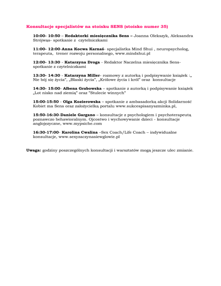 Konsultacje specjalistów na stoisku SENS (stoisko numer 35) 10:00- 10:50 – Redaktorki miesięcznika Sens – Joanna Olekszyk, Aleksandra Strójwąs- spotkanie z czytelniczkami 11:00- 12:00-Anna Kocwa Karnaś- specjalistka Mind Shui , neuropsycholog, terapeuta, trener rozwoju personalnego, www.mindshui.pl 12:00- 13:30 - Katarzyna Droga - Redaktor Naczelna miesięcznika Sensspotkanie z czytelniczkami 13:30- 14:30 - Katarzyna Miller- rozmowy z autorką i podpisywanie książek :„ Nie bój się życia”, „Blaski życia”, „Królowe życia i król” oraz konsultacje 14:30- 15:00- Ałbena Grabowska – spotkanie z autorką i podpisywanie książek „Lot nisko nad ziemią” oraz ”Stulecie winnych” 15:00-15:50 - Olga Kozierowska – spotkanie z ambasadorką akcji Solidarność Kobiet ma Sens oraz założycielką portalu www.sukcespisanyszminka.pl, 15:50-16:30-Daniele Gargano – konsultacje z psychologiem i psychoterapeutą poznawczo behawioralnym. Ojcostwo i wychowywanie dzieci - konsultacje anglojęzyczne, www.mypsiche.com 16:30-17:00- Karolina Cwalina –Sex Coach/Life Coach – indywidualne konsultacje, www.sexyzaczynasiewglowie.pl Uwaga: godziny poszczególnych konsultacji i warsztatów mogą jeszcze ulec zmianie.