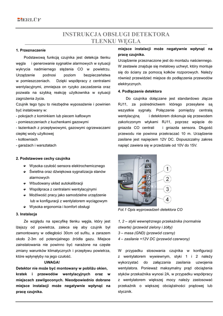 INSTRUKCJA OBSŁUGI DETEKTORA TLENKU WĘGLA miejsce instalacji może negatywnie wpłynąć na 1. Przeznaczenie Podstawową funkcją czujnika jest detekcja tlenku węgla i generowanie sygnałów alarmowych w sytuacji wykrycia nadmiernego Urządzenie stężenia podnosi w pomieszczeniach. CO poziom w powietrzu. bezpieczeństwa Dzięki współpracy z centralami wentylacyjnymi, zmniejsza on ryzyko zaczadzenia oraz pozwala na szybką reakcję użytkownika w sytuacji pracę czujnika. Urządzenie przeznaczone jest do montażu naściennego. W zestawie znajduje się metalowy uchwyt, który montuje się do ściany za pomocą kołków rozporowych. Należy również przewidzieć miejsce do podłączenia przewodów elektrycznych. 4. Podłączenie detektora zagrożenia życia. Do czujnika dołączane jest standardowo złącze Czujnik tego typu to niezbędne wyposażenie i powinien RJ11, być instalowany w: wszystkie - pokojach z kominkiem lub piecem kaflowym wentylacyjną - pomieszczeniach z kuchenkami gazowymi zakończonym - łazienkach z przepływowymi, gazowymi ogrzewaczami gniazda CO centrali ciepłej wody użytkowej przewodu nie powinna przekraczać 10 m. Urządzenie - kotłowniach zasilane jest napięciem 12V DC. Dopuszczalny zakres - garażach i warsztatach napięć zawiera się w przedziale od 10V do 15V. za pośrednictwem sygnały. którego Połączenie przesyłane pomiędzy są centralą i detektorem dokonuje się przewodem wtykami RJ11, poprzez wpięcie do i gniazda sensora. Długość 2. Podstawowe cechy czujnika Wysoka czułość sensora elektrochemicznego Świetlna oraz dźwiękowa sygnalizacja stanów alarmowych Wbudowany układ autokalibracji Współpraca z centralami wentylacyjnymi Możliwość pracy jako samodzielne urządzenie lub w konfiguracji z wentylatorem wyciągowym Wysoka ergonomia i komfort obsługi Fot.1 Opis wyprowadzeń detektora CO 3. Instalacja Ze względu na specyfikę tlenku węgla, który jest 1, 2 – styki wewnętrznego przekaźnika (normalnie lżejszy od powietrza, zaleca się aby czujnik był otwarte) (przewód zielony i żółty) zamontowany w odległości 30cm od sufitu, a zarazem 3 – masa (GND) (przewód czarny) około 2-3m od potencjalnego źródła gazu. Miejsce 4 – zasilanie +12V DC (przewód czerwony) zainstalowania nie powinno być narażone na częste zmiany warunków klimatycznych i przepływu powietrza, W przypadku które wpłynęłyby na jego czułość. z wentylatorem wykorzystać UWAGA! stosowania do czujnika w konfiguracji wywiewnym, styki 1 i 2 należy załączania zasilania uzwojenia Detektor nie może być montowany w pobliżu okien, wentylatora. Ponieważ maksymalny prąd obciążenia kratek w styków przekaźnika wynosi 2A, w przypadku współpracy miejscach zawilgoconych. Nieodpowiednio dobrane z wentylatorem większej mocy należy zastosować miejsce instalacji może negatywnie wpłynąć na przekaźnik o większej obciążalności prądowej lub pracę czujnika. stycznik. i przewodów wentylacyjnych oraz Skrzynki Wpięcia czujnika w obwód wentylatora powinna sterownicze central wentylacyjnych dokonać jedynie uprawniona do tego osoba. posiadają oznaczone gniazdo RJ11 do wpięcia czujnika 5. Opis działania czujnika CO. Układ sterowania centrali automatycznie wykrywa Po podłączeniu detektora i włączeniu napięcia obecność czujnika. zasilania czujnik generuje krótki sygnał dźwiękowy. UWAGA! Dioda LED1 świeci kolorem zielonym, natomiast diody Nie wolno lekceważyć żadnych generowanych przez sygnałów LED2 i LED3 przez okres 1s świecą kolorem czerwonym, alarmowych a następnie zmieniają barwę na zieloną i pulsują co 1s. Po wystąpieniu sytuacji alarmowej należy za każdym W razem sprawdzić źródło wycieku gazu (niesprawny tym czasie czujnik „uzbraja się” i dokonuje autokalibracji. urządzenie. kominek, kuchenka gazowa lub zarzewie pożaru w pomieszczeniu) . PAMIETAJ! Nawet niewielkie stężenie CO w pomieszczeniu może zagrażać zdrowiu i życiu człowieka. Tlenek węgla jest bezbarwny i bezwonny. Jest niebezpieczny szczególnie dla małych dzieci. Jego obecność może wykryć tylko dobry czujnik elektroniczny. 6. Podstawowe parametry techniczne detektora Fot.2 Opis panelu czołowego Napięcie zasilania 12V DC 1. Dioda LED1 – sygnalizacja obecności napięcia Pobór mocy Max. 3W zasilania Poziom alarmowy (CO) >100PPM 2. Dioda LED2 – sygnalizacja cyklicznej samokalibracji Poziom sygnału alarmowego ≥70dB oraz stanów alarmowych Wymiary 115x72x41mm 3. Dioda LED3 - sygnalizacja stanu „uzbrajania” czujnika Temperatura pracy 0÷40 C Czas dozbrajania i autokalibracji trwa od 3 do 5 minut, Wilgotność 10÷95% bez kondensacji w zależności od warunków klimatycznych i ewentualnego Klasa izolacji III miejsca zainstalowania sensora. 7. Zalecenia Po skalibrowaniu czujnika, diody LED1 i LED2 gasną, natomiast urządzenie przechodzi do normalnego trybu pracy. W trybie normalnym dioda LED2 zapala się co 60s na czas 30s. Procesor cyklicznie dokonuje autokalibracji oraz odczytu wartości stężenia CO. Wzrost koncentracji tlenku węgla powyżej 100PPM powoduje zmianę rezystancji wewnętrznego czujnika Ze względu na charakter urządzenia, montaż czujnika powinien być przeprowadzony przez personel techniczny, posiadający odpowiednie uprawnienia. Wloty powietrza do detektora należy utrzymywać w czystości. Raz na 3 miesiące użytkownik powinien dokonać ich stanu alarmowego. Dioda LED2 świeci wówczas kolorem czerwonym, generowany jest głośny sygnał dźwiękowy, a styki przekaźnika pomocniczego zostają zwarte. z czujnikiem polega na tym ,że centrala wentylacyjna reaguje zmianą prędkości obrotowej obu wentylatorów na 60% .Spadek stężenia CO powoduje powrót centrali wentylacyjnej do normalnego trybu pracy. Dioda LED2 wówczas gaśnie i zanika sygnał alarmowy. czyszczenia i przeprowadzić test sprawności sensora. elektrochemicznego, a w konsekwencji wygenerowanie Współpraca Central ( Selen, D