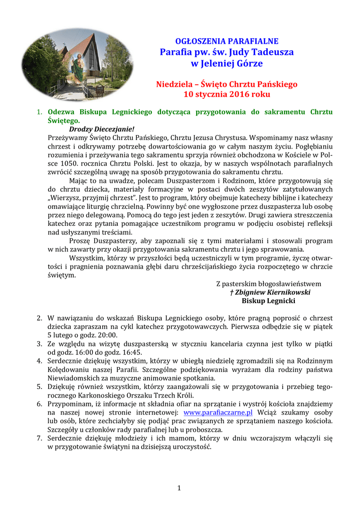 OGŁOSZENIA PARAFIALNE Parafia pw. św. Judy Tadeusza w Jeleniej Górze Niedziela – Święto Chrztu Pańskiego 10 stycznia 2016 roku 1. Odezwa Biskupa Legnickiego dotycząca przygotowania do sakramentu Chrztu Świętego. Drodzy Diecezjanie! Przeżywamy Święto Chrztu Pańskiego, Chrztu Jezusa Chrystusa. Wspominamy nasz własny chrzest i odkrywamy potrzebę dowartościowania go w całym naszym życiu. Pogłębianiu rozumienia i przeżywania tego sakramentu sprzyja również obchodzona w Kościele w Pol-‐ sce 1050. rocznica Chrztu Polski. Jest to okazja, by w naszych wspólnotach parafialnych zwrócić szczególną uwagę na sposób przygotowania do sakramentu chrztu. Mając to na uwadze, polecam Duszpasterzom i Rodzinom, które przygotowują się do chrztu dziecka, materiały formacyjne w postaci dwóch zeszytów zatytułowanych „Wierzysz, przyjmij chrzest”. Jest to program, który obejmuje katechezy biblijne i katechezy omawiające liturgię chrzcielną. Powinny być one wygłoszone przez duszpasterza lub osobę przez niego delegowaną. Pomocą do tego jest jeden z zeszytów. Drugi zawiera streszczenia katechez oraz pytania pomagające uczestnikom programu w podjęciu osobistej refleksji nad usłyszanymi treściami. Proszę Duszpasterzy, aby zapoznali się z tymi materiałami i stosowali program w nich zawarty przy okazji przygotowania sakramentu chrztu i jego sprawowania. Wszystkim, którzy w przyszłości będą uczestniczyli w tym programie, życzę otwar-‐ tości i pragnienia poznawania głębi daru chrześcijańskiego życia rozpoczętego w chrzcie świętym. Z pasterskim błogosławieństwem † Zbigniew Kiernikowski Biskup Legnicki 2. W nawiązaniu do wskazań Biskupa Legnickiego osoby, które pragną poprosić o chrzest dziecka zapraszam na cykl katechez przygotowawczych. Pierwsza odbędzie się w piątek 5 lutego o godz. 20:00. 3. Ze względu na wizytę duszpasterską w styczniu kancelaria czynna jest tylko w piątki od godz. 16:00 do godz. 16:45. 4. Serdecznie dziękuję wszystkim, którzy w ubiegłą niedzielę zgromadzili się na Rodzinnym Kolędowaniu naszej Parafii. Szczególne podziękowania wyrażam dla rodziny państwa Niewiadomskich za muzyczne animowanie spotkania. 5. Dziękuję również wszystkim, którzy zaangażowali się w przygotowania i przebieg tego-‐ rocznego Karkonoskiego Orszaku Trzech Króli. 6. Przypominam, iż informacje nt składnia ofiar na sprzątanie i wystrój kościoła znajdziemy na naszej nowej stronie internetowej: www.parafiaczarne.pl Wciąż szukamy osoby lub osób, które zechciałyby się podjąć prac związanych ze sprzątaniem naszego kościoła. Szczegóły u członków rady parafialnej lub u proboszcza. 7. Serdecznie dziękuję młodzieży i ich mamom, którzy w dniu wczorajszym włączyli się w przygotowanie świątyni na dzisiejszą uroczystość. 1 8. Informuję, iż w przyszłą niedzielę odbędzie się spotkanie opłatkowe dla osób niepełno-‐ sprawnych i ich opiekunów. Msza św. w kościele pw. św. Jana Apostoła i Ewangelisty na Zabobrzu III pod przewodnictwem bpa Marka Mendyka celebrowana będzie o godz. 15:00, a po Eucharystii spotkanie opłatkowe w sali „Arka”. 9. Ksiądz Grzegorz Niwczyk wraz z parafianami zaprasza na bal karnawałowy w Hotelu Gołę-‐ biewski. Zabawa organizowana jest na rzecz budowy kościoła Matki Boskiej Królowej Polski i św. Franciszka z Asyżu. Odbędzie się ona 16 stycznia 2016 r. o godz. 20:00. Koszt od osoby 200 zł. Więcej informacji w parafii przy ul. Morcinka. 10. W przyszłą niedzielę po Mszy św. o godz. 12:30, zapraszam do sali kominkowej na jasełka przygotowane przez Społeczność Publicznego Katolickiego Gimnazjum u św. Pankracego. 11. Za tydzień 3. niedziela miesiąca w związku z powyższym zbieramy tzw. tacę inwestycyjną. Środki te przeznaczone będą na wykonanie kaplicy miłosierdzia wraz z baptysterium. 12. Zachęcam do skorzystania z lektury nowych tygodników katolickich. W tygodniku „Gość Niedzielny”, jako dodatek film pt.: „Faustyna”. Tematyka „Niedzieli” nawiązuje do postaci o. Jana Góry. 13. Z okazji dzisiejszego święta życzę Wam wszystkim życia wielką łaską Chrztu Świętego w naszej codzienności. ks. dr Mariusz Majewski proboszcz 14. Plan wizyty duszpasterskiej: è poniedziałek (11 I) ul. Okrężna od godz. 15:00; nry: 2, 4, 6, 8, 24, 10, 22, 12; od godz. 17:50; nry 38, 40, 42, 44, 46, 48, 50, 58. è wtorek (12 I) è środa (13 I) ul. Okrężna od godz. 15:00; nry: 60, 62, 64, 70, 72, 78, 82, 84; od godz. 17:50; nry: 1, 7, 3, 5, 13, 11, 9, 17, 19, 21, 23, 25, 27, 29, 31, 37, 39, 41. ul. Okrężna od godz. 15:00; nry: 53, 51, 49/1, 49/2, 43; oraz ul. Mała; nry: 19, 21, 23, 25; od godz. 17:50; ul. Mała; nry: 1, 3, 5, 7, 9, 11, 11/1, 13/1, 13 a, 15/1, 15/2, 17; od ok. godz. 20; ul. Podleśna; nry: 2, 4, 6, 10. è czwartek (14 I) ul. Podleśna od godz 15:00; nry: 1, 1a, 5, 7, 12, 14, 16, 18, 20; od godz. 17:50; nry: 22, 24, 26, 28, 30, 32, 34, 36, 38, 40, 42, 44, 46, 48, 50, 52. è piątek (15 I) ul. Podleśna od godz. 15:00; nry: 106, 102, 23, 21, 104; od godz. 17:50; nry: 72, 74, 80, 82, 84, 86, 88, 90, 92, 94, 96, 98, 100, 19. è sobota (16 I) ul. Podleśna od godz. 18:30; nry: 68 a, 68 b, 68 c, 70, 58, 60, 62, 64, 66, 68. è niedziela (17 I) ul. Poziomkowa od godz. 18:00; nry: 2 51, 49 a, 49, 47, 45 a, 45, 43 a, 43, 41 a, 39 a, 39, 37, 35, 35 a.