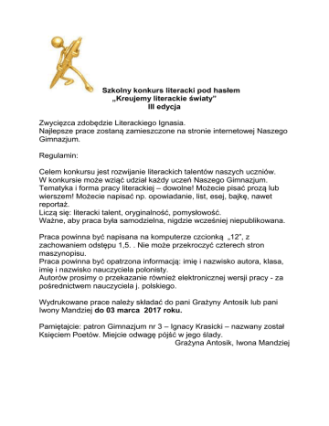 Szkolny konkurs literacki pod hasłem „Kreujemy literackie światy” III edycja Zwycięzca zdobędzie Literackiego Ignasia. Najlepsze prace zostaną zamieszczone na stronie internetowej Naszego Gimnazjum. Regulamin: Celem konkursu jest rozwijanie literackich talentów naszych uczniów. W konkursie może wziąć udział każdy uczeń Naszego Gimnazjum. Tematyka i forma pracy literackiej – dowolne! Możecie pisać prozą lub wierszem! Możecie napisać np. opowiadanie, list, esej, bajkę, nawet reportaż. Liczą się: literacki talent, oryginalność, pomysłowość. Ważne, aby praca była samodzielna, nigdzie wcześniej niepublikowana. Praca powinna być napisana na komputerze czcionką „12”, z zachowaniem odstępu 1,5. . Nie może przekroczyć czterech stron maszynopisu. Praca powinna być opatrzona informacją: imię i nazwisko autora, klasa, imię i nazwisko nauczyciela polonisty. Autorów prosimy o przekazanie również elektronicznej wersji pracy - za pośrednictwem nauczyciela j. polskiego. Wydrukowane prace należy składać do pani Grażyny Antosik lub pani Iwony Mandziej do 03 marca 2017 roku. Pamiętajcie: patron Gimnazjum nr 3 – Ignacy Krasicki – nazwany został Księciem Poetów. Miejcie odwagę pójść w jego ślady. Grażyna Antosik, Iwona Mandziej