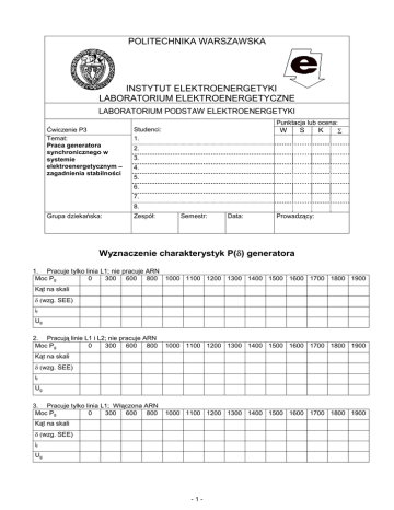 POLITECHNIKA WARSZAWSKA INSTYTUT ELEKTROENERGETYKI LABORATORIUM ELEKTROENERGETYCZNE LABORATORIUM PODSTAW ELEKTROENERGETYKI Punktacja lub ocena: Ćwiczenie P3 Temat: Praca generatora synchronicznego w systemie elektroenergetycznym – zagadnienia stabilności Studenci: 1. W S K Σ 2. 3. 4. 5. 6. 7. 8. Grupa dziekańska: Zespół: Semestr: Data: Prowadzący: Wyznaczenie charakterystyk P(δ δ) generatora 1. Pracuje tylko linia L1; nie pracuje ARN Moc Pg 0 300 600 800 1000 1100 1200 1300 1400 1500 1600 1700 1800 1900 Kąt na skali δ (wzg. SEE) if Ug 2. Pracują linie L1 i L2; nie pracuje ARN Moc Pg 0 300 600 800 1000 1100 1200 1300 1400 1500 1600 1700 1800 1900 Kąt na skali δ (wzg. SEE) if Ug 3. Pracuje tylko linia L1; Włączona ARN Moc Pg 0 300 600 800 1000 1100 1200 1300 1400 1500 1600 1700 1800 1900 Kąt na skali δ (wzg. SEE) if Ug -1- Wpływ małych zaburzeń na pracę generatora Badanie kołysań wirnika 1. Pracują linie L1 i L2. ARN wyłączone. Generator obciąŜony mocą 800W. NaleŜy wyłączyć linię L2 oraz po pewnym czasie załączyć ją do pracy. Zanotować wnioski z obserwacji zjawisk towarzyszących tym operacjom. .......................................................................................................................................................... .......................................................................................................................................................... .......................................................................................................................................................... 2. Pracują linie L1 i L2. ARN wyłączone. Generator obciąŜony mocą 1500W. NaleŜy wyłączyć linię L2 i obserwować zachowanie generatora. Zanotować wnioski z obserwacji zjawisk towarzyszących tym operacjom. .......................................................................................................................................................... .......................................................................................................................................................... .......................................................................................................................................................... 3. Pracują linie L1 i L2. ARN włączone. Generator obciąŜony mocą 1500W. NaleŜy wyłączyć linię L2 i obserwować zachowanie generatora. Zanotować wnioski z obserwacji zjawisk towarzyszących tym operacjom. .......................................................................................................................................................... .......................................................................................................................................................... .......................................................................................................................................................... 4. Pracuje tylko linia L1. ARN wyłączona. Generator obciąŜony mocą 800W. NaleŜy zmieniać w sposób wolny lub szybki tylko moc czynną odbioru lokalnego zasilanego z szyn elektrowni. Zanotować wnioski z obserwacji zjawisk towarzyszących tym operacjom. .......................................................................................................................................................... .......................................................................................................................................................... .......................................................................................................................................................... 5. Pracuje tylko linia L1. ARN wyłączona. Generator obciąŜony mocą 800W. NaleŜy zmieniać w sposób wolny lub szybki tylko moc bierną odbioru lokalnego zasilanego z szyn elektrowni. Zanotować wnioski z obserwacji zjawisk towarzyszących tym operacjom. .......................................................................................................................................................... .......................................................................................................................................................... .......................................................................................................................................................... Wpływ duŜych zaburzeń oraz sposobu ich likwidacji na pracę generatora 1. Pracuje linia L1. Zwarcie trójfazowe przemijające samoistnie. Generator obciąŜony mocą Pg = 700W. ARN wyłączone. Krytyczny czas trwania zwarcia tkr=..................... 2. Pracuje linia L1. Zwarcie jednofazowe przemijające samoistnie. Generator obciąŜony mocą Pg = 700W. ARN wyłączone. Krytyczny czas trwania zwarcia tkr=..................... 3. Pracuje linia L1. Zwarcie trójfazowe przemijające samoistnie. Generator obciąŜony mocą Pg = 700W. ARN wyłączone. Czas trwania zwarcia tzw=0,1s Krytyczny czas SPZ: tkSPZ=..................... 4. Pracują linie L1 i L2. Zwarcie trójfazowe przemijające samoistnie. Generator obciąŜony mocą Pg = 700W. ARN wyłączone. Krytyczny czas trwania zwarcia tkr=..................... 5. Pracuje linia L1. Zwarcie trójfazowe przemijające samoistnie. Generator obciąŜony mocą Pg = 700W. ARN włączone. Krytyczny czas trwania zwarcia tkr=..................... -2-