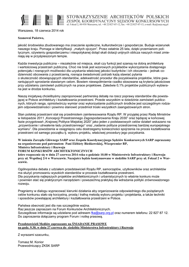 Warszawa, 18 czerwca 2014 rok Szanowni Państwo, jakość środowiska zbudowanego ma znaczenie społeczne, kulturotwórcze i gospodarcze. Buduje wizerunek naszego kraju. Pomaga w identyfikacji „małych ojczyzn”. Przez ostatnie 25 lata, dzięki przemianom politycznym, ożywieniu gospodarczemu i niespotykanej dotąd skali dotacji unijnych oblicza naszych miast zmieniają się w przyśpieszonym tempie. Każda inwestycja publiczna – niezależnie od miejsca, skali czy funkcji jest szansą na dobrą architekturę i wartościową przestrzeń publiczną. Choć nie brak jest wzorowych przykładów wykorzystania dostępnego potencjału i rosnących możliwości dla uzyskania właściwej jakości budynków i ich otoczenia – jednak codzienność obcowania z przestrzenią, rosnąca świadomość potrzeb każą stawiać pytania o skuteczność obowiązujących standardów, adekwatność procedur dla pozyskiwania projektów, które gwarantujących sprostanie stawianym celom. Bowiem niewspółmiernie rzadko stosowane są kryteria jakościowe przy udzielaniu zamówień publicznych na prace projektowe. Zaledwie 0,1% projektów publicznych wybierana jest w drodze konkursu. Naszą inicjatywą chcielibyśmy zaproponować partnerską debatę na rzecz poprawy standardów dla powstającej w Polsce architektury i kształtowania przestrzeni. Przede wszystkim w dziedzinie zamówień publicznych, których ranga, opiniotwórczy wymiar oraz wykorzystanie publicznych środków jest szczególnym rodzajem odpowiedzialności i powinno stanowić przedmiot troski wszystkich zaangażowanych stron. Stan polskiej przestrzeni stał się przedmiotem zainteresowania Rządu RP. W przyjętej przez Radę Ministrów w listopadzie 2011 „Koncepcji Przestrzennego Zagospodarowania Kraju 2030” oraz będącej w końcowej fazie przygotowań „Krajowej Polityce Miejskiej 2020” jako jeden z podstawowych celów działań wskazano na „przywrócenie i utrwalenie ładu przestrzennego” oraz „nadanie polityce przestrzennej bardziej europejskiego wymiaru”. Dla powodzenia w osiągnięciu celu dostrzegamy konieczności spojrzenia na proces kształtowania przestrzeni od samego początku tj. wyboru projektu, właściwej procedury jego pozyskania. W imieniu Zarządu Głównego SARP oraz Zespołu Koordynacyjnego Sędziów Konkursowych SARP zapraszamy na organizowane pod patronatem Pani Elżbiety Bieńkowskiej, Wicepremier RP, Ministra Infrastruktury i Rozwoju FORUM KONKURSÓW ARCHITEKTONICZNYCH które rozpocznie się w dniu 27 czerwca 2014 roku o godzinie 10.00 w Ministerstwie Infrastruktury i Rozwoju przy ul. Wspólnej 2/4 w Warszawie. Nazajutrz będzie kontynuowane w siedzibie SARP przy ul. Foksal 2 w Warszawie. Ogólnopolska debata z udziałem przedstawicieli Rządu RP, samorządów, użytkowników oraz architektów ma służyć promowaniu wysokich standardów w procesie kształtowania przestrzeni. Dla pozyskania najlepszych projektów architektonicznych i urbanistycznych to właśnie konkurs może i powinien stać się praktycznym narzędziem i powszechną praktyką dla wdrażania polityki zrównoważonego rozwoju. Pragniemy w dialogu wypracować kierunki działania aby organizowanie odpowiedniego dla pożądanych celów konkursu stało się korzystną, prostą i trafną metodą wyboru projektu i projektanta, a także techniki i sposobów powstającej architektury i kształtowania przestrzeni w Polsce. Państwa obecność jest dla nas szczególnie ważna. Raz jeszcze zapraszam na Forum Konkursów Architektonicznych. Szczegółowe informacje są udzielane pod adresem [email protected] oraz numerem telefonu: 22 827 87 12. Do zaproszenia dołączamy program Forum i notkę prasową. Przedstawicieli Mediów zapraszamy na ŚNIADANIE PRASOWE na godz. 9.30, w dniu 27 czerwca do siedzibie Ministerstwa Infrastruktury i Rozwoju Z wyrazami szacunku, Tomasz M. Konior Przewodniczący ZKSK SARP