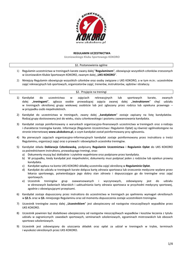 REGULAMIN UCZESTNICTWA Uczniowskiego Klubu Sportowego KOKORO §1. Postanowienia ogólne 1) Regulamin uczestnictwa w treningach karate zwany dalej "Regulaminem", obowiązuje wszystkich członków zrzeszonych w Uczniowskim Klubie Sportowym KOKORO, zwanym dalej „UKS KOKORO”. 2) Niniejszy Regulamin obowiązuje wszystkich członków oraz osoby związane z UKS KOKORO, a w tym m.in.: uczestników zajęć rekreacyjnych lub sportowych, organizatorów zajęć, trenerów, instruktorów, sędziów i działaczy. §2. Przyjęcie na treningi 1) Kandydat do uczestnictwa w zajęciach rekreacyjnych lub sportowych karate, zwanych dalej „treningami”, zgłasza osobie prowadzącej zajęcia zwanej dalej „instruktorem” chęć udziału w treningach określonej grupy wiekowej osobiście lub jest zgłaszany przez rodzica lub opiekuna prawnego – w przypadku osób niepełnoletnich. 2) Kandydat do uczestnictwa w treningach, zwany dalej „kandydatem” zostaje zapisany na listę kandydatów. Rodzaj grupy dostosowany jest do wieku, stażu członkowskiego i poziomu zaawansowania kandydata. 3) Kandydat zostaje poinformowany o warunkach organizacyjno-finansowych uczestnictwa w treningach oraz o rodzaju i charakterze treningów karate. Informacje (Regulamin Uczestnictwa i Regulamin Opłat) są również ogólnodostępne na stronie internetowej www.ukskokoro.pl, o czym kandydat został poinformowany przy zgłoszeniu. 4) Na pierwszych zajęciach organizacyjno-informacyjnych kandydat zostaje poinformowany przez instruktora o treści Regulaminu, organizacji zajęć oraz o prawach i obowiązkach uczestnika treningów. 5) Kandydat składa Deklaracje Członkowską, podpisany Regulamin Uczestnictwa i Regulamin Opłat do UKS KOKORO za pośrednictwem instruktora, prowadzącego treningi, oraz: a) Dokumenty muszą być dokładnie i czytelnie wypełnione oraz podpisane przez kandydata. b) W przypadku, kiedy kandydat jest niepełnoletni, dokumenty musi podpisać jeden z rodziców lub opiekun prawny kandydata. c) Kandydat wpłaca na konto UKS KOKORO składkę uczestnika zajęć określoną w Regulaminie Opłat. d) Kandydat do udziału w treningach karate dołącza kartę zdrowia sportowca lub orzeczenie medyczne wydane przez lekarza sportowego, potwierdzające jego dobry stan zdrowia i dopuszczające go do treningów oraz zajęć sportowych. e) Uczestnik treningów grup zaawansowanych i wyczynowych, zobowiązany jest do udziału w okresowych badaniach lekarskich i uaktualniania karty zdrowia sportowca w przychodni medycyny sportowej, zgodnie z obowiązującymi przepisami. 6) Kandydat zostaje dopuszczony przez instruktora do uczestnictwa w treningach po spełnieniu wymagań określonych w §2.5. oraz w §3. niniejszego Regulaminu oraz od momentu dopuszczenia zostaje uczestnikiem treningów. 7) Uczestnik treningów zwany dalej „Uczestnikiem” jest ubezpieczony od następstw nieszczęśliwych wypadków przez UKS KOKORO. 8) Uczestnik powinien być dodatkowo ubezpieczony od następstw nieszczęśliwych wypadków i kosztów leczenia z tytułu udziału w zagranicznych: zawodach sportowych, seminariach szkoleniowych, egzaminach mistrzowskich lub obozach sportowo szkoleniowych. 9) Uczestnik jest zobowiązany do uiszczania składek oraz opłat za udział w treningach w trybie, terminach i wysokości określonych przez UKS KOKORO. 1/4 10) Uczestnik zajęć UKS KOKORO włączony zostaje do życia społecznego Klubu, w ramach którego uczestniczy w: a) akcjach promujących zdrowie, kulturę fizyczną i aktywność ruchową; b) akcje promocyjne np. pokazy, plakaty, ulotki, strona www, profil Facebook, zawody, obozy, wyjazdy Klubu itp. 11) Uczestnictwo w aktywnościach opisanych w §2. pkt. 10 a i b, jest dobrowolne i uczestnik może odmówić w nich udziału. 12) Publikacja materiałów związanych z relacją z aktywnościach opisanych w §2. pkt. 10 a i b, w których Uczestnik brał udział, nie wymaga zgody Uczestnika. § 2. Strój treningowy i ochraniacze 1) Uczestnik treningów grup początkujących, zobowiązany jest do posiadania czystego i schludnego sportowego stroju (dres, spodenki, podkoszulek bawełniany lub karate-GI), klapek, ręcznika i osobistych środków czystości. 2) Uczestnik treningów grup średniozaawansowanych, zaawansowanych lub wyczynowych, zobowiązany jest do posiadania czystego i kompletnego stroju do ćwiczeń karate-GI, klapek, ręcznika i osobistych środków czystości oraz zobowiązany jest do zaopatrzenia się w komplet osobistych ochraniaczy oraz ich posiadania i używania w czasie treningów. 3) Na Karate-Gi mogą być naszyte tylko emblematy i znaki graficzne Karate Shinkyokushin wymagane i dopuszczane przez UKS KOKORO. Wszelkie inne znaki są niedozwolone. 4) Uczestnikowi zajęć wolno nosić pas obi zgodny ze stopniem reprezentującego World Karate Organization Shinkyokushinkai (WKO). 5) Noszenie na treningu biżuterii i ozdób jest zabronione ze względów bezpieczeństwa. nadanym przez Szefa Regionalnego § 4. Warunki udziału w ćwiczeniach 1) Każdy uczestnik treningów dobrowolnie bierze udział w ćwiczeniach, a wszelkie problemy lub chwilowe niedyspozycje ma obowiązek zgłosić instruktorowi. 2) Każdy uczestnik zobowiązany jest do znajomości i przestrzegania zasad bezpieczeństwa, oraz zasad związanych z prowadzeniem ćwiczeń indywidualnych, z partnerem oraz grupowych i jest świadom wynikającego z nich ryzyka. 3) W przypadku złego samopoczucia, odniesienia urazu, kontuzji uczestnik treningu powinien natychmiast zgłosić się do instruktora i poinformować go o swojej dolegliwości. Instruktor ma obowiązek udzielić pierwszej pomocy uczestnikowi zgodnie z obowiązującymi przepisami. 4) W przypadku długotrwałych dolegliwości, odczuwanych po wyjściu z treningu, jego uczestnik powinien pilnie zgłosić się do lekarza oraz poinformować o tym fakcie instruktora. 5) Instruktorzy odpowiadają za bezpieczeństwo dzieci trenujących na sali gimnastycznej tylko od momentu rozpocz