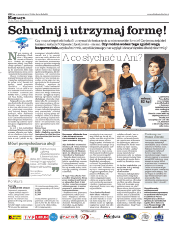 a- VIII | 14–16 sierpnia 2009 | Polska Kurier Lubelski www.polskakurierlubelski.pl Magazyn Schudnij zKurierem Schudnij i utrzymaj formę! Czy można kogoś odchudzić i utrzymać do końca życia w mistrzowskiej formie? Czy jest na to jakieś tajemne zaklęcie? Odpowiedź jest prosta – nie ma. Czy można wobec tego zgubić wagę bezpowrotnie, uzyskać zdrowie, satysfakcjonujący nas wygląd i cieszyć się nimi dłużej niż chwilę? N asz program odchudzający Chudniesz – Wygrywasz zdrowie to filozofia życia. Edukuje, jak osiągnąć wymarzoną formę. Uczy właściwego żywienia i przekonuje do zmiany stylu życia, zachęcając do aktywności, która staje się lekarstwem na stresy, nerwy i monotonię życia codziennego. Chcesz zredukować wagę, poprawić kondycję zdrowotną i cieszyć się wyśmienitą formą do końca życia? Zacznij żyć według zasad programu Chudniesz – Wygrywasz zdrowie. Takich osób w naszych centrach odchudzania w Lublinie i Zamościu jest bardzo wiele, a jedną z nich jest Ania Całka, bohaterka dzisiejszej strony. Anią zachwyca się cała Polska, ale nie tylko. Jej niezwykła historia znana jest również w Ameryce, a Joe Antouri, prezes prestiżowej amerykańskiej federacji Propta, która gromadzi wielu wybitnych specjalistów żywieniowych, m.in. Charlesa Glassa (odchudza wiele gwiazd Hollywood), nie może się nadziwić wynikom, jakie osiągnęliśmy pracując z Anią. Co jest w tym najbardziej unikalnego? Przede wszystkim poprawa zdrowia oraz badanie metabolizmu, który uległ znacznemu przyśpieszeniu. Ania straciła ponad 80 kg, a suma masy jej mięśni szkieletowych jest 2 kg powyżej normy wg analizy składu ciała. Co to oznacza, jakie ma znaczenie? Zasadnicze, ponieważ wykazuje, że zgubione 80 kg wagi to redukcja tkanki tłuszczowej, a nie mięśni. Pamiętajcie, nie należy cieszyć się z każdego zgubionego kilograma. Źle zbilansowana lub niewłaściwa dieta, np. owocowo-warzywna, zbyt intensywne treningi, powodują utratę wagi, ale z waszych mięśni. Co to oznacza? Chudniesz i wpędzasz się w otyłość. Tracisz chwilowo kilogramy i spowalniasz swój metabolizm. Profesjonalizm w odchudzaniu polega na redukcji tłuszczu i pielęgnacji mięśni, które są ogromnym skarbem dla każdego człowieka w każdym wieku. To one między innymi odpowiadają za siłę naszego metabolizmu. Tylko takie odchudzanie jest zdrowe i trwałe. Schudnij i przyśpiesz swój metabolizm, schudnij i uzyskaj piękną jędrną sylwetkę bez efektu jo-jo. Pamiętaj też, że tracąc mięśnie stracisz zdrowie i będziesz flaczek, bez sił i bez sprężystości ciała, za to z gwarantowanym efektem jo-jo. Konrad Gaca prezes Stowarzyszenia do Walki z Otyłością, specjalista żywieniowyCertifiedNutrition ConsultantiCertifiedNutrition Specialist Mówi pomysłodawca akcji ’’ Odchudzaj się z głową. Źle zbilansowana lub niewłaściwa dieta,zbyt intensywne treningi,mogą wpędzić Cię w...otyłość i poważne kłopoty zdrowotne. Konrad Gaca, specjalista żywieniowy CNC i CNS Konkurs Nagrody o wartości 500 złotych Odpowiedz poprawnie i wygraj jedną z nagród – masaż całego ciała (norelowski), masaż brzucha, karnet na solarium oraz godzinny trening pod opieką trenera. Ile kalorii spali osoba ważąca 70 kilogramów podczas ’’ 30-minutowego biegu (kilometr pokonywany w 6,5 min)? A. 150 B. 229 C. 347 Osoby, które o godzinie 12 jpierwsze zadzwonią do nas pod numer tel. 81 469-15-02 z poprawną odpowiedzią, otrzymają nagrody. A co słychać u Ani? Lublinianka Anna Całka uczestnicząc w akcji Schudnij z Kurierem zyskała zdrowie oraz atrakcyjną sylwetkę. Straciła z nami aż 82 kg zbędnego tłuszczu. Dzisiaj jest szczuplejsza w talii o 61 cm, biodrach o 62 cm niż półtora roku temu. minus 82 kg! Tak Anna Całka wyglądała, gdy po raz pierwszy przyszła do Centrum Odchudzania KM Magnum Sport, a tak wygląda dzisiaj Rozmowa z lublinianką Anną Całką, która w Centrum Odchudzania KM Magnum Sport schudła aż 82 kg. Mija dokładnie osiemnaście miesięcy, jak po raz pierwszy przyszła Pani do Centrum Odchudzania KM Magnum Sport. Co od tamtego czasu zmieniło się w Pani życiu? - Wszystko. Praktycznie rozpoczęłam nowe życie. To tak, jakbym narodziła się na nowo. Z zakompleksionej, bardzo grubej dziewczyny przemieniłam się w osobę pewną siebie, tryskającą radością, humorem i zdrowiem. W ciągu roku schudła Pani ponad 80 kilogramów. Teraz, przez kolejnych sześć miesięcy udowadnia Pani, że jak się chce, to można utrzymać zakładaną wagę, że można pracować z powodzeniem nad swoim ciałem... - Dzięki trenerowi głównemu, pomysłodawcy akcji Chudniesz - Wygrywasz zdrowie Konradowi Gacy udało mi się schudnąć tyle kilogramów, ile chciałam. Nie ukrywam, że obawiałam się, jak będzie wyglądało moje życie po osiągnięciu wymarzonej wagi. Bałam się, że tak, jak szybko straciłam zbędne kilogramy, tak równie szybko mogę je zyskać. Wcześniej kilkakrotnie zrzucałam po 10-15 kilogramów, ale później szybko przybierałam 20-30 kg. Teraz nie było o tym mowy. Odchudzanie to złożony proces. Nie wystarczy zgubić tłuszcz, trzeba jeszcze wiedzieć, jak dalej sobie radzić. Dzięki akcji prowadzonej na łamach Kuriera Lubelskiego, trenerowi Gacy już wiem, co trzeba robić. Polubiłam ten styl życia. Trening cztery razy w tygodniu sprawia mi przyjemność. Do braku soli i cukru też można się z łatwością przyzwyczaić, a dieta nie sprawia mi żadnych problemów, ponieważ z każdym tygodniem mam włączanych do niej coraz więcej produktów. Co na Pani odchudzanie mówi lekarz rodzinny? - Jest zaskoczony, że mam aż tak dobre wyniki, że utrata tak dużej masy ciała w tak krótkim czasie, nie wpłynęła negatywnie na mój stan zdrowia,a wręcz odwrotnie ja PATRONI AKCJI zyskałam zdrowie. Jeszcze nigdy nie czułam się tak dobrze, zarówno fizycznie, jak i psychicznie. Ćwiczenia nie sprawiaj