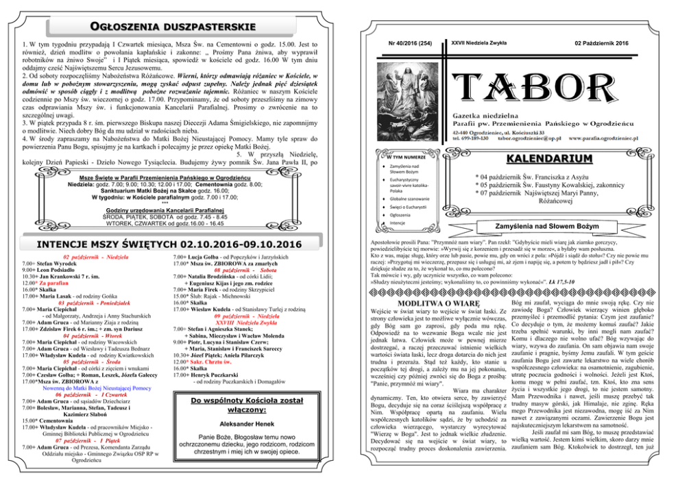 OGŁOSZENIA DUSZPASTERSKIE 1. W tym tygodniu przypadają I Czwartek miesiąca, Msza w. na Cementowni o godz. 15.00. Jest to również, dzień modlitw o powołania kapłańskie i zakonneŚ „ Pro my Pana żniwa, aby wyprawił robotników na żniwo Swoje” i I Piątek miesiąca, spowiedź w ko ciele od godz. 16.00 W tym dniu oddajmy cze ć Naj więtszemu Sercu Jezusowemu. 2. Od soboty rozpoczęli my Nabożeństwa Różańcowe. Wierni, którzy odmawiają różaniec w Ko ciele, w domu lub w pobożnym stowarzyszeniu, mogą zyskać odpust zupełny. Należy jednak pięć dziesiątek odmówić w sposób ciągły i z modlitwą pobożne rozważanie tajemnic. Różaniec w naszym Ko ciele codziennie po Mszy w. wieczornej o godz. 17.00. Przypominamy, że od soboty przeszli my na zimowy czas odprawiania Mszy w. i funkcjonowania Kancelarii Parafialnej. Prosimy o zwrócenie na to szczególnej uwagi. 3. W piątek przypada 8 r. m. pierwszego Biskupa naszej Diecezji Adama migielskiego, nie zapomnijmy o modlitwie. Niech dobry Bóg da mu udział w rado ciach nieba. 4. W rody zapraszamy na Nabożeństwa do Matki Bożej Nieustającej Pomocy. Mamy tyle spraw do powierzenia Panu Bogu, spisujmy je na kartkach i polecajmy je przez opiekę Matki Bożej. 5. W przyszłą Niedzielę, kolejny Dzień Papieski - Dzieło Nowego Tysiąclecia. Budujemy żywy pomnik w. Jana Pawła II, po Msze więte w Parafii Przemienienia Pańskiego w Ogrodzieńcu NiedzielaŚ godz. 7.00ś 9.00ś 10.30ś 12.00 i 17.00ś Cementownia godz. 8.00ś Sanktuarium Matki Bożej na Skałce godz. 16.00ś W tygodniuŚ w Ko ciele parafialnym godz. 7.00 i 17.00ś *** Godziny urzędowania Kancelarii Parafialnej RODA, PI TEK, SOBOTA od godz. 7.45 - 8.45 WTOREK, CZWARTEK od godz.16.00 - 16.45 INTENCJE MSZY WIĘTYCH 02.10.2016-09.10.2016 02 październik - Niedziela 7.00+ Stefan Wyrodek 9.00+ Leon Podsiadło 10.30+ Jan Krankowski 7 r. śm. 12.00* Za parafian 16.00* Skałka 17.00+ Maria Lasak - od rodziny Gońka 03 październik - Poniedziałek 7.00+ Maria Ciepichał - od Małgorzaty, Andrzeja i Anny Stachurskich 7.00+ Adam Gruca - od Marianny Ziaja z rodziną 17.00+ Zdzisław Firek 6 r. śm.; + zm. syn Dariusz 04 październik - Wtorek 7.00+ Maria Ciepichał - od rodziny Wacowskich 7.00+ Adam Gruca - od Wiesławy i Tadeusza Bednarz 17.00+ Władysław Kudela - od rodziny Kwiatkowskich 05 październik - roda 7.00+ Maria Ciepichał - od córki z zięciem i wnukami 7.00+ Czesław Golba; + Roman, Leszek, Józefa Gałeccy 17.00*Msza św. ZBIOROWA z Nowenną do Matki Bożej Nieustającej Pomocy 06 październik - I Czwartek 7.00+ Adam Gruca - od sąsiadów Dziechciarz 7.00+ Bolesław, Marianna, Stefan, Tadeusz i Kazimierz Słaboń 15.00* Cementownia 17.00+ Władysław Kudela - od pracowników Miejsko Gminnej Biblioteki Publicznej w Ogrodzieńcu 07 październik - I Piątek 7.00+ Adam Gruca - od Prezesa, Komendanta Zarządu Oddziału miejsko - Gminnego Związku OSP RP w Ogrodzieńcu 7.00+ Lucja Golba - od Popczyków i Jarzyńskich 17.00* Msza św. ZBIOROWA za zmarłych 08 październik - Sobota 7.00+ Natalia Brodzińska - od córki Lidiiś + Eugeniusz Kijas i jego zm. rodzice 7.00+ Maria Firek - od rodziny Skrzypiciel 15.00* lubŚ Rajak - Michnowski 16.00* Skałka 17.00+ Wiesław Kudela - od Stanisławy Turlej z rodziną 09 październik - Niedziela XXVIII Niedziela Zwykła 7.00+ Stefan i Agnieszka Stanek; + Sabina, Mieczysław i Wacław Molenda 9.00+ Piotr, Lucyna i Stanisław Czerw; + Maria, Stanisław i Franciszek Sareccy 10.30+ Józef Piątek; Aniela Pilarczyk 12.00* Sakr. Chrztu św. 16.00* Skałka 17.00+ Henryk Puczkarski - od rodziny Puczkarskich i Domagałów Do wspólnoty Ko cioła został włączonyŚ Aleksander Henek Panie Boże, Błogosław temu nowo ochrzczonemu dziecku, jego rodzicom, rodzicom chrzestnym i miej ich w swojej opiece. Nr 40/2016 (254) XXVII Niedziela Zwykła W tym numerze Za yśle ia ad Sło e Boży Eu harysty z y sa oir- i re katolikaPolaka Glo al e sza o a ie Ś ię i o Eu harysii Ogłosze ia I te je 02 Październik 2016 KALENDARIUM * 04 październik w. Franciszka z Asyżu * 05 październik w. Faustyny Kowalskiej, zakonnicy * 07 październik Naj więtszej Maryi Panny, Różańcowej Zamy lenia nad Słowem Bożym Apostołowie prosili PanaŚ ”Przymnóż nam wiary”. Pan rzekłŚ ”Gdyby cie mieli wiarę jak ziarnko gorczycy, powiedzieliby cie tej morwieŚ »Wyrwij się z korzeniem i przesadź się w morze«, a byłaby wam posłuszna. Kto z was, mając sługę, który orze lub pasie, powie mu, gdy on wróci z polaŚ »Pójdź i siądź do stołu«? Czy nie powie mu raczejŚ »Przygotuj mi wieczerzę, przepasz się i usługuj mi, aż zjem i napiję się, a potem ty będziesz jadł i pił«? Czy dziękuje słudze za to, że wykonał to, co mu polecono? Tak mówcie i wy, gdy uczynicie wszystko, co wam poleconoŚ »Słudzy nieużyteczni jeste myś wykonali my to, co powinni my wykonać«”. Łk 17,5-10 MODLITWA O WIAR Wej cie w wiat wiary to wej cie w wiat łaski. Ze strony człowieka jest to możliwe wyłącznie wówczas, gdy Bóg sam go zaprosi, gdy poda mu rękę. Odpowiedź na to wezwanie Boga wcale nie jest jednak łatwa. Człowiek może w pewnej mierze dostrzegać, a raczej przeczuwać istnienie wielkich warto ci wiata łaski, lecz droga dotarcia do nich jest trudna i przeraża. Stąd też każdy, kto stanie u początków tej drogi, a zależy mu na jej pokonaniu, wcze niej czy później zwróci się do Boga z pro bąŚ "Panie, przymnóż mi wiary". Wiara ma charakter dynamiczny. Ten, kto otwiera serce, by zawierzyć Bogu, decyduje się na coraz ci lejszą współpracę z Nim. Współpracę opartą na zaufaniu. Wielu współczesnych katolików sądzi, że by uchodzić za człowieka wierzącego, wystarczy wyrecytować "Wierzę w Boga". Jest to jednak wielkie złudzenie. Decydować się na wej cie w wiat wiary, to rozpocząć trudny proces doskonalenia zawierzenia. Bóg mi zaufał, wyciąga do mnie swoją rękę. Czy nie zawiodę Boga? Człow