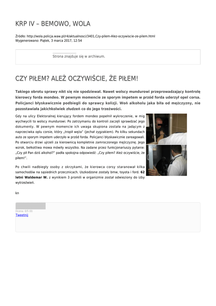 KRP IV – BEMOWO, WOLA Źródło: http://wola.policja.waw.pl/r4/aktualnosci/3401,Czy-pilem-Alez-oczywiscie-ze-pilem.html Wygenerowano: Piątek, 3 marca 2017, 12:54 Strona znajduje się w archiwum. CZY PIŁEM? ALEŻ OCZYWIŚCIE, ŻE PIŁEM! Takiego obrotu sprawy nikt się nie spodziewał. Nawet wolscy mundurowi przeprowadzający kontrolę kierowcy forda mondeo. W pewnym momencie ze sporym impetem w przód forda uderzył opel corsa. Policjanci błyskawicznie podbiegli do sprawcy kolizji. Woń alkoholu jaka biła od mężczyzny, nie pozostawiała jakichkolwiek złudzeń co do jego trzeźwości. Gdy na ulicy Elektoralnej kierujący fordem mondeo popełnił wykroczenie, w mig wychwycili to wolscy mundurowi. Po zatrzymaniu do kontroli zaczęli sprawdzać jego dokumenty. W pewnym momencie ich uwaga skupiona została na jadącym z naprzeciwka oplu corsie, który „tropił węża” (jechał zygzakiem). Po kilku sekundach auto ze sporym impetem uderzyło w przód forda. Policjanci błyskawicznie zareagowali. Po otwarciu drzwi ujrzeli za kierownicą kompletnie zamroczonego mężczyznę. Jego wzrok, bełkotliwa mowa mówiły wszystko. Na zadane przez funkcjonariuszy pytanie: „Czy pił Pan dziś alkohol?” padła spokojna odpowiedź: „Czy piłem? Ależ oczywiście, że piłem!”. Po chwili nadbiegły osoby z okrzykami, że kierowca corsy staranował kilka samochodów na sąsiednich przecznicach. Uszkodzone zostały bmw, toyota i ford. 62 letni Waldemar W. z wynikiem 3 promili w organizmie został odwieziony do izby wytrzeźwień. kn Ocena: 0/5 (0) Tweetnij