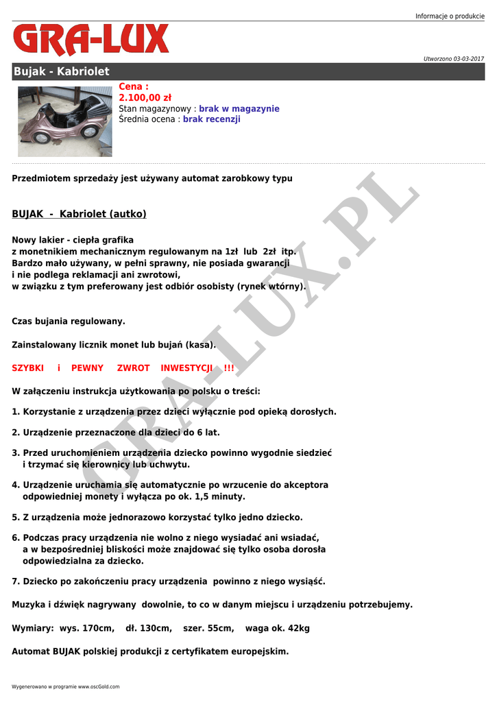 Informacje o produkcie Utworzono 03-03-2017 Bujak - Kabriolet Cena : 2.100,00 zł Stan magazynowy : brak w magazynie Średnia ocena : brak recenzji PL Przedmiotem sprzedaży jest używany automat zarobkowy typu BUJAK - Kabriolet (autko) Czas bujania regulowany. LU X. Nowy lakier - ciepła grafika z monetnikiem mechanicznym regulowanym na 1zł lub 2zł itp. Bardzo mało używany, w pełni sprawny, nie posiada gwarancji i nie podlega reklamacji ani zwrotowi, w związku z tym preferowany jest odbiór osobisty (rynek wtórny). Zainstalowany licznik monet lub bujań (kasa). i PEWNY ZWROT INWESTYCJI !!! A- SZYBKI W załączeniu instrukcja użytkowania po polsku o treści: 1. Korzystanie z urządzenia przez dzieci wyłącznie pod opieką dorosłych. R 2. Urządzenie przeznaczone dla dzieci do 6 lat. G 3. Przed uruchomieniem urządzenia dziecko powinno wygodnie siedzieć i trzymać się kierownicy lub uchwytu. 4. Urządzenie uruchamia się automatycznie po wrzucenie do akceptora odpowiedniej monety i wyłącza po ok. 1,5 minuty. 5. Z urządzenia może jednorazowo korzystać tylko jedno dziecko. 6. Podczas pracy urządzenia nie wolno z niego wysiadać ani wsiadać, a w bezpośredniej bliskości może znajdować się tylko osoba dorosła odpowiedzialna za dziecko. 7. Dziecko po zakończeniu pracy urządzenia powinno z niego wysiąść. Muzyka i dźwięk nagrywany dowolnie, to co w danym miejscu i urządzeniu potrzebujemy. Wymiary: wys. 170cm, dł. 130cm, szer. 55cm, waga ok. 42kg Automat BUJAK polskiej produkcji z certyfikatem europejskim. Wygenerowano w programie www.oscGold.com Koszty ewentualnej wysyłki lub dowozu do uzgodnienia. W ofercie posiadamy inne bujaki mniej lub bardziej luksusowe, wiele luźnych figurek typu: Ufo – klon, Klown, Dinosaur, Osiołek, Duży motor. G R A- LU X. PL UWAGA! 15% rabatu przy zakupie min. 5 sztuk.
