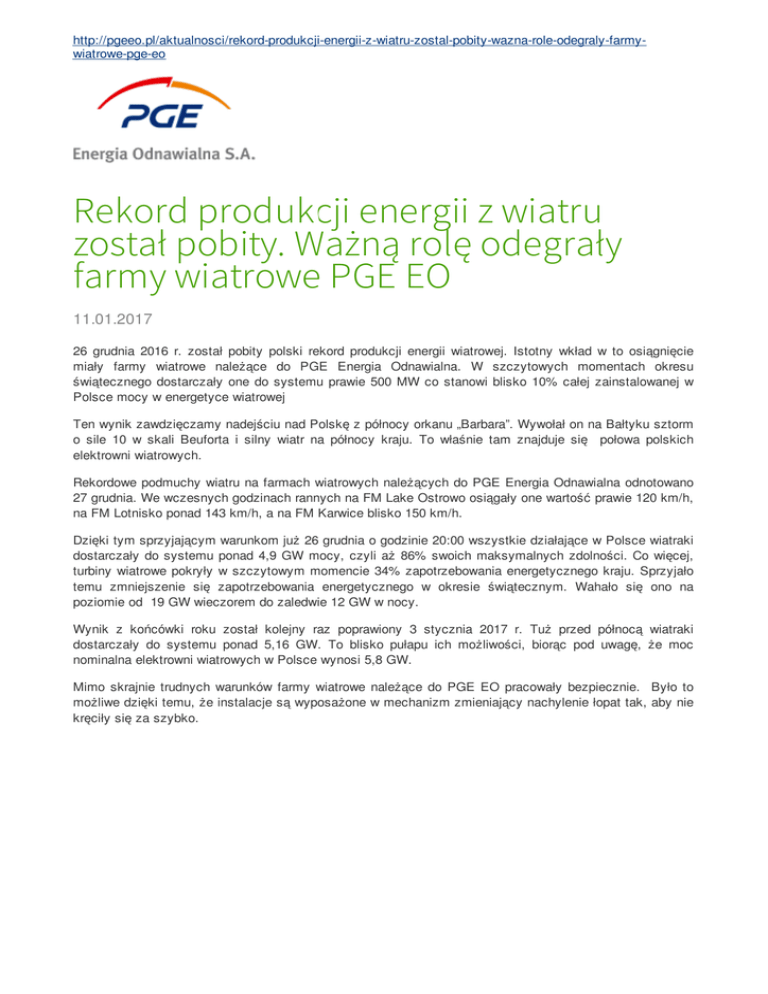 http://pgeeo.pl/aktualnosci/rekord-produkcji-energii-z-wiatru-zostal-pobity-wazna-role-odegraly-farmywiatrowe-pge-eo Rekord produkcji energii z wiatru został pobity. Ważną rolę odegrały farmy wiatrowe PGE EO 11.01.2017 26 grudnia 2016 r. został pobity polski rekord produkcji energii wiatrowej. Istotny wkład w to osiągnięcie miały farmy wiatrowe należące do PGE Energia Odnawialna. W szczytowych momentach okresu świątecznego dostarczały one do systemu prawie 500 MW co stanowi blisko 10% całej zainstalowanej w Polsce mocy w energetyce wiatrowej Ten wynik zawdzięczamy nadejściu nad Polskę z północy orkanu „Barbara”. Wywołał on na Bałtyku sztorm o sile 10 w skali Beuforta i silny wiatr na północy kraju. To właśnie tam znajduje się połowa polskich elektrowni wiatrowych. Rekordowe podmuchy wiatru na farmach wiatrowych należących do PGE Energia Odnawialna odnotowano 27 grudnia. We wczesnych godzinach rannych na FM Lake Ostrowo osiągały one wartość prawie 120 km/h, na FM Lotnisko ponad 143 km/h, a na FM Karwice blisko 150 km/h. Dzięki tym sprzyjającym warunkom już 26 grudnia o godzinie 20:00 wszystkie działające w Polsce wiatraki dostarczały do systemu ponad 4,9 GW mocy, czyli aż 86% swoich maksymalnych zdolności. Co więcej, turbiny wiatrowe pokryły w szczytowym momencie 34% zapotrzebowania energetycznego kraju. Sprzyjało temu zmniejszenie się zapotrzebowania energetycznego w okresie świątecznym. Wahało się ono na poziomie od 19 GW wieczorem do zaledwie 12 GW w nocy. Wynik z końcówki roku został kolejny raz poprawiony 3 stycznia 2017 r. Tuż przed północą wiatraki dostarczały do systemu ponad 5,16 GW. To blisko pułapu ich możliwości, biorąc pod uwagę, że moc nominalna elektrowni wiatrowych w Polsce wynosi 5,8 GW. Mimo skrajnie trudnych warunków farmy wiatrowe należące do PGE EO pracowały bezpiecznie. Było to możliwe dzięki temu, że instalacje są wyposażone w mechanizm zmieniający nachylenie łopat tak, aby nie kręciły się za szybko.