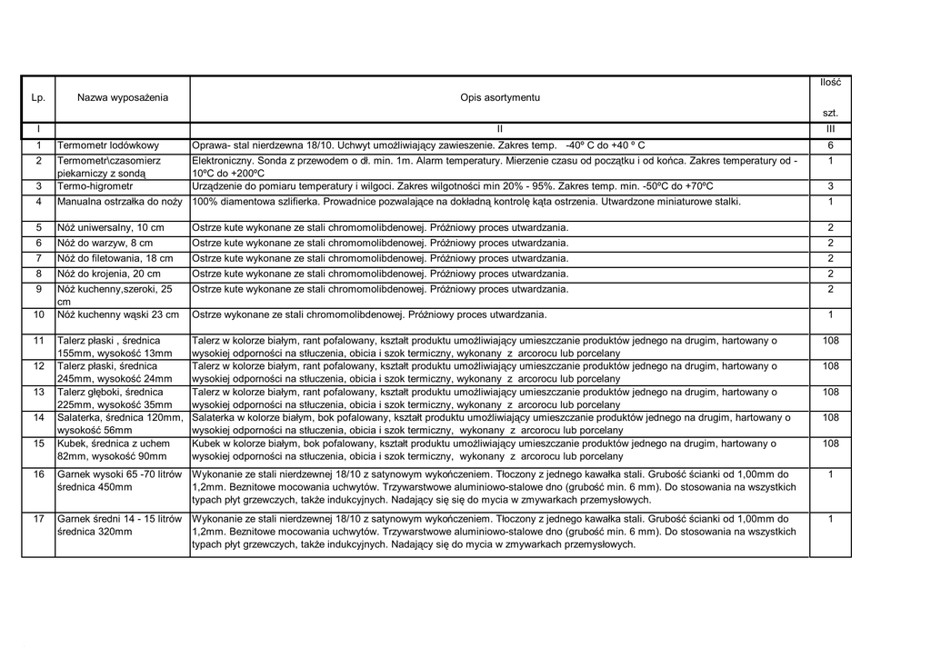 Ilość Lp. Nazwa wyposażenia Opis asortymentu szt. I II III 1 Termometr lodówkowy Oprawa- stal nierdzewna 18/10. Uchwyt umożliwiający zawieszenie. Zakres temp. -40º C do +40 º C 6 2 Elektroniczny. Sonda z przewodem o dł. min. 1m. Alarm temperatury. Mierzenie czasu od początku i od końca. Zakres temperatury od 10ºC do +200ºC Urządzenie do pomiaru temperatury i wilgoci. Zakres wilgotności min 20% - 95%. Zakres temp. min. -50ºC do +70ºC 1 3 Termometr\czasomierz piekarniczy z sondą Termo-higrometr 4 Manualna ostrzałka do noży 100% diamentowa szlifierka. Prowadnice pozwalające na dokładną kontrolę kąta ostrzenia. Utwardzone miniaturowe stalki. 1 5 Nóż uniwersalny, 10 cm Ostrze kute wykonane ze stali chromomolibdenowej. Próżniowy proces utwardzania. 2 6 Nóż do warzyw, 8 cm Ostrze kute wykonane ze stali chromomolibdenowej. Próżniowy proces utwardzania. 2 7 Nóż do filetowania, 18 cm Ostrze kute wykonane ze stali chromomolibdenowej. Próżniowy proces utwardzania. 2 8 Nóż do krojenia, 20 cm Ostrze kute wykonane ze stali chromomolibdenowej. Próżniowy proces utwardzania. 2 9 Nóż kuchenny,szeroki, 25 cm Nóż kuchenny wąski 23 cm Ostrze kute wykonane ze stali chromomolibdenowej. Próżniowy proces utwardzania. 2 Ostrze wykonane ze stali chromomolibdenowej. Próżniowy proces utwardzania. 1 Talerz płaski , średnica 155mm, wysokość 13mm Talerz płaski, średnica 245mm, wysokość 24mm Talerz głęboki, średnica 225mm, wysokość 35mm Salaterka, średnica 120mm, wysokość 56mm Kubek, średnica z uchem 82mm, wysokość 90mm Talerz w kolorze białym, rant pofalowany, kształt produktu umożliwiający umieszczanie produktów jednego na drugim, hartowany o wysokiej odporności na stłuczenia, obicia i szok termiczny, wykonany z arcorocu lub porcelany Talerz w kolorze białym, rant pofalowany, kształt produktu umożliwiający umieszczanie produktów jednego na drugim, hartowany o wysokiej odporności na stłuczenia, obicia i szok termiczny, wykonany z arcorocu lub porcelany Talerz w kolorze białym, rant pofalowany, kształt produktu umożliwiający umieszczanie produktów jednego na drugim, hartowany o wysokiej odporności na stłuczenia, obicia i szok termiczny, wykonany z arcorocu lub porcelany Salaterka w kolorze białym, bok pofalowany, kształt produktu umożliwiający umieszczanie produktów jednego na drugim, hartowany o wysokiej odporności na stłuczenia, obicia i szok termiczny, wykonany z arcorocu lub porcelany Kubek w kolorze białym, bok pofalowany, kształt produktu umożliwiający umieszczanie produktów jednego na drugim, hartowany o wysokiej odporności na stłuczenia, obicia i szok termiczny, wykonany z arcorocu lub porcelany 10 11 12 13 14 15 3 108 108 108 108 108 16 Garnek wysoki 65 -70 litrów Wykonanie ze stali nierdzewnej 18/10 z satynowym wykończeniem. Tłoczony z jednego kawałka stali. Grubość ścianki od 1,00mm do średnica 450mm 1,2mm. Beznitowe mocowania uchwytów. Trzywarstwowe aluminiowo-stalowe dno (grubość min. 6 mm). Do stosowania na wszystkich typach płyt grzewczych, także indukcyjnych. Nadający się się do mycia w zmywarkach przemysłowych. 1 17 Garnek średni 14 - 15 litrów Wykonanie ze stali nierdzewnej 18/10 z satynowym wykończeniem. Tłoczony z jednego kawałka stali. Grubość ścianki od 1,00mm do średnica 320mm 1,2mm. Beznitowe mocowania uchwytów. Trzywarstwowe aluminiowo-stalowe dno (grubość min. 6 mm). Do stosowania na wszystkich typach płyt grzewczych, także indukcyjnych. Nadający się do mycia w zmywarkach przemysłowych. 1 18 Garnek średni 40 -45 litrów, Wykonanie ze stali nierdzewnej 18/10 z satynowym wykończeniem. Tłoczony z jednego kawałka stali. Grubość ścianki od 1,00mm do średnica 450mm 1,2mm. Beznitowe mocowania uchwytów. Trzywarstwowe aluminiowo-stalowe dno (grubość min. 6 mm). Do stosowania na wszystkich typach płyt grzewczych, także indukcyjnych. Nadający się do mycia w zmywarkach przemysłowych. 1 19 Garnek niski 18 - 22 litrów, średnica 400mm Wykonanie ze stali nierdzewnej 18/10 z satynowym wykończeniem. Tłoczony z jednego kawałka stali. Grubość ścianki od 1,00mm do 1,2mm. Beznitowe mocowania uchwytów. Trzywarstwowe aluminiowo-stalowe dno (grubość min. 6 mm). Do stosowania na wszystkich typach płyt grzewczych, także indukcyjnych. Nadający się do mycia w zmywarkach przemysłowych. 2 20 Wykonany ze stali nierdzewnej 18/10, satynowany, 4-komorowy pojemnik na sztućce w pionie, wymiary: min. 250x280x200 mm - max. 260/280/210 Wykonany ze stali nierdzewnej 18/10, satynowany, wyciskacz do puree z wymiennymi końcówkami, wymiary: dł. min. 350 mm max 370 mm, średnica 70 - 80 mm Wykonanie ze stali nierdzewnej 18/10 z satynowym wykończeniem. Średnica min. 270 max.280mm, wysokość min. 120-max.130mm 3 23 Pojemnik na sztućce, 4 komorowy Wyciskacz do puree, pojemność 0,4l Wkład do gotowania na parze 8l, Pokrywa średnica 450mm. Stal nierdzewna 18/10, satynowana. Pasuje do wszystkich garnków, rondli , patelni ze stali nierdzewnej. 2 24 Pokrywa średnica 400 mm. Stal nierdzewna 18/10, satynowana. Pasuje do wszystkich garnków, rondli , patelni ze stali nierdzewnej. 3 25 Pokrywa średnica 320 mm. Stal nierdzewna 18/10, satynowana. Pasuje do wszystkich garnków, rondli , patelni ze stali nierdzewnej. 1 26 Patelnia śr. 40 cm Wykonanie ze stali węglowej. Nadająca się do wszystkich typów płyt grzewczych, także indukcyjnych. Wysokie ścianki i kąty. Rączka płaska ze stali nierdzewnej, mocowana za pomocą minimum 3 nitów do patelni, nienagrzewająca się. 1 27 Tłuczek do mięsa Stal nierdzewna 18/10, wysokopolerowana. Uchwyty satynowe, zakończone hakiem do zawieszenia. Waga tłuczka min.0,8 max. 1 kg 2 28 Taca poliestrowa z gładką powierzchnią Wykonana z poliestru wzmocnionego włóknem szklanym, Wymiary min. 31x51cm. max. 32,5x53 cm 3 29 Stojak na deski (max. 6 szt.) Stal nierdzewna 18/10. Polerowane druty o śr.min 6 mm max. 7mm. Gumowane nakład