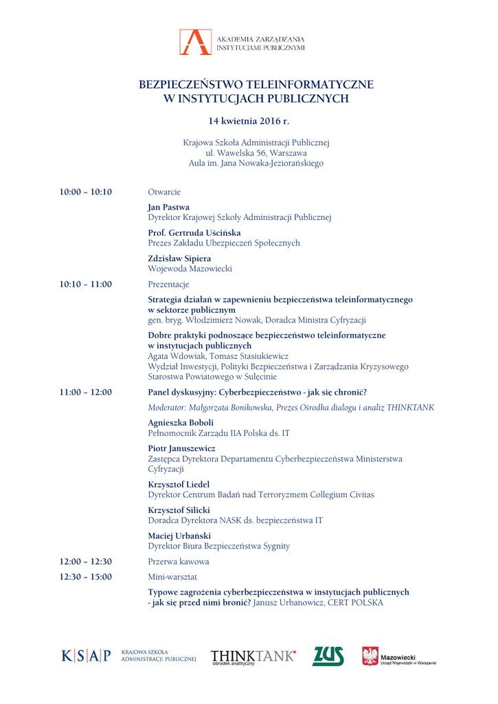 BEZPIECZEŃSTWO TELEINFORMATYCZNE W INSTYTUCJACH PUBLICZNYCH 14 kwietnia 2016 r. Krajowa Szkoła Administracji Publicznej ul. Wawelska 56, Warszawa Aula im. Jana Nowaka-Jeziorańskiego 10:00 – 10:10 Otwarcie Jan Pastwa Dyrektor Krajowej Szkoły Administracji Publicznej Prof. Gertruda Uścińska Prezes Zakładu Ubezpieczeń Społecznych Zdzisław Sipiera Wojewoda Mazowiecki 10:10 – 11:00 Prezentacje Strategia działań w zapewnieniu bezpieczeństwa teleinformatycznego w sektorze publicznym gen. bryg. Włodzimierz Nowak, Doradca Ministra Cyfryzacji Dobre praktyki podnoszące bezpieczeństwo teleinformatyczne w instytucjach publicznych Agata Wdowiak, Tomasz Stasiukiewicz Wydział Inwestycji, Polityki Bezpieczeństwa i Zarządzania Kryzysowego Starostwa Powiatowego w Sulęcinie 11:00 – 12:00 Panel dyskusyjny: Cyberbezpieczeństwo - jak się chronić? Moderator: Małgorzata Bonikowska, Prezes Ośrodka dialogu i analiz THINKTANK Agnieszka Boboli Pełnomocnik Zarządu IIA Polska ds. IT Piotr Januszewicz Zastępca Dyrektora Departamentu Cyberbezpieczeństwa Ministerstwa Cyfryzacji Krzysztof Liedel Dyrektor Centrum Badań nad Terroryzmem Collegium Civitas Krzysztof Silicki Doradca Dyrektora NASK ds. bezpieczeństwa IT Maciej Urbański Dyrektor Biura Bezpieczeństwa Sygnity 12:00 – 12:30 Przerwa kawowa 12:30 – 15:00 Mini-warsztat Typowe zagrożenia cyberbezpieczeństwa w instytucjach publicznych - jak się przed nimi bronić? Janusz Urbanowicz, CERT POLSKA