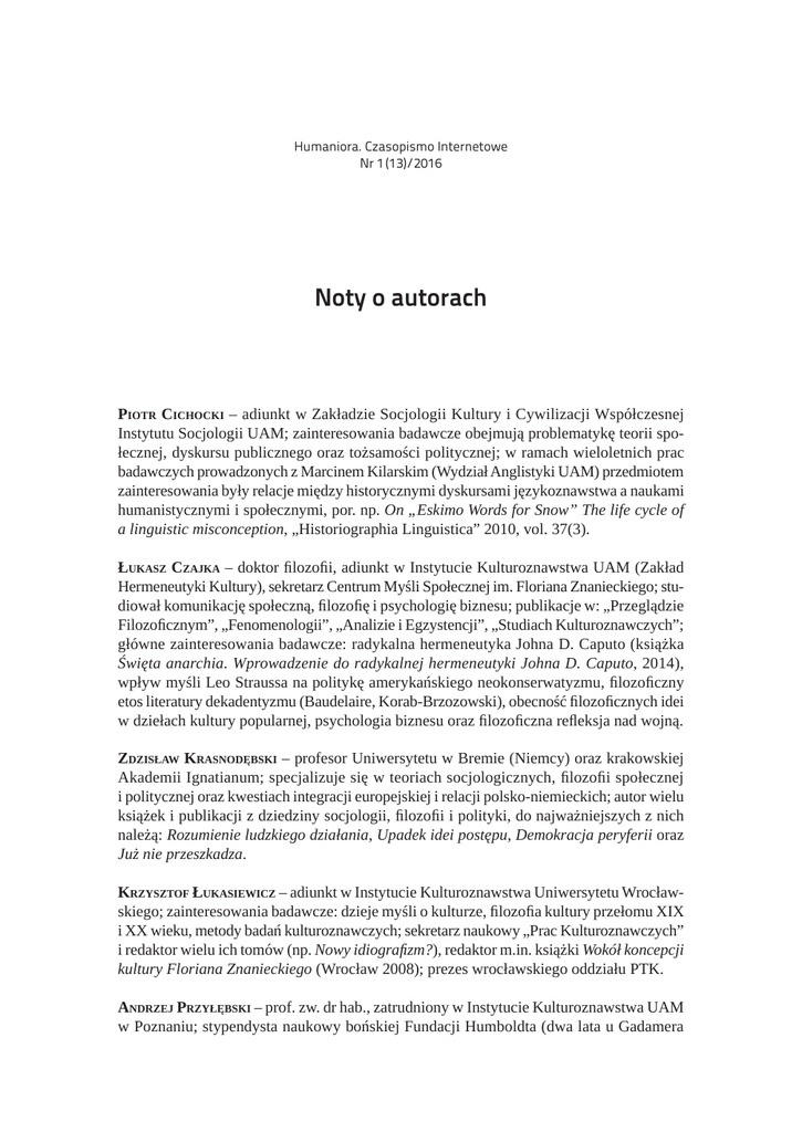 Humaniora. Czasopismo Internetowe Nr 1 (13)/2016 Noty o autorach Piotr Cichocki – adiunkt w Zakładzie Socjologii Kultury i Cywilizacji Współczesnej Instytutu Socjologii UAM; zainteresowania badawcze obejmują problematykę teorii społecznej, dyskursu publicznego oraz tożsamości politycznej; w ramach wieloletnich prac badawczych prowadzonych z Marcinem Kilarskim (Wydział Anglistyki UAM) przedmiotem zainteresowania były relacje między historycznymi dyskursami językoznawstwa a naukami humanistycznymi i społecznymi, por. np. On „Eskimo Words for Snow” The life cycle of a linguistic misconception, „Historiographia Linguistica” 2010, vol. 37(3). Łukasz Czajka – doktor filozofii, adiunkt w Instytucie Kulturoznawstwa UAM (Zakład Hermeneutyki Kultury), sekretarz Centrum Myśli Społecznej im. Floriana Znanieckiego; studiował komunikację społeczną, filozofię i psychologię biznesu; publikacje w: „Przeglądzie Filozoficznym”, „Fenomenologii”, „Analizie i Egzystencji”, „Studiach Kulturoznawczych”; główne zainteresowania badawcze: radykalna hermeneutyka Johna D. Caputo (książka Święta anarchia. Wprowadzenie do radykalnej hermeneutyki Johna D. Caputo, 2014), wpływ myśli Leo Straussa na politykę amerykańskiego neokonserwatyzmu, filozoficzny etos literatury dekadentyzmu (Baudelaire, Korab-Brzozowski), obecność filozoficznych idei w dziełach kultury popularnej, psychologia biznesu oraz filozoficzna refleksja nad wojną. Zdzisław Krasnodębski – profesor Uniwersytetu w Bremie (Niemcy) oraz krakowskiej Akademii Ignatianum; specjalizuje się w teoriach socjologicznych, filozofii społecznej i politycznej oraz kwestiach integracji europejskiej i relacji polsko-niemieckich; autor wielu książek i publikacji z dziedziny socjologii, filozofii i polityki, do najważniejszych z nich należą: Rozumienie ludzkiego działania, Upadek idei postępu, Demokracja peryferii oraz Już nie przeszkadza. Krzysztof Łukasiewicz – adiunkt w Instytucie Kulturoznawstwa Uniwersytetu Wrocławskiego; zainteresowania badawcze: dzieje myśli o kulturze, filozofia kultury przełomu XIX i XX wieku, metody badań kulturoznawczych; sekretarz naukowy „Prac Kulturoznawczych” i redaktor wielu ich tomów (np. Nowy idiografizm?), redaktor m.in. książki Wokół koncepcji kultury Floriana Znanieckiego (Wrocław 2008); prezes wrocławskiego oddziału PTK. Andrzej Przyłębski – prof. zw. dr hab., zatrudniony w Instytucie Kulturoznawstwa UAM w Poznaniu; stypendysta naukowy bońskiej Fundacji Humboldta (dwa lata u Gadamera 170 Noty o autorach i Wiehla w Heidelbergu) i wiedeńskiego Instytutu Nauk o Człowieku, w latach 1996-2001 attaché kultury i nauki Ambasady RP w Berlinie, obecnie – ambasador RP w tym kraju; zajmuje się nowożytną i współczesną filozofią europejską – zwłaszcza niemiecką (kantyzm i neokantyzm, heglizm, filozofia egzystencjalna, fenomenologia, filozofia życia); autor ośmiu książek (m.in. Hermeneutyczny zwrot filozofii, Gadamer, Etyka w świetle hermeneutyki, Krytyka hermeneutycznego rozumu) i redaktor naukowy ponad dwudziestu. Tłumacz z języka angielskiego i niemieckiego (m.in. Filozofii pieniądza G. Simmla oraz Dziedzictwa Europy H.-G. Gadamera); członek Rady Międzynarodowego Towarzystwa Heglowskiego, red. nacz. „Fenomenologii” – pisma Polskiego Towarzystwa Fenomenologicznego; był profesorem filozofii na Uniwersytecie w Chemnitz (l. 2003 i 2006-2007), organizował konferencje naukowe w Niemczech (Bonn, Kolonia, Berlin), w 2006 r. zorganizował Międzynarodowy Kongres Heglowski w Poznaniu; poza filozofią jego pasją jest polityka (napisał książkę Dlaczego Polska jest wartością), tenis ziemny (gra na poziomie instruktora), film oraz muzyka (słucha głównie muzyki źródeł; gra na gitarze, akordeonie i basie). Grzegorz Pyszczek – absolwent Akademii Teologii Katolickiej (obecnie Uniwersytet Kardynała Stefana Wyszyńskiego), socjolog kultury, pracuje na Wydziale Stosowanych Nauk Społecznych Akademii Pedagogiki Specjalnej w Warszawie; autor książki Nadnormalność jako zjawisko społeczne. Wokół koncepcji Floriana Znanieckiego (Warszawa 2013). Wiesław Ratajczak – zatrudniony w Pracowni Badań nad Tradycją Europejską w Instytucie Filologii Polskiej UAM, historyk literatury i kultury drugiej połowy XIX i początków XX wieku; autor książek: Słownik motywów literackich (2004), Teodor Tomasz Jeż (Zygmunt Miłkowski) i wiek XIX (2006), Literatura polska XIX wieku (2008), Conrad i koniec epoki żaglowców (2010); redaktor lub współredaktor licznych tomów zbiorowych, ostatnio: Krasiński i Kraszewski wobec europejskiego romantyzmu i dylematów XIX wieku. W dwustulecie urodzin pisarzy (2016); członek redakcji „Poznańskich Studiów Polonistycznych. Serii Literackiej”, prezes poznańskiego oddziału Towarzystwa Literackiego im. Adama Mickiewicza. Przemysław Rotengruber – mgr sztuki: absolwent Akademii Muzycznej w Poznaniu, klasa kontrabasu (1992); mgr filozofii: absolwent Instytutu Filozofii UAM w Poznaniu (1993); doktor nauk o poznaniu i komunikacji (1998); zatrudniony w Instytucie Kulturoznawstwa UAM (1998); kolokwium habilitacyjne na podstawie rozprawy: Dialogowe podstawy etyki gospodarczej na Wydziale Filozofii UKSW w Warszawie (2012); pełnomocnik rektora UAM ds. potwierdzania efektów uczenia się (2013-2015); prowadzi bogatą działalność naukową i publicystyczną; opublikował książki: Ideologia, anarchia, etyka. Dyskurs ponowoczesny a dialog (2000); Perspektywy społecznego porozumienia. Pragmatyka dyskursu władzy (2006); Dialogowe podstawy etyki gospodarczej (2012); jest autorem ponad stu artykułów naukowych i publicystycznych; współzałożyciel i wiceprzewodniczący polskiego oddziału European Business Ethics Network (od września 2015: członek zarządu); twórca i redaktor naczelny „The Journal of Applied Cultural Studies”. Marcin Sieńko – adiunkt w Instytucie Filozofii U