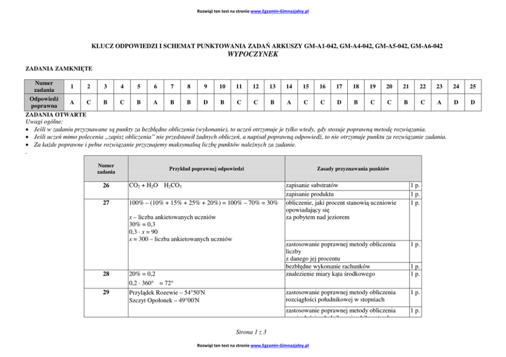 Rozwiąż ten test na stronie www.Egzamin-Gimnazjalny.pl KLUCZ ODPOWIEDZI I SCHEMAT PUNKTOWANIA ZADA ARKUSZY GM-A1-042, GM-A4-042, GM-A5-042, GM-A6-042 WYPOCZYNEK ZADANIA ZAMKNI TE Numer 1 2 zadania Odpowied A C poprawna ZADANIA OTWARTE 3 4 5 6 7 8 9 10 11 12 13 14 15 16 17 18 19 20 21 22 23 24 25 B C B A B B D B C C B A C C D B C C B C A D D Uwagi ogólne: Je li w zadaniu przyznawane s punkty za bezbł dne obliczenia (wykonanie), to ucze otrzymuje je tylko wtedy, gdy stosuje poprawn metod rozwi zania. Je li ucze mimo polecenia „zapisz obliczenia” nie przedstawił adnych oblicze , a napisał poprawn odpowied , to nie otrzymuje punktu za rozwi zanie zadania. Za ka de poprawne i pełne rozwi zanie przyznajemy maksymaln liczb punktów nale nych za zadanie. . Numer zadania Przykład poprawnej odpowiedzi 26 CO2 + H2O H2CO3 27 100% – (10% + 15% + 25% + 20%) = 100% – 70% = 30% x – liczba ankietowanych uczniów 30% = 0,3 0,3 · x = 90 x = 300 – liczba ankietowanych uczniów 28 20% = 0,2 0,2 · 360 = 72 29 Przyl dek Rozewie – 54 50'N Szczyt Opołonek – 49 00'N Zasady przyznawania punktów zapisanie substratów zapisanie produktu obliczenie, jaki procent stanowi uczniowie opowiadaj cy si za pobytem nad jeziorem 1 p. 1 p. 1 p. zastosowanie poprawnej metody obliczenia liczby z danego jej procentu bezbł dne wykonanie rachunków znalezienie miary k ta rodkowego 1 p. zastosowanie poprawnej metody obliczenia rozci gło ci południkowej w stopniach 1 p. zastosowanie poprawnej metody obliczenia rozci gło ci południkowej w kilometrach 1 p. Strona 1 z 3 Rozwiąż ten test na stronie www.Egzamin-Gimnazjalny.pl 1 p. 1 p. Rozwiąż ten test na stronie www.Egzamin-Gimnazjalny.pl 30 obliczenie ró nicy w stopniach: 54 50' – 49 00' = 5 50' rozci gło ci południkowej w kilometrach przeliczenie ró nicy w stopniach na km: 5 · 111,1 km + 50 · 1,85 km = 648,08 km bezbł dne wykonanie rachunków 1 p. x - długo zapisanie równania zastosowanie poprawnej metody obliczenia długo ci mostu zastosowanie poprawnej metody obliczenia szeroko ci rzeki bezbł dne wykonanie rachunków 1 p. 1 p. nazwanie ka dego z etapów rozwoju aby po 1 p. po 1 p. 150 + mostu 1 1 x+ x=x 6 3 x = 300 31 32 33 1 · 300 = 50 (m) – szeroko rzeki 6 A – skrzek B – kijanka np. posiada ogon, oddycha skrzelami wymienienie ka dej cechy kijanki warto ładunku przepływaj cego w ci gu godziny w kulombach: q = 8,1 A · 3600 s = 29160 C czas, po jakim wyczerpie si bateria: 29160 C : 0,3 A = 97200 s 97200 s = 27 h zastosowanie poprawnej metody obliczenia ładunku Ładunek, jaki przepłynie w ci gu godziny wynosi 29160 C. Bateria wyczerpie si po 27 h u ywania tej latarki. Strona 2 z 3 Rozwiąż ten test na stronie www.Egzamin-Gimnazjalny.pl 1 p. 1 p. 1 p. Rozwiąż ten test na stronie www.Egzamin-Gimnazjalny.pl 34 2 H + 52 = 132 H = 12 Vs - obj to Vs = sto ka (foremki) 1 · ·52·12 = 100 3 Vw - obj to walca Vw = ·10 2 ·36 = 3600 V – obj to sze ciu foremek V = 6 · 100 = 600 1 600 = 3600 6 Dziecko wypełniło piaskiem zastosowanie poprawnej metody obliczenia czasu 1 p. bezbł dne wykonanie rachunków 1 p. zastosowanie poprawnej metody obliczenia wysoko ci sto ka zastosowanie poprawnej metody obliczenia obj to ci sto ka (foremki) 1 p. 1 p. zastosowanie poprawnej metody obliczenia obj to ci walca (wiaderka) 1 p. zastosowanie poprawnej metody obliczenia, jak cz wiaderka wypełnił piasek z sze ciu foremek bezbł dne wykonanie rachunków 1 p. 1 wiaderka. 6 Strona 3 z 3 Rozwiąż ten test na stronie www.Egzamin-Gimnazjalny.pl 1 p.