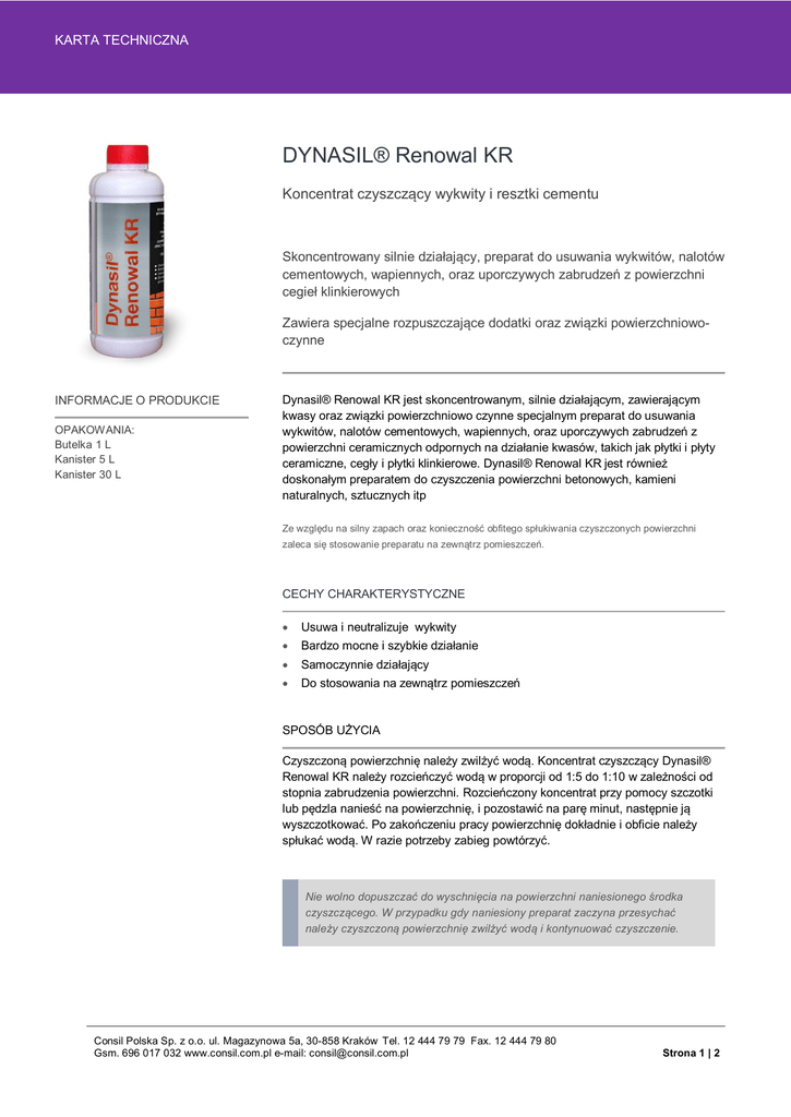 KARTA TECHNICZNA DYNASIL® Renowal KR Koncentrat czyszczący wykwity i resztki cementu Skoncentrowany silnie działający, preparat do usuwania wykwitów, nalotów cementowych, wapiennych, oraz uporczywych zabrudzeń z powierzchni cegieł klinkierowych Zawiera specjalne rozpuszczające dodatki oraz związki powierzchniowoczynne INFORMACJE O PRODUKCIE OPAKOWANIA: Butelka 1 L Kanister 5 L Kanister 30 L Dynasil® Renowal KR jest skoncentrowanym, silnie działającym, zawierającym kwasy oraz związki powierzchniowo czynne specjalnym preparat do usuwania wykwitów, nalotów cementowych, wapiennych, oraz uporczywych zabrudzeń z powierzchni ceramicznych odpornych na działanie kwasów, takich jak płytki i płyty ceramiczne, cegły i płytki klinkierowe. Dynasil® Renowal KR jest również doskonałym preparatem do czyszczenia powierzchni betonowych, kamieni naturalnych, sztucznych itp Ze względu na silny zapach oraz konieczność obfitego spłukiwania czyszczonych powierzchni zaleca się stosowanie preparatu na zewnątrz pomieszczeń. CECHY CHARAKTERYSTYCZNE Usuwa i neutralizuje wykwity Bardzo mocne i szybkie działanie Samoczynnie działający Do stosowania na zewnątrz pomieszczeń SPOSÓB UŻYCIA Czyszczoną powierzchnię należy zwilżyć wodą. Koncentrat czyszczący Dynasil® Renowal KR należy rozcieńczyć wodą w proporcji od 1:5 do 1:10 w zależności od stopnia zabrudzenia powierzchni. Rozcieńczony koncentrat przy pomocy szczotki lub pędzla nanieść na powierzchnię, i pozostawić na parę minut, następnie ją wyszczotkować. Po zakończeniu pracy powierzchnię dokładnie i obficie należy spłukać wodą. W razie potrzeby zabieg powtórzyć. Nie wolno dopuszczać do wyschnięcia na powierzchni naniesionego środka czyszczącego. W przypadku gdy naniesiony preparat zaczyna przesychać należy czyszczoną powierzchnię zwilżyć wodą i kontynuować czyszczenie. Consil Polska Sp. z o.o. ul. Magazynowa 5a, 30-858 Kraków Tel. 12 444 79 79 Fax. 12 444 79 80 Gsm. 696 017 032 www.consil.com.pl e-mail: [email protected] Strona 1 | 2 KARTA TECHNICZNA UWAGI Nie należy stosować preparatu do szkliwionych cegieł klinkierowych. Beton i płyty betonowe mogą być czyszczone z użyciem preparatu Dynasil® Renowal KR, jednak należy zwrócić uwagę na możliwość uszorstnienia powierzchni. Kamienie naturalne zawierające związki żelaza mogą ulec przebarwieniu, nie należy również stosować preparatu na materiałach wrażliwych na działanie kwasów, jak polerowany marmur, lub szlifowane płyty betonowe. Należy dokładnie zabezpieczyć wszystkie powierzchnie nie przeznaczone do czyszczenia oraz wrażliwe na działanie kwasów. Przed zastosowaniem preparatu należy wykonać próbę w mało widocznym miejscu. PRZECHOWYWANIE Przechowywać w szczelnie zamkniętych oryginalnych opakowaniach, w suchych i chłodnych pomieszczeniach. Chronić przed mrozem. Okres przydatności do użycia – 36 miesięcy od daty produkcji. WSKAZÓWKI BHP Produkt zawiera: kwas chlorowodorowy, kwas mrówkowy, ≤15% niejonowych środków powierzchniowo-czynnych, substancje pomocnicze. Znaki ostrzegawcze: C – produkt żrący Zwroty zagrożenia: R34 powoduje oparzenia R37 działa drażniąco na drogi oddechowe Zwroty określające warunki bezpiecznego stosowania: S 1/2 przechowywać pod zamknięciem i chronić przed dziećmi S 23 nie wdychać pary S 26 zanieczyszczone oczy przemyć natychmiast dużą ilością wody i zasięgnąć porady lekarza S 36/37/39 nosić odpowiednią odzież ochroną, odpowiednie rękawice ochronne i okulary lub ochronę twarzy. S 45 w przypadku awarii lub jeżeli źle się poczujesz, niezwłocznie zasięgnij porady lekarza – jeżeli to możliwe, pokaż etykietę S 51 stosować wyłącznie w dobrze wentylowanych pomieszczeniach Inne zagrożenia: UN: 1760 Dane zawarte w niniejszej karcie technicznej stanowią opis produktu. Są to ogólne wskazówki oparte na naszych doświadczeniach i wiedzy. Prezentowane informacje nie mogą stanowić podstawy do jakichkolwiek roszczeń z uwagi na brak wpływu na warunki pracy i sposób użycia produktu. W razie potrzeby prosimy o kontakt [email protected] Aktualna wersja karty technicznej produktu znajduje się na www.consil.com.pl Nowoczesne środki ochrony budowli Consil Polska Sp. z o.o. ul. Magazynowa 5a, 30-858 Kraków Tel. 12 444 79 79 Fax. 12 444 79 80 Gsm. 696 017 032 www.consil.com.pl e-mail: [email protected] Strona 2 | 2