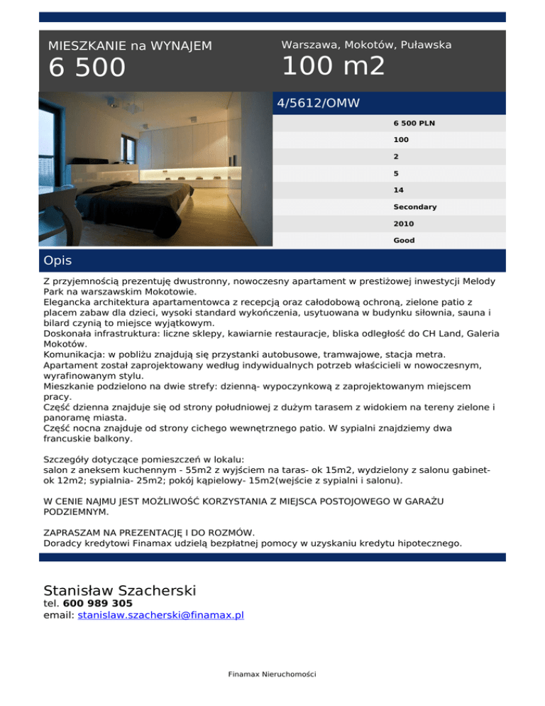Warszawa, Mokotów, Puławska MIESZKANIE na WYNAJEM 100 m2 6 500 4/5612/OMW 6 500 PLN 100 2 5 14 Secondary 2010 Good Opis Z przyjemnością prezentuję dwustronny, nowoczesny apartament w prestiżowej inwestycji Melody Park na warszawskim Mokotowie. Elegancka architektura apartamentowca z recepcją oraz całodobową ochroną, zielone patio z placem zabaw dla dzieci, wysoki standard wykończenia, usytuowana w budynku siłownia, sauna i bilard czynią to miejsce wyjątkowym. Doskonała infrastruktura: liczne sklepy, kawiarnie restauracje, bliska odległość do CH Land, Galeria Mokotów. Komunikacja: w pobliżu znajdują się przystanki autobusowe, tramwajowe, stacja metra. Apartament został zaprojektowany według indywidualnych potrzeb właścicieli w nowoczesnym, wyrafinowanym stylu. Mieszkanie podzielono na dwie strefy: dzienną- wypoczynkową z zaprojektowanym miejscem pracy. Część dzienna znajduje się od strony południowej z dużym tarasem z widokiem na tereny zielone i panoramę miasta. Część nocna znajduje od strony cichego wewnętrznego patio. W sypialni znajdziemy dwa francuskie balkony. Szczegóły dotyczące pomieszczeń w lokalu: salon z aneksem kuchennym - 55m2 z wyjściem na taras- ok 15m2, wydzielony z salonu gabinetok 12m2; sypialnia- 25m2; pokój kąpielowy- 15m2(wejście z sypialni i salonu). W CENIE NAJMU JEST MOŻLIWOŚĆ KORZYSTANIA Z MIEJSCA POSTOJOWEGO W GARAŻU PODZIEMNYM. ZAPRASZAM NA PREZENTACJĘ I DO ROZMÓW. Doradcy kredytowi Finamax udzielą bezpłatnej pomocy w uzyskaniu kredytu hipotecznego. Stanisław Szacherski tel. 600 989 305 email: [email protected] Finamax Nieruchomości Powered by TCPDF (www.tcpdf.org)