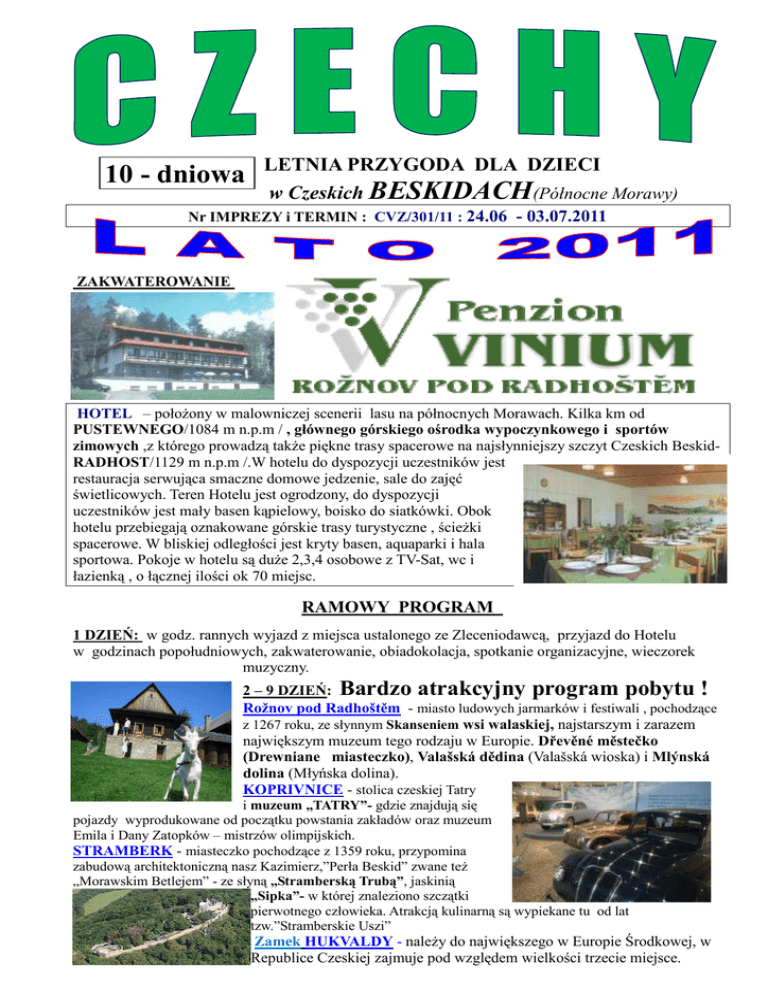 10 - dniowa LETNIA PRZYGODA DLA DZIECI w Czeskich BESKIDACH(Północne Morawy) Nr IMPREZY i TERMIN : CVZ/301/11 : 24.06 - 03.07.2011 ZAKWATEROWANIE HOTEL – połoŜony w malowniczej scenerii lasu na północnych Morawach. Kilka km od PUSTEWNEGO/1084 m n.p.m / , głównego górskiego ośrodka wypoczynkowego i sportów zimowych ,z którego prowadzą takŜe piękne trasy spacerowe na najsłynniejszy szczyt Czeskich BeskidRADHOST/1129 m n.p.m /.W hotelu do dyspozycji uczestników jest restauracja serwująca smaczne domowe jedzenie, sale do zajęć świetlicowych. Teren Hotelu jest ogrodzony, do dyspozycji uczestników jest mały basen kąpielowy, boisko do siatkówki. Obok hotelu przebiegają oznakowane górskie trasy turystyczne , ścieŜki spacerowe. W bliskiej odległości jest kryty basen, aquaparki i hala sportowa. Pokoje w hotelu są duŜe 2,3,4 osobowe z TV-Sat, wc i łazienką , o łącznej ilości ok 70 miejsc. RAMOWY PROGRAM 1 DZIEŃ: w godz. rannych wyjazd z miejsca ustalonego ze Zleceniodawcą, przyjazd do Hotelu w godzinach popołudniowych, zakwaterowanie, obiadokolacja, spotkanie organizacyjne, wieczorek muzyczny. 2 – 9 DZIEŃ: Bardzo atrakcyjny program pobytu ! Rožnov pod Radhoštěm - miasto ludowych jarmarków i festiwali , pochodzące z 1267 roku, ze słynnym Skanseniem wsi walaskiej, najstarszym i zarazem największym muzeum tego rodzaju w Europie. Dřevěné městečko (Drewniane miasteczko), Valašská dědina (Valašská wioska) i Mlýnská dolina (Młyńska dolina). KOPRIVNICE - stolica czeskiej Tatry i muzeum „TATRY”- gdzie znajdują się pojazdy wyprodukowane od początku powstania zakładów oraz muzeum Emila i Dany Zatopków – mistrzów olimpijskich. STRAMBERK - miasteczko pochodzące z 1359 roku, przypomina zabudową architektoniczną nasz Kazimierz,”Perła Beskid” zwane teŜ „Morawskim Betlejem” - ze słyną „Stramberską Trubą”, jaskinią „Sipka”- w której znaleziono szczątki pierwotnego człowieka. Atrakcją kulinarną są wypiekane tu od lat tzw.”Stramberskie Uszi” Zamek HUKVALDY - naleŜy do największego w Europie Środkowej, w Republice Czeskiej zajmuje pod względem wielkości trzecie miejsce. ZałoŜony w XIII w. Odbywa się tu Festiwal poświęcony kompozytorowi Leošowi Janáčkowi, który w Hukvaldach przyszedł na świat i często tam przebywał. Znana opera „Przygody Liska Chytruska“ została podobno zainspirowana hukvaldzkimi terenami. Rzeźba Liska Chytruska stoi dziś w odległości kilkadziesiąt metrów od amfiteatru. FRANSZTAT POD RADHOSTEM - miasto załoŜone w 1884 r , zabytkowy rynek oraz kompleks sportowy ze skoczniami narciarskimi na Vielkim Javorniku /918 m n.p.m. / czynnymi przez cały rok - miasto znakomitego skocza narciarskiego Jakuba Jandy oraz AQUAPARK. PUSTEWNY - połoŜony na wysokości 1018 m n.p.m. , z duŜą ilością tras spacerowych oraz historycznym zespołem architektonicznym i hotelowym pochodzącym z 1891 roku, z duŜą ilością ludowych rzeźb i stylowych kawiarenek. Malownicza trasa widokowa na punkt widokowy i do pomnika RADEGASTA oraz na opiewany pieśniami najsłynniejszy szczyt Czeskich Moraw RADHOST-1129 m n.p.m. NOVÝ JIČIN ; małe miasteczko z przepięknym rynkiem. Niezwykły jest tu XVII wieczny ratusz , najpiękniejszym budynkiem przy rynku jest Stara Pošta z urzekającą dwupoziomową loggią pochodząca z XVI w. Tutaj nocowali car Aleksander I oraz gen. Suworow. Największą atrakcją starego miasta jest jedyne w świecie Muzeum kapeluszy w Zamku rodu Žerotinów. TEPLICE n/ BECZWĄ - ZBRASZOWSKIE JASKINIE ARAGONITOWE -leŜą w malowniczej dolinie rzeki uzdrowiska. W bliskiej odległości od jaskini jest najgłębsza przepaść Czeskiej republiki „Hranická Propast“. Jej sucha część, do której moŜna swobodnie zajrzeć, ma głębokość 69,5 m, w zatopionej części potwierdzona głębokość wynosi 220 m. Całkowita głębokość 289,5 m, dna do tej pory nie osiągnięto - przewidujemy ponadto w zaleŜności od pogody i kondycji uczestników; gry i zabawy świetlicowe, konkursy rekreacyjno – sportowe WYśYWIENIE : c a ł o d z i e n n e TRANSPORT : autokar o podwyŜszonym standardzie CENA 1.100,00 PLN CENA OBEJMUJE : - zakwaterowanie w pokojach 3 i 4 osobowych z TV-Sat, wc i łazienką - wyŜywienie : śniadania , obiady i kolacje( pobyt zaczyna się od obiadokolacji w dniu przyjazdu, a kończy śniadaniem ostatniego dnia pobytu )plus suchy prowiant na drogę powrotną, - ubezpieczenie KL i NNW poza granicami kraju - transport autokarem (autokar pozostaje na miejscu do dyspozycji uczestników), - 2 x wejścia do Aquaparku (w przypadku niesprzyjającej pogody basen kąpielowy ze zjeŜdŜalnią) - bilety wstępu ; Muzeum Samochodów TATRA, Muzeum Kapeluszy, Skansen DREWNIANE MIASTECZKO, Zamek HUKVALDY, Stramberska Truba, ZBRASZOWSKIE JASKINIE, - dyskoteki w klubie hotelowym, -opiekę kadry pedagogicznej i medycznej, CENA NIE OBEJMUJE : - płatnych imprez fakultatywnych organizowanych przez hotel lub na Ŝyczenie uczestników, DZIEŃ :po śniadaniu wyjazd z hotelu, przyjazd na miejsce wyjazdu w godz. wieczornych. UWAGA !!! - OBOWIĄZKOWE JEST POSIADANIE PASZPORTU LUB DOWODU OSOBISTEGO ORGANIZATOR :BIURO TURYSTYKI KRAJOWEJ I ZAGRANICZNEJ Właściciele BARBARA i STANISŁAW PRZYTUŁA ZEZWOLENIE ; Wpis do Rejestru ORGANIZATORÓW TURYSTYKI i POŚREDNIKÓW TURYSTYCZNYCH Województwa Lubelskiego Nr 036 SIEDZIBA ;21-010 Łęczna, ul. Stefanii Pawlak 3, tel./fax 81 752 15 75 e-mail ; [email protected] www.stanpol.info WPŁATY: na konto w PKO BP Oddział 1 Lublin Nr 13 1020 3147 0000 8102 0052 8323
