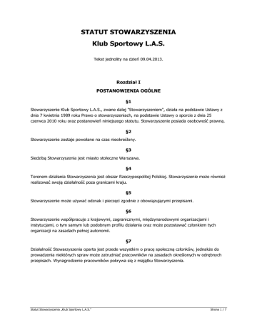 STATUT STOWARZYSZENIA Klub Sportowy L.A.S. Tekst jednolity na dzień 09.04.2013. Rozdział I POSTANOWIENIA OGÓLNE §1 Stowarzyszenie Klub Sportowy L.A.S., zwane dalej "Stowarzyszeniem", działa na podstawie Ustawy z dnia 7 kwietnia 1989 roku Prawo o stowarzyszeniach, na podstawie Ustawy o sporcie z dnia 25 czerwca 2010 roku oraz postanowień niniejszego statutu. Stowarzyszenie posiada osobowość prawną. §2 Stowarzyszenie zostaje powołane na czas nieokreślony. §3 Siedzibą Stowarzyszenia jest miasto stołeczne Warszawa. §4 Terenem działania Stowarzyszenia jest obszar Rzeczypospolitej Polskiej. Stowarzyszenie może również realizować swoją działalność poza granicami kraju. §5 Stowarzyszenie może używać odznak i pieczęci zgodnie z obowiązującymi przepisami. §6 Stowarzyszenie współpracuje z krajowymi, zagranicznymi, międzynarodowymi organizacjami i instytucjami, o tym samym lub podobnym profilu działania oraz może pozostawać członkiem tych organizacji na zasadach pełnej autonomii. §7 Działalność Stowarzyszenia oparta jest przede wszystkim o pracę społeczną członków, jednakże do prowadzenia niektórych spraw może zatrudniać pracowników na zasadach określonych w odrębnych przepisach. Wynagrodzenie pracowników pokrywa się z majątku Stowarzyszenia. Statut Stowarzyszenia „Klub Sportowy L.A.S.” Strona 1 / 7 Rozdział II CELE I SPOSOBY ICH REALIZACJI §8 1. Cele Stowarzyszenia: a) organizowanie i rozwijanie kultury fizycznej, sportu, turystyki i rekreacji wśród członków Stowarzyszenia, ich rodzin oraz sympatyków, b) upowszechnianie kultury fizycznej, sportu, rekreacji i zdrowego stylu życia, szczególnie wśród dzieci i młodzieży, c) upowszechnianie wiedzy i zachowania proekologicznego, d) kształtowanie pozytywnych cech charakteru i osobowości dzieci i młodzieży poprzez uczestnictwo w zajęciach sportowo-rekreacyjnych, e) kształtowanie wśród członków Stowarzyszenia patriotyzmu i zasad moralnych, f) integracja społeczności lokalnej, g) wzajemna pomoc członkom Stowarzyszenia, ich rodzinom oraz sympatykom, h) działalność wspomagająca instytucje publiczne w zakresie ochrony i promocji zdrowia. 2. Stowarzyszenie realizuje swoje cele poprzez odpłatną lub nieodpłatną działalność pożytku publicznego w postaci: a) organizowania i realizacji współzawodnictwa sportowego, b) organizowania zawodów, imprez sportowych i rekreacyjnych, festynów, c) prowadzenia systematycznego szkolenia sportowego, treningów, obozów szkoleniowych, d) szkolenia oraz doskonalenia kadr trenersko – instruktorskich, e) utrzymania i właściwego gospodarowania obiektami i urządzeniami sportowymi, f) udostępniania swoim członkom posiadanych urządzeń i obiektów sportowych, g) współdziałania z innymi stowarzyszeniami, jednostkami administracji rządowej, samorządowej oraz innymi organizacjami, h) wspierania działalności innych organizacji sportowych i rekreacyjnych, i) organizowania spotkań, wykładów, szkoleń i konferencji, j) organizowania zbiórek publicznych, Rozdział III CZŁONKOWIE – PRAWA I OBOWIĄZKI §9 Członkami Stowarzyszenia mogą być osoby fizyczne i prawne. Osoba prawna może być jedynie członkiem wspierającym Stowarzyszenie. Stowarzyszenie posiada członków: a) zwyczajnych, b) wspierających, c) honorowych. § 10 Statut Stowarzyszenia „Klub Sportowy L.A.S.” Strona 2 / 7 Członkiem zwyczajnym Stowarzyszenia może być każda pełnoletnia osoba fizyczna. Małoletni w wieku od 16 do 18 lat, którzy mają ograniczoną zdolność do czynności prawnych, mogą należeć do Stowarzyszenia i korzystać z czynnego i biernego prawa wyborczego, z tym, że w składzie Zarządu Stowarzyszenia większość muszą stanowić osoby o pełnej zdolności do czynności prawnych, natomiast małoletni poniżej 16 lat mogą, za zgodą przedstawicieli ustawowych, należeć do Stowarzyszenia bez prawa udziału w głosowaniu na Walnych Zebraniach Członków oraz bez korzystania z czynnego i biernego prawa wyborczego do Władz Stowarzyszenia. Członkiem zwyczajnym Stowarzyszenia można zostać po warunkiem złożenia deklaracji członkowskiej zawierającej rekomendację trzech członków Stowarzyszenia. § 11 Przyjęcia nowych członków dokonuje Zarząd Stowarzyszenia poprzez przyjęcie uchwały. § 12 Członkiem wspierającym Stowarzyszenie może zostać osoba fizyczna lub prawna udzielająca pomocy finansowej, rzeczowej lub merytorycznej w realizacji celów Stowarzyszenia. § 13 Członkiem honorowym Stowarzyszenia może być osoba fizyczna, która wniosła szczególny wkład w działalność i rozwój Stowarzyszenia. Członkowie honorowi są ustanawiani przez Zarząd na wniosek trzech członków Stowarzyszenia. § 14 Członkowie zwyczajni mają prawo do: 1. biernego i czynnego uczestniczenia w wyborach do władz Stowarzyszenia, 2. uczestniczenia w Walnych Zebraniach Członków. 3. korzystania z dorobku, majątku i wszelkich form działalności Stowarzyszenia, 4. udziału w zebraniach, wykładach oraz imprezach organizowanych przez Stowarzyszenie, 5. zgłaszania wniosków co do działalności Stowarzyszenia. § 15 Członkowie zwyczajni mają obowiązek do: 1. brania udziału w działalności Stowarzyszenia i realizacji jego celów, 2. przestrzegania statutu i uchwał władz Stowarzyszenia, 3. regularnego opłacania składek członkowskich, § 16 Członkowie wspierający i honorowi nie posiadają biernego oraz czynnego prawa wyborczego, mogą jednak brać udział z głosem doradczym w Walnym Zebraniu Członków Stowarzyszenia, poza tym posiadają takie same prawa jak członkowie zwyczajni. Członek wspierający ma obowiązek wywiązywania się z zadeklarowanych świadczeń, przestrzegania statutu oraz uchwał władz Stowarzyszenia. § 17 Członkowie honorowi są zwolnieni ze składek członkowskich. Statut Stowarzyszenia „Klub Sportowy L.A.S.” Strona 3 / 7 § 18 Utrata członkostwa następuje na skutek: 1. pisemnej rezygnacji 