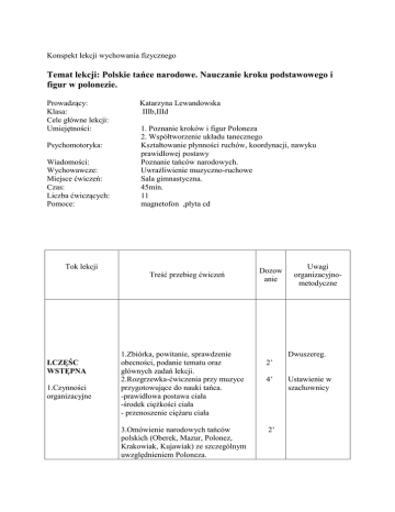 Konspekt lekcji wychowania fizycznego Temat lekcji: Polskie tańce narodowe. Nauczanie kroku podstawowego i figur w polonezie. Prowadzący: Klasa: Cele główne lekcji: Umiejętności: Psychomotoryka: Wiadomości: Wychowawcze: Miejsce ćwiczeń: Czas: Liczba ćwiczących: Pomoce: Katarzyna Lewandowska IIIb,IIId 1. Poznanie kroków i figur Poloneza 2. Współtworzenie układu tanecznego Kształtowanie płynności ruchów, koordynacji, nawyku prawidłowej postawy Poznanie tańców narodowych. Uwrażliwienie muzyczno-ruchowe Sala gimnastyczna. 45min. 11 magnetofon ,płyta cd Tok lekcji Treść przebieg ćwiczeń I.CZĘŚC WSTĘPNA 1.Czynności organizacyjne 1.Zbiórka, powitanie, sprawdzenie obecności, podanie tematu oraz głównych zadań lekcji. 2.Rozgrzewka-ćwiczenia przy muzyce przygotowujące do nauki tańca. -prawidłowa postawa ciała -środek ciężkości ciała - przenoszenie ciężaru ciała 3.Omówienie narodowych tańców polskich (Oberek, Mazur, Polonez, Krakowiak, Kujawiak) ze szczególnym uwzględnieniem Poloneza. Dozow anie Uwagi organizacyjnometodyczne Dwuszereg. 2’ 4’ 2’ Ustawienie w szachownicy II.CZĘŚC GŁÓWNA Nauka kroku podstawowego Poloneza Trzymanie taneczne w parach Nauka wybranych figur w Polonezie . 1. Nauka kroku podstawowego bez muzyki pojedynczo 2.krok podstawowy ćwiczony pojedynczo w rytm muzyki 3.Prawidłowe ustawienie w parachtrzymanie taneczne 4..Krok podstawowy parami po kole 12’ Układ taneczny wg poniższego porządku-nauka wybranych figur w Polonezie 20’ 1. Wyjście – koło parami 2. Rozejście w parach(para w prawo ,para w lewo) 3. Mosty ,przejście pod mostem 4. Czwórki 5. Ukłon czwórkam i rozejście 6. Marsz po kole, zatrzymanie, 7. Ukłon Pokaz prawidłowo wykonanego kroku Podział na cztery rzędy-,czwórkami krok podstzachowanie odstępów między ćwiczącymi. Ustawienie param,,zwrócenie uwagi na trzymanie w parze. Nauczyciel cały czas zwraca uwage na dokładność i staranność wykonywania kroku przez U,w razie konieczności koryguje błędy. III.CZĘŚĆ KOŃCOWA 1.Zakończenie lekcji 5’ 1.Zbiórka,omówienie i podsumowanie lekcji, wyróżnienie najlepiej ćwiczących 2.Pożegnanie Ustawienie w dwuszeregu CZĘŚĆ II GLÓWNA 33 MIN. ).
