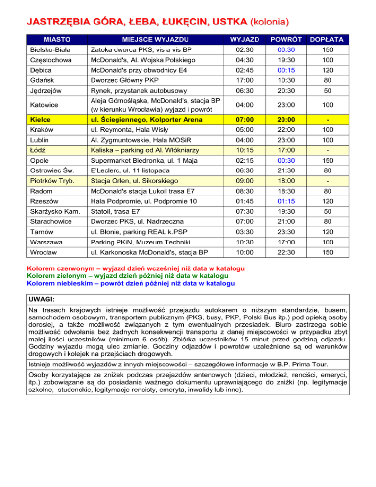 JASTRZĘBIA GÓRA, ŁEBA, ŁUKĘCIN, USTKA (kolonia) MIASTO MIEJSCE WYJAZDU WYJAZD POWRÓT DOPŁATA Bielsko-Biała Zatoka dworca PKS, vis a vis BP 02:30 00:30 150 Częstochowa McDonald's, Al. Wojska Polskiego 04:30 19:30 100 Dębica McDonald's przy obwodnicy E4 02:45 00:15 120 Gdańsk Dworzec Główny PKP 17:00 10:30 80 Jędrzejów Rynek, przystanek autobusowy 06:30 20:30 50 Katowice Aleja Górnośląska, McDonald's, stacja BP (w kierunku Wrocławia) wyjazd i powrót 04:00 23:00 100 Kielce ul. Ściegiennego, Kolporter Arena 07:00 20:00 - Kraków ul. Reymonta, Hala Wisły 05:00 22:00 100 Lublin Al. Zygmuntowskie, Hala MOSiR 04:00 23:00 100 Łódź Kaliska – parking od Al. Włókniarzy 10:15 17:00 - Opole Supermarket Biedronka, ul. 1 Maja 02:15 00:30 150 Ostrowiec Św. E'Leclerc, ul. 11 listopada 06:30 21:30 80 Piotrków Tryb. Stacja Orlen, ul. Sikorskiego 09:00 18:00 - Radom McDonald's stacja Lukoil trasa E7 08:30 18:30 80 Rzeszów Hala Podpromie, ul. Podpromie 10 01:45 01:15 120 Skarżysko Kam. Statoil, trasa E7 07:30 19:30 50 Starachowice Dworzec PKS, ul. Nadrzeczna 07:00 21:00 80 Tarnów ul. Błonie, parking REAL k.PSP 03:30 23:30 120 Warszawa Parking PKiN, Muzeum Techniki 10:30 17:00 100 Wrocław ul. Karkonoska McDonald's, stacja BP 10:00 22:30 150 Kolorem czerwonym – wyjazd dzień wcześniej niż data w katalogu Kolorem zielonym – wyjazd dzień później niż data w katalogu Kolorem niebieskim – powrót dzień później niż data w katalogu UWAGI: Na trasach krajowych istnieje możliwość przejazdu autokarem o niższym standardzie, busem, samochodem osobowym, transportem publicznym (PKS, busy, PKP, Polski Bus itp.) pod opieką osoby dorosłej, a także możliwość związanych z tym ewentualnych przesiadek. Biuro zastrzega sobie możliwość odwołania bez żadnych konsekwencji transportu z danej miejscowości w przypadku zbyt małej ilości uczestników (minimum 6 osób). Zbiórka uczestników 15 minut przed godziną odjazdu. Godziny wyjazdu mogą ulec zmianie. Godziny odjazdów i powrotów uzależnione są od warunków drogowych i kolejek na przejściach drogowych. Istnieje możliwość wyjazdów z innych miejscowości – szczegółowe informacje w B.P. Prima Tour. Osoby korzystające ze zniżek podczas przejazdów antenowych (dzieci, młodzież, renciści, emeryci, itp.) zobowiązane są do posiadania ważnego dokumentu uprawniającego do zniżki (np. legitymacje szkolne, studenckie, legitymacje rencisty, emeryta, inwalidy lub inne). REWAL (kolonia) MIASTO MIEJSCE WYJAZDU WYJAZD POWRÓT DOPŁATA Bielsko-Biała Zatoka dworca PKS, vis a vis BP 02:30 09:00 150 Częstochowa McDonald's, Al. Wojska Polskiego 04:30 09:00 100 Dębica McDonald's przy obwodnicy E4 02:45 07:45 120 Gdańsk Dworzec Główny PKP 17:00 07:00 150 Jędrzejów Rynek, przystanek autobusowy 06:30 04:30 50 Katowice Aleja Górnośląska, McDonald's, stacja BP (w kierunku Wrocławia) wyjazd i powrót 04:00 07:30 100 Kielce ul. Ściegiennego, Kolporter Arena 07:00 04:00 - Kraków ul. Reymonta, Hala Wisły 05:00 06:00 100 Lublin Al. Zygmuntowskie, Hala MOSiR 04:00 07:00 100 Łódź Kaliska – parking od Al. Włókniarzy 10:15 01:00 - Opole Supermarket Biedronka, ul. 1 Maja 02:15 09:00 150 Ostrowiec Św. E'Leclerc, ul. 11 listopada 06:30 05:30 80 Piotrków Tryb. Stacja Orlen, ul. Sikorskiego 09:00 02:00 - Radom McDonald's stacja Lukoil trasa E7 08:30 05:30 80 Rzeszów Hala Podpromie, ul. Podpromie 10 01:45 08:30 120 Skarżysko Kam. Statoil, trasa E7 07:30 04:30 50 Starachowice Dworzec PKS, ul. Nadrzeczna 07:00 05:00 80 Tarnów ul. Błonie, parking REAL k.PSP 03:30 07:15 120 Warszawa Parking PKiN, Muzeum Techniki 10:30 07:00 100 Wrocław ul. Karkonoska McDonald's, stacja BP 10:00 00:30 150 Kolorem czerwonym – wyjazd dzień wcześniej niż data w katalogu Kolorem zielonym – wyjazd dzień później niż data w katalogu Kolorem niebieskim – powrót dzień później niż data w katalogu UWAGI: Na trasach krajowych istnieje możliwość przejazdu autokarem o niższym standardzie, busem, samochodem osobowym, transportem publicznym (PKS, busy, PKP, Polski Bus itp.) pod opieką osoby dorosłej, a także możliwość związanych z tym ewentualnych przesiadek. Biuro zastrzega sobie możliwość odwołania bez żadnych konsekwencji transportu z danej miejscowości w przypadku zbyt małej ilości uczestników (minimum 6 osób). Zbiórka uczestników 15 minut przed godziną odjazdu. Godziny wyjazdu mogą ulec zmianie. Godziny odjazdów i powrotów uzależnione są od warunków drogowych i kolejek na przejściach drogowych. Istnieje możliwość wyjazdów z innych miejscowości – szczegółowe informacje w B.P. Prima Tour. Osoby korzystające ze zniżek podczas przejazdów antenowych (dzieci, młodzież, renciści, emeryci, itp.) zobowiązane są do posiadania ważnego dokumentu uprawniającego do zniżki (np. legitymacje szkolne, studenckie, legitymacje rencisty, emeryta, inwalidy lub inne). POLSKA – BOCHENIEC (kolonia) MIASTO MIEJSCE WYJAZDU WYJAZD POWRÓT DOPŁATA Bielsko-Biała Zatoka dworca PKS, vis a vis BP 11:00 14:00 150 Częstochowa McDonald's, Al. Wojska Polskiego 13:30 12:30 100 Dębica McDonald's przy obwodnicy E4 11:45 13:15 120 Gdańsk Dworzec Główny PKP 06:30 20:00 170 Jędrzejów Rynek, przystanek autobusowy 15:30 10:00 50 Katowice Aleja Górnośląska, McDonald's, stacja BP (w kierunku Wrocławia) wyjazd i powrót 12:30 12:30 100 Kielce ul. Ściegiennego, Kolporter Arena 16:00 10:00 - Kraków ul. Reymonta, Hala Wisły 14:00 11:00 100 Lublin Al. Zygmuntowskie, Hala MOSiR 12:45 13:00 120 Łódź Kaliska – parking od Al. Włókniarzy 12:45 13:15 120 Opole Supermarket Biedronka, ul. 1 Maja 10:30 14:30 150 Ostrowiec Św. E'Leclerc, ul. 11 listopada 14:30 11:30 80 Piotrków Tryb. Stacja Orlen, ul. Sikorskiego 14:00 12:00 100 Radom McDonald's stacja Lukoil trasa E7 14:30 11:30 90 Rzeszów Hala Podpromie, ul. Podpromie 10 10:45 14:15 100 Skarżysko Kam. Statoil, trasa E7 15:30 10:30 50 Starachowice Dworz