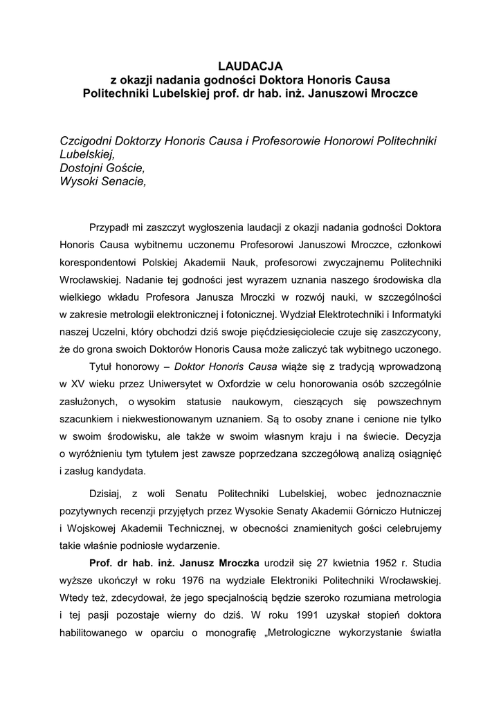 LAUDACJA z okazji nadania godności Doktora Honoris Causa Politechniki Lubelskiej prof. dr hab. inż. Januszowi Mroczce Czcigodni Doktorzy Honoris Causa i Profesorowie Honorowi Politechniki Lubelskiej, Dostojni Goście, Wysoki Senacie, Przypadł mi zaszczyt wygłoszenia laudacji z okazji nadania godności Doktora Honoris Causa wybitnemu uczonemu Profesorowi Januszowi Mroczce, członkowi korespondentowi Polskiej Akademii Nauk, profesorowi zwyczajnemu Politechniki Wrocławskiej. Nadanie tej godności jest wyrazem uznania naszego środowiska dla wielkiego wkładu Profesora Janusza Mroczki w rozwój nauki, w szczególności w zakresie metrologii elektronicznej i fotonicznej. Wydział Elektrotechniki i Informatyki naszej Uczelni, który obchodzi dziś swoje pięćdziesięciolecie czuje się zaszczycony, że do grona swoich Doktorów Honoris Causa może zaliczyć tak wybitnego uczonego. Tytuł honorowy – Doktor Honoris Causa wiąże się z tradycją wprowadzoną w XV wieku przez Uniwersytet w Oxfordzie w celu honorowania osób szczególnie zasłużonych, o wysokim statusie naukowym, cieszących się powszechnym szacunkiem i niekwestionowanym uznaniem. Są to osoby znane i cenione nie tylko w swoim środowisku, ale także w swoim własnym kraju i na świecie. Decyzja o wyróżnieniu tym tytułem jest zawsze poprzedzana szczegółową analizą osiągnięć i zasług kandydata. Dzisiaj, z woli Senatu Politechniki Lubelskiej, wobec jednoznacznie pozytywnych recenzji przyjętych przez Wysokie Senaty Akademii Górniczo Hutniczej i Wojskowej Akademii Technicznej, w obecności znamienitych gości celebrujemy takie właśnie podniosłe wydarzenie. Prof. dr hab. inż. Janusz Mroczka urodził się 27 kwietnia 1952 r. Studia wyższe ukończył w roku 1976 na wydziale Elektroniki Politechniki Wrocławskiej. Wtedy też, zdecydował, że jego specjalnością będzie szeroko rozumiana metrologia i tej pasji pozostaje wierny do dziś. W roku 1991 uzyskał stopień doktora habilitowanego w oparciu o monografię „Metrologiczne wykorzystanie światła rozproszonego do badań rozkładu cząstek w roztworach dyspersyjnych”. Już po pięciu latach, w 1996 r. uzyskał tytuł naukowy profesora nauk technicznych. W roku 1991 został wybrany na stanowisko dyrektora Instytutu Metrologii Elektrycznej Politechniki Wrocławskiej – funkcję tę pełnił do roku 1996. W roku 1998 z inicjatywy prof. Mroczki na Wydziale Elektroniki powstała Katedra Metrologii Elektronicznej i Fotonicznej, którą Profesor nieprzerwanie kieruje do dnia dzisiejszego. Prof. Janusza Mroczkę można śmiało nazwać człowiekiem renesansu z uwagi na rozległość obszaru jego zainteresowań i posiadanej wiedzy z takich dziedzin, dyscyplin i specjalności jak: elektronika, optoelektronika, metrologia, fizyka ciała stałego, matematyka, w tym głęboka znajomość równań całkowych, procesy stochastyczne, współczesne metody analizy sygnałów, filozofia, wybrane działy medycyny i bioinżynierii. To doskonałe przygotowanie pozwala mu na realizację, również w zespołach, które tworzy, szeregu poważnych problemów naukowych dotyczących między innymi: wykorzystania zjawisk optycznych do celów pomiarowych, rozwiązywania problemów odwrotnych w naukach empirycznych, pomiarów pośrednich źle uwarunkowanych numerycznie, opracowania metody momentów w analizie układów dyspersyjnych. Liczne tematy naukowe realizowane w zespole prof. Mroczki pozwalają na stwierdzenie, że Profesor jest twórcą poważnej szkoły naukowej znanej zarówno w kraju, jak i zagranicą. Przybliżenie Szanownym Uczestnikom dzisiejszej uroczystości istoty działalności badawczej Profesora Mroczki nie jest zadaniem łatwym. Próżno szukać terminu „metrologia” w zdefiniowanym w stosownym rozporządzeniu wykazie obszarów, dziedzin i dyscyplin. Z drugiej strony istnieje niemała grupa inżynierów i uczonych mówiących o sobie „jestem metrologiem”. Uczeni Ci spotykają się na kongresach i seminariach – jednym słowem ta tajemnicza metrologia łączy ich silnie pomimo zróżnicowanego wykształcenia pierwotnego – metrologami są elektrycy, elektronicy, fizycy, mechanicy, automatycy, metrologią zajmują również matematycy. Pozwalając sobie na odrobinę humoru można przytoczyć anegdotę o znajomym pewnego metrologa, który powiedział o nim „och … metrolog – to jak Ci idzie stary to przepowiadanie pogody….”. Już całkowicie poważnie możemy stwierdzić, że metrologia to nauka dotycząca sposobów dokonywania pomiarów oraz zasad interpretacji uzyskanych wyników. A tych pomiarów jest wokół nas znacznie więcej niż z pozoru mogłoby się wydawać. Pomiar czasu od wieków reguluje bieg naszego życia, bardzo precyzyjny pomiar czasu dokonywany przez systemy GPS pozycjonuje miejsce naszego położenia i wskazuje drogę do celu. Wyniki pomiarów stanu naszego organizmu – ciśnienia, tętna, temperatury, poziomu cukru i hemoglobiny pozwalają zidentyfikować stan chorobowy. Wagi sklepowe i kuchenne wskazują ilości pożywienia które kupujemy i spożywamy. Liczniki energii elektrycznej i cieplnej, gazomierze, wodomierze wyceniają zużycie odpowiednich mediów przez odbiorców. Oprócz pomiarów, których wyniki świadomie odczytujemy i interpretujemy, ich niezliczona liczba działa w otaczającym nas środowisku, w którym w pętlach sprzężenia zwrotnego zachodzi regulacja – temperatury, wilgotności, prędkości, napięcia, prądu, ilości powietrza, paliwa itp. Jak wiec widzimy pomiar jest wszechobecny w otaczającym nas świecie – a jego jakość rozumiana jako dokładność, dostępność, szybkość powtarzalność ma zasadnicze znaczenia dla naszego funkcjonowania, czy nawet szerzej dla naszego życia. W tym bardzo szerokim rozumieniu terminu metrologia należy wyróżnić obszar szczególnie bliski Profesorowi Mroczce – optoelektronikę. Mówiąc w ogromnym uproszczeniu światło, czyli pewien specyficzny rodza