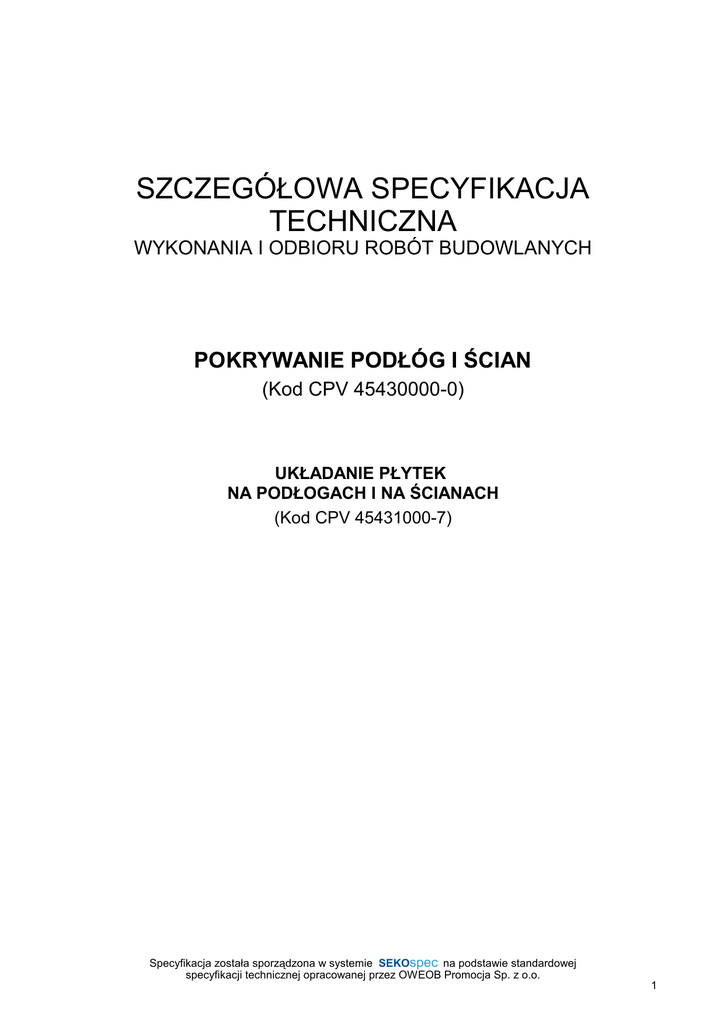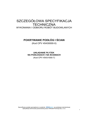 SZCZEGÓŁOWA SPECYFIKACJA TECHNICZNA WYKONANIA I ODBIORU ROBÓT BUDOWLANYCH POKRYWANIE PODŁÓG I ŚCIAN (Kod CPV 45430000-0) UKŁADANIE PŁYTEK NA PODŁOGACH I NA ŚCIANACH (Kod CPV 45431000-7) Specyfikacja została sporządzona w systemie SEKOspec SEKOspec na podstawie standardowej specyfikacji technicznej OWEOB opracowanej Promocjaprzez Sp. zOWEOB o.o. 2005Promocja Sp. z o.o. 1 SPIS TREŚCI 1. CZĘŚĆ OGÓLNA 2. WYMAGANIA DOTYCZĄCE WŁAŚCIWOŚCI MATERIAŁÓW 3. WYMAGANIA DOTYCZĄCE SPRZĘTU, MASZYN I NARZĘDZI 4. WYMAGANIA DOTYCZĄCE TRANSPORTU 5. WYMAGANIA DOTYCZĄCE WYKONANIA ROBÓT 6. KONTROLA JAKOŚCI ROBÓT 7. WYMAGANIA DOTYCZĄCE PRZEDMIARU I OBMIARU ROBÓT 8. SPOSÓB ODBIORU ROBÓT 9. PODSTAWA ROZLICZENIA ROBÓT PODSTAWOWYCH, TYMCZASOWYCH I PRAC TOWARZYSZĄCYCH 10. DOKUMENTY ODNIESIENIA NajwaŜniejsze oznaczenia i skróty: ST – Specyfikacja Techniczna SST – Szczegółowa Specyfikacja Techniczna ITB – Instytut Techniki Budowlanej PZJ – Program Zabezpieczenia Jakości Specyfikacja została sporządzona w systemie SEKOspec SEKOspec na podstawie standardowej specyfikacji technicznej OWEOB opracowanej Promocjaprzez Sp. zOWEOB o.o. 2005Promocja Sp. z o.o. 2 1. CZĘŚĆ OGÓLNA 1.1. Nazwa nadana zamówieniu przez zamawiającego PRZEBUDOWA INTERNATU POLEGAJACA NA WYPOSAśENIU POKOJÓW W INDYWIDUALNE WĘZŁY SANITARNE w budynku internatu Zespołu Szkół Centrum Kształcenia Rolniczego w Widzewie 1.2. Przedmiot SST Przedmiotem niniejszej szczególowej specyfikacji technicznej (SST) są wymagania dotyczące wykonania i odbioru robót posadzkowych i okładzinowych z płytek przy uŜyciu kompozycji klejowych z mieszanek przygotowanych fabrycznie w budownictwie uŜyteczności publicznej . Roboty ww będą wykonywane w pomieszczeniach Internatu ZSCKR w Widzewie, Ksawerów ul. Szkolna 12 1.3. Zakres stosowania SST Odstępstwa od wymagań podanych w niniejszej specyfikacji mogą mieć miejsce tylko w przypadkach prostych robót o niewielkim znaczeniu, dla których istnieje pewność, Ŝe podstawowe wymagania będą spełnione przy zastosowaniu metod wykonania wynikających z doświadczenia oraz uznanych reguł i zasad sztuki budowlanej oraz przy uwzględnieniu przepisów bhp. 1.4. Przedmiot i zakres robót objętych SST Roboty, których dotyczy specyfikacja, obejmują wszystkie czynności mające na celu wykonanie: – pokrycie podłóg płytkami (posadzki), które stanowią wierzchni element warstw podłogowych, – pokrycie ścian płytkami (okładziny), które stanowią warstwę ochronną i kształtującą formę architektoniczną okładanych elementów. Specyfikacja obejmuje wykonanie posadzek i okładzin przy uŜyciu kompozycji klejowych z mieszanek przygotowanych fabrycznie. Zakres opracowania obejmuje określenie wymagań odnośnie własności materiałów, wymagań i sposobów oceny podłoŜy, wykonanie posadzek i okładzin wewnętrznych i zewnętrznych z płytek, oraz ich odbiory. 1.5. Określenia podstawowe, definicje Określenia podane w niniejszej Specyfikacji są zgodne z odpowiednimi normami oraz określeniami podanymi w ST „Wymagania ogólne” Kod CPV 45000000-7, pkt 1.4, a takŜe podanymi poniŜej: PodłoŜe – element budynku, na powierzchni którego wykonane będą roboty posadzkowe i okładzinowe z płytek. Warstwa wyrównawcza – warstwa wykonana w celu wyeliminowania nierówności lub róŜnic poziomów powierzchni podłoŜa. Warstwa wygładzająca – cienka warstwa wykonana dla uzyskania gładkiej powierzchni podłoŜa. Warstwa gruntująca – powłoka wzmacniająca i uszczelniająca podłoŜe oraz zwiększająca przyczepność powłoki ochronnej. Faseta – wyoblenie wykonane na połączeniu powierzchni poziomych i pionowych. 1.6. Ogólne wymagania dotyczące robót posadzkowych i okładzinowych Wykonawca robót jest odpowiedzialny za jakość ich wykonania oraz za zgodność z dokumentacją projektową, specyfikacjami technicznymi i poleceniami Inspektora nadzoru. Ogólne powszechnie stosowane wymagania dotyczące robót podano w ST „Wymagania ogólne” Kod CPV 45000000-7, pkt. 1.5. Specyfikacja została sporządzona w systemie SEKOspec SEKOspec na podstawie standardowej specyfikacji technicznej OWEOB opracowanej Promocjaprzez Sp. zOWEOB o.o. 2005Promocja Sp. z o.o. 3 1.7. Dokumentacja robót posadzkowych i okładzinowych Roboty posadzkowe i okładzinowe naleŜy wykonać na podstawie przedmiaru robót i projektu budowlanego Przy wykonywaniu tych robót naleŜy wykorzystać takŜe: wytyczne Zamawiajacego co do kolorystyki płytek i sposobu układania Zalecenia inspektora co do sposobu przygotowania podłoŜa ( kazdorazowo do ustalenia po zdjęciu okładzin wierzchnich) 2. WYMAGANIA DOTYCZĄCE WŁAŚCIWOŚCI MATERIAŁÓW 2.1. Ogólne wymagania dotyczące właściwości materiałów, ich pozyskiwania i składowania podano w ST „Wymagania ogólne” Kod CPV 45000000-7, pkt 2 Wykonawca obowiązany jest posiadać na budowie pełną dokumentację dotyczącą składanych na budowie materiałów przeznaczonych do wykonania robót posadzkowych i okładzinowych. 2.2. Rodzaje materiałów Wszystkie materiały do wykonania robót posadzkowych i okładzinowych z płytek powinny odpowiadać wymaganiom zawartym w dokumentach odniesienia (normach, aprobatach technicznych). 2.2.1.Płyty i płytki Płytki powinny odpowiadać następującej normie: – PN-EN 14411:2005 – Płytki i płyty ceramiczne – Definicja, klasyfikacja, charakterystyki i znakowanie. Płytki stosowane w ww pracach powinny spełniac następujące wymagania: dla podłóg - gres antypoślizgowy niepolerowany o stopniu min R9 , w minimum 4 klasie odporności na sciaranie , w klasie nasiąkliwości AI lub BI ( mrozoodporne) Ponadto dla płytek zarówno podłogowych jak i sciennych w toaletach podwyŜszona odporność na kwasy i zasady 2.2.2.Kompozycje klejące i zaprawy Kompozycje klejące do mocowania płytek muszą spełniać wymagania normy PN-EN 12004:2002 lub odpowiednich aprobat technicznych