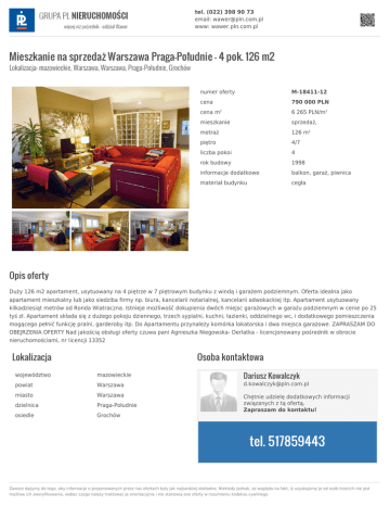 tel. (022) 398 90 73 email: [email protected] www: wawer.pln.com.pl Mieszkanie na sprzedaż Warszawa Praga-Południe - 4 pok. 126 m2 Lokalizacja: mazowieckie, Warszawa, Warszawa, Praga-Południe, Grochów numer oferty M-18411-12 cena 790 000 PLN cena m 6 265 PLN/m2 mieszkanie sprzedaż, metraż 126 m2 piętro 4/7 liczba pokoi 4 rok budowy 1998 informacje dodatkowe balkon, garaż, piwnica materiał budynku cegła 2 Opis oferty Duży 126 m2 apartament, usytuowany na 4 piętrze w 7 piętrowym budynku z windą i garażem podziemnym. Oferta idealna jako apartament mieszkalny lub jako siedziba firmy np. biura, kancelarii notarialnej, kancelarii adwokackiej itp. Apartament usytuowany kilkadziesiąt metrów od Ronda Wiatraczna. Istnieje możliwość dokupienia dwóch miejsc garażowych w garażu podziemnym w cenie po 25 tyś zł. Apartament składa się z dużego pokoju dziennego, trzech sypialni, kuchni, łazienki, oddzielnego wc, i dodatkowego pomieszczenia mogącego pełnić funkcję pralni, garderoby itp. Do Apartamentu przynależy komórka lokatorska i dwa miejsca garażowe. ZAPRASZAM DO OBEJRZENIA OFERTY Nad jakością obsługi oferty czuwa pani Agnieszka Niegowska- Derlatka - licencjonowany pośrednik w obrocie nieruchomościami, nr licencji 13352 Lokalizacja Osoba kontaktowa Dariusz Kowalczyk województwo mazowieckie powiat Warszawa [email protected] miasto Warszawa dzielnica Praga-Południe osiedle Grochów Chętnie udzielę dodatkowych informacji związanych z tą ofertą. Zapraszam do kontaktu! tel. 517859443 Zawsze dążymy do tego, aby informacje o proponowanych przez nas ofertach były jak najbardziej dokładne. Niekiedy jednak, ze względu na fakt, iż uzyskujemy je od osób trzecich nie jest możliwe ich zweryfikowanie, wobec czego należy traktować je orientacyjnie i nie stanowią one oferty w rozumieniu kodeksu cywilnego.