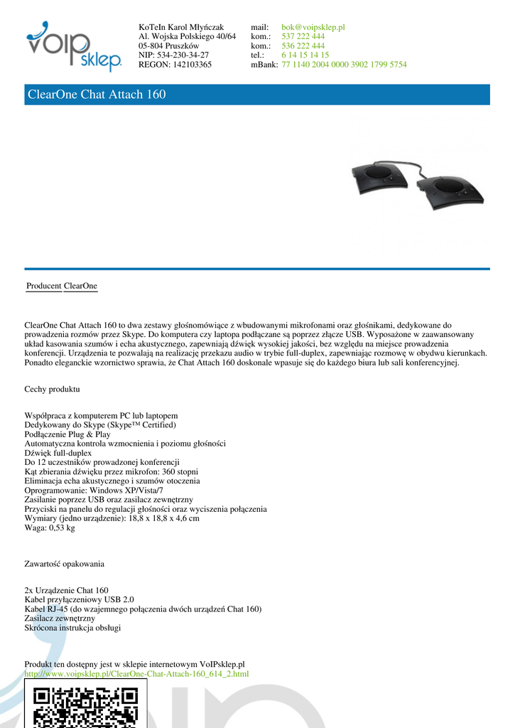 KoTeIn Karol Młyńczak Al. Wojska Polskiego 40/64 05-804 Pruszków NIP: 534-230-34-27 REGON: 142103365 mail: kom.: kom.: tel.: mBank: [email protected] 537 222 444 536 222 444 6 14 15 14 15 77 1140 2004 0000 3902 1799 5754 ClearOne Chat Attach 160 Producent ClearOne ClearOne Chat Attach 160 to dwa zestawy głośnomówiące z wbudowanymi mikrofonami oraz głośnikami, dedykowane do prowadzenia rozmów przez Skype. Do komputera czy laptopa podłączane są poprzez złącze USB. Wyposażone w zaawansowany układ kasowania szumów i echa akustycznego, zapewniają dźwięk wysokiej jakości, bez względu na miejsce prowadzenia konferencji. Urządzenia te pozwalają na realizację przekazu audio w trybie full-duplex, zapewniając rozmowę w obydwu kierunkach. Ponadto eleganckie wzornictwo sprawia, że Chat Attach 160 doskonale wpasuje się do każdego biura lub sali konferencyjnej. Cechy produktu Współpraca z komputerem PC lub laptopem Dedykowany do Skype (Skype™ Certified) Podłączenie Plug & Play Automatyczna kontrola wzmocnienia i poziomu głośności Dźwięk full-duplex Do 12 uczestników prowadzonej konferencji Kąt zbierania dźwięku przez mikrofon: 360 stopni Eliminacja echa akustycznego i szumów otoczenia Oprogramowanie: Windows XP/Vista/7 Zasilanie poprzez USB oraz zasilacz zewnętrzny Przyciski na panelu do regulacji głośności oraz wyciszenia połączenia Wymiary (jedno urządzenie): 18,8 x 18,8 x 4,6 cm Waga: 0,53 kg Zawartość opakowania 2x Urządzenie Chat 160 Kabel przyłączeniowy USB 2.0 Kabel RJ-45 (do wzajemnego połączenia dwóch urządzeń Chat 160) Zasilacz zewnętrzny Skrócona instrukcja obsługi Produkt ten dostępny jest w sklepie internetowym VoIPsklep.pl http://www.voipsklep.pl/ClearOne-Chat-Attach-160_614_2.html