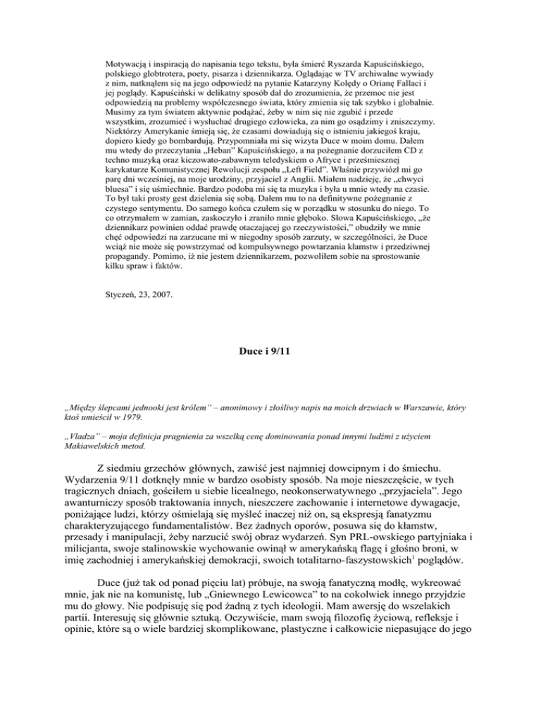 Motywacją i inspiracją do napisania tego tekstu, była śmierć Ryszarda Kapuścińskiego, polskiego globtrotera, poety, pisarza i dziennikarza. Oglądając w TV archiwalne wywiady z nim, natknąłem się na jego odpowiedź na pytanie Katarzyny Kolędy o Orianę Fallaci i jej poglądy. Kapuściński w delikatny sposób dał do zrozumienia, że przemoc nie jest odpowiedzią na problemy współczesnego świata, który zmienia się tak szybko i globalnie. Musimy za tym światem aktywnie podążać, żeby w nim się nie zgubić i przede wszystkim, zrozumieć i wysłuchać drugiego człowieka, za nim go osądzimy i zniszczymy. Niektórzy Amerykanie śmieją się, że czasami dowiadują się o istnieniu jakiegoś kraju, dopiero kiedy go bombardują. Przypomniała mi się wizyta Duce w moim domu. Dałem mu wtedy do przeczytania „Heban” Kapuścińskiego, a na pożegnanie dorzuciłem CD z techno muzyką oraz kiczowato-zabawnym teledyskiem o Afryce i prześmiesznej karykaturze Komunistycznej Rewolucji zespołu „Left Field”. Właśnie przywiózł mi go parę dni wcześniej, na moje urodziny, przyjaciel z Anglii. Miałem nadzieję, że „chwyci bluesa” i się uśmiechnie. Bardzo podoba mi się ta muzyka i była u mnie wtedy na czasie. To był taki prosty gest dzielenia się sobą. Dałem mu to na definitywne pożegnanie z czystego sentymentu. Do samego końca czułem się w porządku w stosunku do niego. To co otrzymałem w zamian, zaskoczyło i zraniło mnie głęboko. Słowa Kapuścińskiego, „że dziennikarz powinien oddać prawdę otaczającej go rzeczywistości,” obudziły we mnie chęć odpowiedzi na zarzucane mi w niegodny sposób zarzuty, w szczególności, że Duce wciąż nie może się powstrzymać od kompulsywnego powtarzania kłamstw i przedziwnej propagandy. Pomimo, iż nie jestem dziennikarzem, pozwoliłem sobie na sprostowanie kilku spraw i faktów. Styczeń, 23, 2007. Duce i 9/11 „Między ślepcami jednooki jest królem” – anonimowy i złośliwy napis na moich drzwiach w Warszawie, który ktoś umieścił w 1979. „Vladza” – moja definicja pragnienia za wszelką cenę dominowania ponad innymi ludźmi z użyciem Makiawelskich metod. Z siedmiu grzechów głównych, zawiść jest najmniej dowcipnym i do śmiechu. Wydarzenia 9/11 dotknęły mnie w bardzo osobisty sposób. Na moje nieszczęście, w tych tragicznych dniach, gościłem u siebie licealnego, neokonserwatywnego „przyjaciela”. Jego awanturniczy sposób traktowania innych, nieszczere zachowanie i internetowe dywagacje, poniżające ludzi, którzy ośmielają się myśleć inaczej niż on, są ekspresją fanatyzmu charakteryzującego fundamentalistów. Bez żadnych oporów, posuwa się do kłamstw, przesady i manipulacji, żeby narzucić swój obraz wydarzeń. Syn PRL-owskiego partyjniaka i milicjanta, swoje stalinowskie wychowanie owinął w amerykańską flagę i głośno broni, w imię zachodniej i amerykańskiej demokracji, swoich totalitarno-faszystowskich1 poglądów. Duce (już tak od ponad pięciu lat) próbuje, na swoją fanatyczną modłę, wykreować mnie, jak nie na komunistę, lub „Gniewnego Lewicowca” to na cokolwiek innego przyjdzie mu do głowy. Nie podpisuję się pod żadną z tych ideologii. Mam awersję do wszelakich partii. Interesuję się głównie sztuką. Oczywiście, mam swoją filozofię życiową, refleksje i opinie, które są o wiele bardziej skomplikowane, plastyczne i całkowicie niepasujące do jego kwadratowych szuflad. Jestem bardziej zafascynowany dziennikarstwem i pisarstwem Ryszarda Kapuścińskiego, niż faszystowską retoryką „doskonałego człowieka.” Zabawną rzeczą w jego opisie mnie jako komunisty i gniewnego lewicowca jest fakt, że na początku lat ‘80tych wciąż w PRL, kiedy wynajmował ze swoją siostrą 2pokój u mojej ex żony i mnie, nazwał mnie „krwawym kapitalistą.” Tak się złożyło, że byliśmy właścicielami małego interesu biżuteryjnego. Nagle w Stanach stałem się „komuchem”. Skąd ta zmiana? Teraz fundamentalni „islamofaszyści” i „Gniewna Lwica” są celem jego zaciekłych ataków. Tak długo jak go znam, z powodu ojca, zawsze musiał ”przewietrzać” swoją agresję. Wiem, że dlatego w licealnych czasach, uciekł z domu i zamieszkał u mnie. Mój ojciec pracował wtedy w Austrii. Wcześniej tego samego dnia w Portland byliśmy razem w Laurel Hurst Park, gdzie zadałem mu dwa pytania, na które znałem jego sprzed wielu lat wcześniejszą odpowiedź. Pierwsze czy był bity przez swojego ojca i drugie czy zdradził kiedykolwiek swoją żonę? Na obydwa odpowiedział przecząco patrząc mi prosto w oczy. To było, muszę przyznać, bardzo nieprzyjemne uczucie. Kłamał albo wtedy w czasach licealnych, albo tego dnia w parku. Wtedy, kiedy wprowadził się do mojego ojca, musiałem swojemu ojcu i ciotce, która specjalnie w związku z tym pofatygowała się z Wrocławia, przysiąc, że nigdy nie będę opowiadał Duce o nielegalnej drukarni, na której i ja drukowałem jako 10 letni chłopiec mieszkając we Wrocławiu. Oni znając jego pochodzenia, obawiali się go jak ognia. Obietnicy dotrzymałem. Nigdy nie dowiedział się ani o tej działalności, ani o tym, co działo się później w Radomiu. I Bogu dzięki za takich ludzi jak moja rodzina, dzisiaj myślę, że Duce był wysłany przez swojego ojca do mojego domu. Mój ojciec w tamtych czasach pracował w Austrii i patrząc z perspektywy lat na jego zachowanie i co wypisuje na swoich stronach i blogu, myślę, że Duce zamieszkał z nami w ramach komunistycznej inwigilacji. Jest człowiekiem bez skrupułów, wykształcony w komunistycznej propagandzie dziennikarskiej, gotowy dojść "po trupach" do kariery. Ta cała jego blogowa pisanina jest zacieraniem śladów. W PRL wychwalał system komunistyczny, teraz wiatr mu wieje w inna stronę. Dla mnie jest to szokujące, człowiek bez sumienia, skrajny hipokryta i manipulant. Tak właśnie wychował 