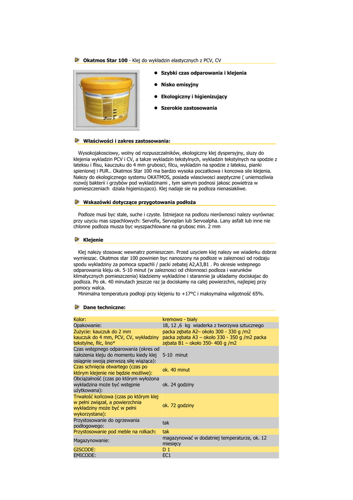 Okatmos Star 100 - Klej do wykładzin elastycznych z PCV, CV Szybki czas odparowania i klejenia Nisko emisyjny Ekologiczny i higienizujący Szerokie zastosowania Właściwości i zakres zastosowania: Wysokojakosciowy, wolny od rozpuszczalników, ekologiczny klej dyspersyjny, sluzy do klejenia wykladzin PCV i CV, a takze wykladzin tekstylnych, wykladzin tekstylnych na spodzie z lateksu i flisu, kauczuku do 4 mm grubosci, filcu, wykladzin na spodzie z lateksu, pianki spienionej i PUR.. Okatmos Star 100 ma bardzo wysoka poczatkowa i koncowa sile klejenia. Nalezy do ekologicznego systemu OKATMOS, posiada wlasciwosci aseptyczne ( uniemozliwia rozwój bakterii i grzybów pod wykladzinami , tym samym podnosi jakosc powietrza w pomieszczeniach dziala higienizujaco). Klej nadaje sie na podloza nienasiakliwe. Wskazówki dotyczące przygotowania podłoża Podloze musi byc stale, suche i czyste. Istniejace na podlozu nierównosci nalezy wyrównac przy uzyciu mas szpachlowych: Servofix, Servoplan lub Servoalpha. Lany asfalt lub inne nie chlonne podloza musza byc wyszpachlowane na grubosc min. 2 mm Klejenie Klej nalezy stosowac wewnatrz pomieszczen. Przed uzyciem klej nalezy we wiaderku dobrze wymieszac. Okatmos star 100 powinien byc nanoszony na podloze w zaleznosci od rodzaju spodu wykladziny za pomoca szpachli / packi zebatej A2,A3,B1 . Po okresie wstepnego odparowania kleju ok. 5-10 minut (w zaleznosci od chlonnosci podloza i warunków klimatycznych pomieszczenia) kladziemy wykladzine i starannie ja ukladamy dociskajac do podloza. Po ok. 40 minutach jeszcze raz ja dociskamy na calej powierzchni, najlepiej przy pomocy walca. Minimalna temperatura podłogi przy klejeniu to +17°C i maksymalna wilgotność 65%. Dane techniczne: Kolor: Opakowanie: Zużycie: kauczuk do 2 mm kauczuk do 4 mm, PCV, CV, wykładziny tekstylne, filc, lino* Czas wstępnego odparowania (okres od nałożenia kleju do momentu kiedy klej osiągnie swoją pierwszą siłę wiążąca): Czas schnięcia otwartego (czas po którym klejenie nie będzie możliwe): Obciążalność (czas po którym wyłożona wykładzina może być wstępnie użytkowana): Trwałość końcowa (czas po którym klej w pełni związał, a powierzchnia wykładziny może być w pełni wykorzystana): Przystosowanie do ogrzewania podłogowego: Przystosowanie pod meble na rolkach: Magazynowanie: GISCODE: EMICODE: kremowo - biały 18, 12 ,6 kg wiaderka z tworzywa sztucznego packa zębata A2– około 300 - 330 g /m2 packa zębata A3 – około 330 - 350 g /m2 packa zębata B1 – około 350- 400 g /m2 5-10 minut ok. 40 minut ok. 24 godziny ok. 72 godziny tak tak magazynować w dodatniej temperaturze, ok. 12 miesięcy D1 EC1 Narzędzia szpachla / packa zębata A2 szpachla / packa zębata A3 szpachla / packa zębata B1 Czyszczenie narzędzi Narzędzia czyścić wodą Palety 32 x 18 kg wiaderka z tworzywa sztucznego 33 x 12 kg wiaderka z tworzywa sztucznego Powyższe dane, przygotowanie i zastosowanie produktu oparto na naszej wiedzy i doświadczeniu. Z powodu różnych niezależnych od nas czynników, np. nietypowe podłoża, warunki zewnętrzne, zalecamy przeprowadzenie własnych prób, aby stwierdzić, czy nasz produkt nadaje się do danego postępowania. Firma Kiesel Polska nie ponosi odpowiedzialności z tego powodu.