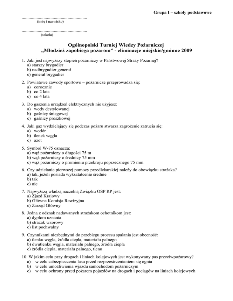 Grupa I – szkoły podstawowe ......................................................... (imię i nazwisko) ......................................................... (szkoła) Ogólnopolski Turniej Wiedzy Pożarniczej „Młodzież zapobiega pożarom” - eliminacje miejskie/gminne 2009 1. Jaki jest najwyższy stopień pożarniczy w Państwowej Straży Pożarnej? a) starszy brygadier b) nadbrygadier generał c) generał brygadier 2. Powiatowe zawody sportowo – pożarnicze przeprowadza się: a) corocznie b) co 2 lata c) co 4 lata 3. Do gaszenia urządzeń elektrycznych nie użyjesz: a) wody destylowanej b) gaśnicy śniegowej c) gaśnicy proszkowej 4. Jaki gaz wydzielający się podczas pożaru stwarza zagrożenie zatrucia się: a) wodór b) tlenek węgla c) azot 5. Symbol W-75 oznacza: a) wąż pożarniczy o długości 75 m b) wąż pożarniczy o średnicy 75 mm c) wąż pożarniczy o promieniu przekroju poprzecznego 75 mm 6. Czy udzielanie pierwszej pomocy przedlekarskiej należy do obowiązku strażaka? a) tak, jeżeli posiada wykształcenie średnie b) tak c) nie 7. Najwyższą władzą naczelną Związku OSP RP jest: a) Zjazd Krajowy b) Główna Komisja Rewizyjna c) Zarząd Główny 8. Jedną z odznak nadawanych strażakom ochotnikom jest: a) dyplom uznania b) strażak wzorowy c) list pochwalny 9. Czynnikami niezbędnymi do przebiegu procesu spalania jest obecność: a) tlenku węgla, źródła ciepła, materiału palnego b) dwutlenku węgla, materiału palnego, źródła ciepła c) źródła ciepła, materiału palnego, tlenu 10. W jakim celu przy drogach i liniach kolejowych jest wykonywany pas przeciwpożarowy? a) w celu zabezpieczenia lasu przed rozprzestrzenianiem się ognia b) w celu umożliwienia wjazdu samochodom pożarniczym c) w celu ochrony przed pożarem pojazdów na drogach i pociągów na liniach kolejowych 11. Jaka jest zasada uruchamiania kuchenki gazowej? a) najpierw otwieramy kurek gazu a następnie zapalmy zapałkę b) najpierw zapalamy zapałkę a następnie otwieramy kurek gazu c) otwieramy kurek gazu i po odczekaniu ok. 15 sekund zapalamy zapałkę 12. Centralne Muzeum Pożarnictwa zlokalizowane jest w: a) Warszawie b) Mysłowicach c) Józefowie 13. W zależności od wielkości pożary dzielimy na: a) A, B, C, D, F b) małe, średnie, duże, bardzo duże c) małe, lokalne, duże, katastroficzne 14. Ile wyróżniamy kategorii zagrożenia pożarowego lasów? a) 3 b) 4 c) 5 15. Miesięcznik „Przegląd pożarniczy” ukazuje się od: a) 1912 r. b) 1925 r. c) 1945 r. 16. Podstawowym dokumentem normującym organizację Związku OSP RP jest: a) regulamin b) statut c) uchwała 17. Podstawowym składnikiem gazu ziemnego jest: a) etan b) metan c) propan - butan 18. Kadencja władz Zarządu Głównego Związku OSP RP trwa: a) 2 lata b) 3 lata c) 5 lat 19. Zamykanie drzwi ewakuacyjnych w sposób uniemożliwiający ich natychmiastowe użycie jest: a) dozwolone pod warunkiem pozostawienia klucza w zamku b) dozwolone w każdym przypadku c) zabronione 20. Z jakich pomieszczeń powinny być zapewnione co najmniej dwa wyjścia ewakuacyjne? a) z przeznaczonych do jednoczesnego przebywania w nich powyżej 30 osób b) z przeznaczonych do jednoczesnego przebywania w nich powyżej 50 osób c) z przeznaczonych do jednoczesnego przebywania w nich powyżej 6 osób