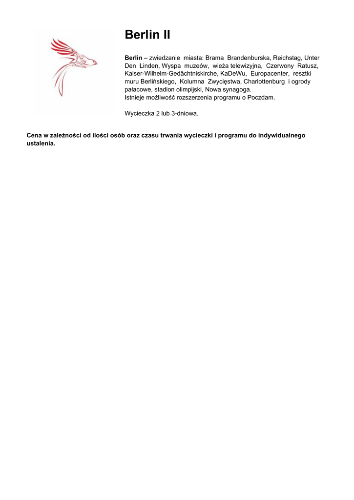 Berlin II Berlin – zwiedzanie miasta: Brama Brandenburska, Reichstag, Unter Den Linden, Wyspa muzeów, wieża telewizyjna, Czerwony Ratusz, Kaiser-Wilhelm-Gedächtniskirche, KaDeWu, Europacenter, resztki muru Berlińskiego, Kolumna Zwycięstwa, Charlottenburg i ogrody pałacowe, stadion olimpijski, Nowa synagoga. Istnieje możliwość rozszerzenia programu o Poczdam. Wycieczka 2 lub 3-dniowa. Cena w zależności od ilości osób oraz czasu trwania wycieczki i programu do indywidualnego ustalenia.