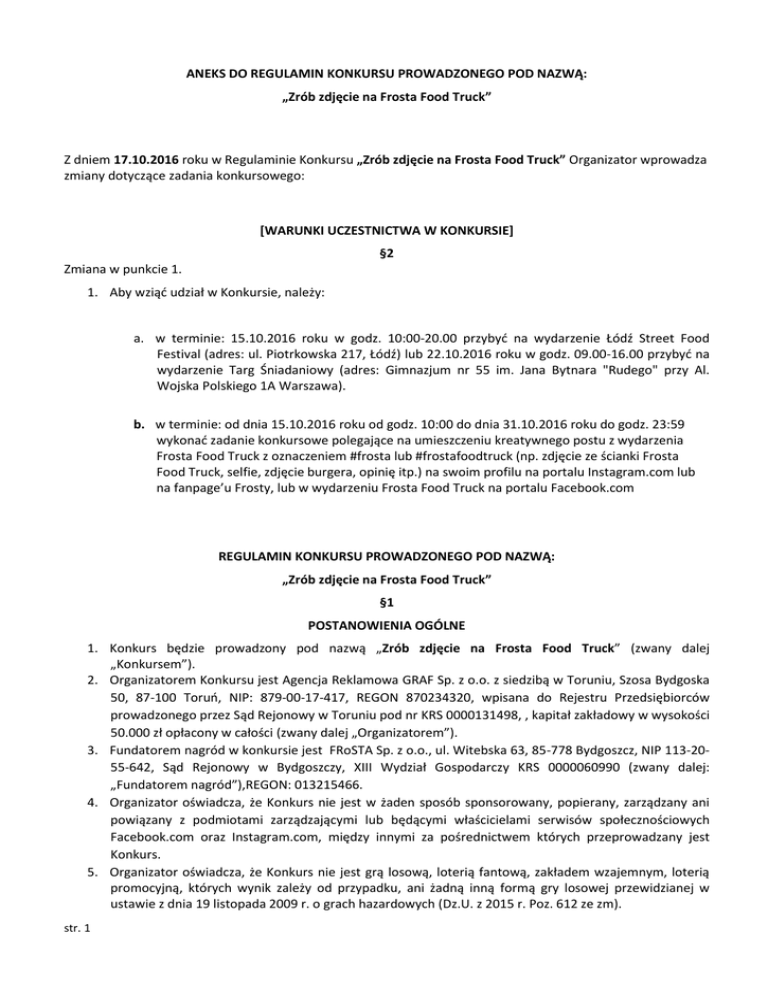 ANEKS DO REGULAMIN KONKURSU PROWADZONEGO POD NAZWĄ: „Zrób zdjęcie na Frosta Food Truck” Z dniem 17.10.2016 roku w Regulaminie Konkursu „Zrób zdjęcie na Frosta Food Truck” Organizator wprowadza zmiany dotyczące zadania konkursowego: [WARUNKI UCZESTNICTWA W KONKURSIE] §2 Zmiana w punkcie 1. 1. Aby wziąć udział w Konkursie, należy: a. w terminie: 15.10.2016 roku w godz. 10:00-20.00 przybyć na wydarzenie Łódź Street Food Festival (adres: ul. Piotrkowska 217, Łódź) lub 22.10.2016 roku w godz. 09.00-16.00 przybyć na wydarzenie Targ Śniadaniowy (adres: Gimnazjum nr 55 im. Jana Bytnara "Rudego" przy Al. Wojska Polskiego 1A Warszawa). b. w terminie: od dnia 15.10.2016 roku od godz. 10:00 do dnia 31.10.2016 roku do godz. 23:59 wykonać zadanie konkursowe polegające na umieszczeniu kreatywnego postu z wydarzenia Frosta Food Truck z oznaczeniem #frosta lub #frostafoodtruck (np. zdjęcie ze ścianki Frosta Food Truck, selfie, zdjęcie burgera, opinię itp.) na swoim profilu na portalu Instagram.com lub na fanpage’u Frosty, lub w wydarzeniu Frosta Food Truck na portalu Facebook.com REGULAMIN KONKURSU PROWADZONEGO POD NAZWĄ: „Zrób zdjęcie na Frosta Food Truck” §1 POSTANOWIENIA OGÓLNE 1. Konkurs będzie prowadzony pod nazwą „Zrób zdjęcie na Frosta Food Truck” (zwany dalej „Konkursem”). 2. Organizatorem Konkursu jest Agencja Reklamowa GRAF Sp. z o.o. z siedzibą w Toruniu, Szosa Bydgoska 50, 87-100 Toruń, NIP: 879-00-17-417, REGON 870234320, wpisana do Rejestru Przedsiębiorców prowadzonego przez Sąd Rejonowy w Toruniu pod nr KRS 0000131498, , kapitał zakładowy w wysokości 50.000 zł opłacony w całości (zwany dalej „Organizatorem”). 3. Fundatorem nagród w konkursie jest FRoSTA Sp. z o.o., ul. Witebska 63, 85-778 Bydgoszcz, NIP 113-2055-642, Sąd Rejonowy w Bydgoszczy, XIII Wydział Gospodarczy KRS 0000060990 (zwany dalej: „Fundatorem nagród”),REGON: 013215466. 4. Organizator oświadcza, że Konkurs nie jest w żaden sposób sponsorowany, popierany, zarządzany ani powiązany z podmiotami zarządzającymi lub będącymi właścicielami serwisów społecznościowych Facebook.com oraz Instagram.com, między innymi za pośrednictwem których przeprowadzany jest Konkurs. 5. Organizator oświadcza, że Konkurs nie jest grą losową, loterią fantową, zakładem wzajemnym, loterią promocyjną, których wynik zależy od przypadku, ani żadną inną formą gry losowej przewidzianej w ustawie z dnia 19 listopada 2009 r. o grach hazardowych (Dz.U. z 2015 r. Poz. 612 ze zm). str. 1 6. Uczestnikiem Konkursu może być każda osoba fizyczna, która ukończyła 18. rok życia, zamieszkała na terenie Polski. 7. Administratorem danych osobowych zebranych w czasie trwania niniejszego Konkursu jest Organizator. Uczestnicy mają prawo dostępu do swoich danych osobowych, jak również żądania ich poprawiania lub usunięcia. Podanie danych osobowych jest dobrowolne, choć niezbędne dla prawidłowego przeprowadzenia Konkursu i wydania nagrody. 8. Rozpoczęcie konkursu następuje w dniu: 15.10.2016 o godz. 9:00:00, a zakończenie w dniu 31.10.2016 r. do godz. 23:59. 9. Zgłoszenie udziału w konkursie przed lub po ww. terminie nie uprawnia do wzięcia udziału w Konkursie. 10. W Konkursie nie mogą brać udziału pracownicy Organizatora Konkursu i Fundatora nagród oraz członkowie ich najbliższych rodzin. Przez członków najbliższej rodziny rozumie się wstępnych, rodzeństwo, małżonków oraz dzieci. §2 WARUNKI UCZESTNICTWA W KONKURSIE 2. Aby wziąć udział w Konkursie, należy w terminie: od dnia 15.10.2016 roku od godz. 9:00:00 do dnia 31.10.2016 roku do godz. 23:59 : a. W dniach: 15.10.2016 roku w godzinach 10:00-20:00 oraz 22.10.2016 roku w godzinach od 9:0017:00 wykonać kreatywne zdjęcie z burgerem Frosta na tle ścianki konkursowej Frosta Food Truck. b. w terminie: od dnia 15.10.2016 roku od godz. 10:00 do dnia 31.10.2016 roku do godz. 23:59 wykonać zadanie konkursowe polegające na umieszczeniu wcześniej wykonanego zdjęcia z burgerem na swoim profilu na portalu Instagram.com lub na fanpage’u Frosty na portalu Facebook.com pod adresem www.facebook.com/frosta.polska i oznaczeniu go: #frosta lub #frostafoodtruck. 3. Dodane w ramach wykonania zadania konkursowego zdjęcie musi być wynikiem samodzielnej pracy twórczej Uczestnika i nie może naruszać jakichkolwiek praw osobistych lub majątkowych osób trzecich, a zwłaszcza praw autorskich i/lub nazw handlowych. 4. W Konkursie nie będą uwzględniane: a. zgłoszenia niespełniające warunków wymienionych w pkt 1, 2, 3 tego paragrafu. b. zgłoszenia osób, które biorą udział w Konkursie, posługując się kilkoma Profilami na Facebooku lub Instagramie. c. zgłoszenia uczestników niespełniających warunków określonych w paragrafie 1 pkt. 6 Regulaminu. §3 NAGRODY I ZASADY ICH PRZYZNAWANIA 1. W Konkursie przewidziane zostały następujące nagrody: 1 nagroda główna w postaci aparatu Fujifilm Instax mini o wartości 419 zł (słownie: czterysta dziewiętnaście złotych), wraz z dodatkową nagrodą pieniężną w wysokości 46 zł (czterdzieści sześć złotych) przeznaczoną na zapłacenie podatku od nagrody. 2. Łączna wartość nagród w konkursie wynosi 465 zł (czterysta sześćdziesiąt pięć złotych) brutto. 3. Dodatkowe nagrody pieniężne będące częścią ww. nagród zostaną przeznaczone na zapłatę stosownego podatku od nagrody w Konkursach (art. 30 ust. 1 pkt 2 ustawy o podatku dochodowym od str. 2 osób fizycznych (ustawa z dnia 26 lipca 1991 r.; tekst jednolity Dz.U. z 2012 r. Poz. 361 ze zm)), Organizator potrąci te kwoty przy wydaniu nagród. 4. Wyboru laureatów nagród dokonuje Komisja Konkursowa. Komisja konkursowa składa się z 3 osób – dwóch przedstawicieli Organizatora Konkursu i jednego przedstawiciela Fundatora nagród. 5. W ocenie wykonania zadania konkursowego przez Uczestników Komisja Konkursowa będzie stosowała następujące kryter