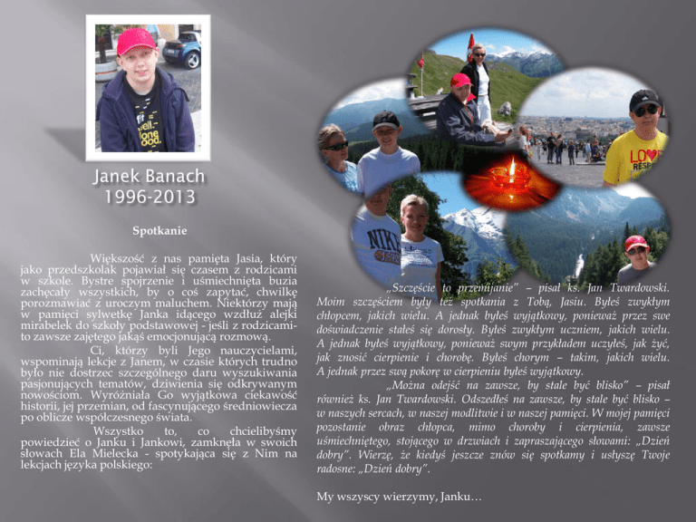 Janek Banach 1996-2013 Spotkanie Większość z nas pamięta Jasia, który jako przedszkolak pojawiał się czasem z rodzicami w szkole. Bystre spojrzenie i uśmiechnięta buzia zachęcały wszystkich, by o coś zapytać, chwilkę porozmawiać z uroczym maluchem. Niektórzy mają w pamięci sylwetkę Janka idącego wzdłuż alejki mirabelek do szkoły podstawowej - jeśli z rodzicamito zawsze zajętego jakąś emocjonującą rozmową. Ci, którzy byli Jego nauczycielami, wspominają lekcje z Janem, w czasie których trudno było nie dostrzec szczególnego daru wyszukiwania pasjonujących tematów, dziwienia się odkrywanym nowościom. Wyróżniała Go wyjątkowa ciekawość historii, jej przemian, od fascynującego średniowiecza po oblicze współczesnego świata. Wszystko to, co chcielibyśmy powiedzieć o Janku i Jankowi, zamknęła w swoich słowach Ela Mielecka - spotykająca się z Nim na lekcjach języka polskiego: „Szczęście to przemijanie” – pisał ks. Jan Twardowski. Moim szczęściem były też spotkania z Tobą, Jasiu. Byłeś zwykłym chłopcem, jakich wielu. A jednak byłeś wyjątkowy, ponieważ przez swe doświadczenie stałeś się dorosły. Byłeś zwykłym uczniem, jakich wielu. A jednak byłeś wyjątkowy, ponieważ swym przykładem uczyłeś, jak żyć, jak znosić cierpienie i chorobę. Byłeś chorym – takim, jakich wielu. A jednak przez swą pokorę w cierpieniu byłeś wyjątkowy. „Można odejść na zawsze, by stale być blisko” – pisał również ks. Jan Twardowski. Odszedłeś na zawsze, by stale być blisko – w naszych sercach, w naszej modlitwie i w naszej pamięci. W mojej pamięci pozostanie obraz chłopca, mimo choroby i cierpienia, zawsze uśmiechniętego, stojącego w drzwiach i zapraszającego słowami: „Dzień dobry”. Wierzę, że kiedyś jeszcze znów się spotkamy i usłyszę Twoje radosne: „Dzień dobry”. My wszyscy wierzymy, Janku…