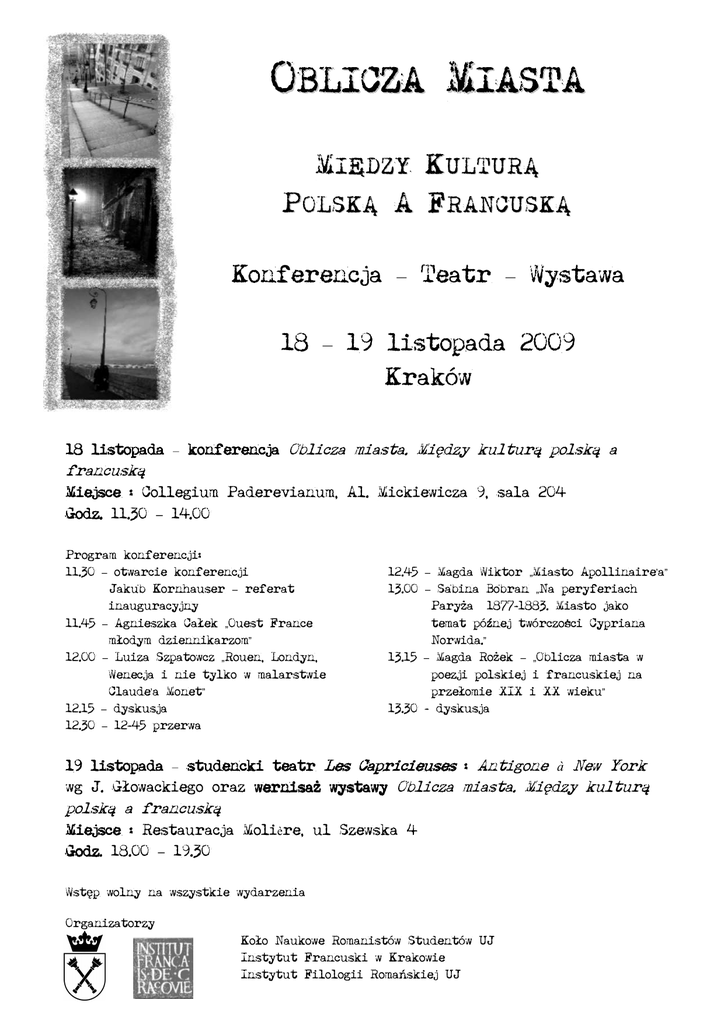 OBLI CZA MIASTA MIĘDZY KULTURĄ POLSKĄ A FRANCUSKĄ Konferencja – Teatr – Wystawa 18 – 19 listopada 2009 Kraków 18 listopada – konferencja Oblicza miasta. Między kulturą polską a francuską Miejsce : Collegium Paderevianum, Al. Mickiewicza 9, sala 204 Godz. 11.30 – 14.00 Program konferencji: 11.30 – otwarcie konferencji Jakub Kornhauser – referat 12.45 – Magda Wiktor „Miasto Apollinaire’a” 13.00 – Sabina Bobran „Na peryferiach Paryża [1877-1883. Miasto jako inauguracyjny temat późnej twórczości Cypriana 11.45 – Agnieszka Całek „Ouest France młodym dziennikarzom” 12.00 – Luiza Szpatowcz „Rouen, Londyn, Norwida.” 13.15 – Magda Rożek – „Oblicza miasta w Wenecja i nie tylko w malarstwie poezji polskiej i francuskiej na Claude’a Monet” przełomie XIX i XX wieku” 12.15 – dyskusja 13.30 - dyskusja 12.30 – 12-45 przerwa 19 listopada – studencki teatr Les Capricieuses : Antigone à New York wg J. Głowackiego oraz wernisaż wystawy Oblicza miasta. Między kulturą polską a francuską Miejsce : Restauracja Molière, ul Szewska 4 Godz. Godz 18.00 – 19.30 Wstęp wolny na wszystkie wydarzenia Organizatorzy Koło Naukowe Romanistów Studentów UJ Instytut Francuski w Krakowie Instytut Filologii Romańskiej UJ