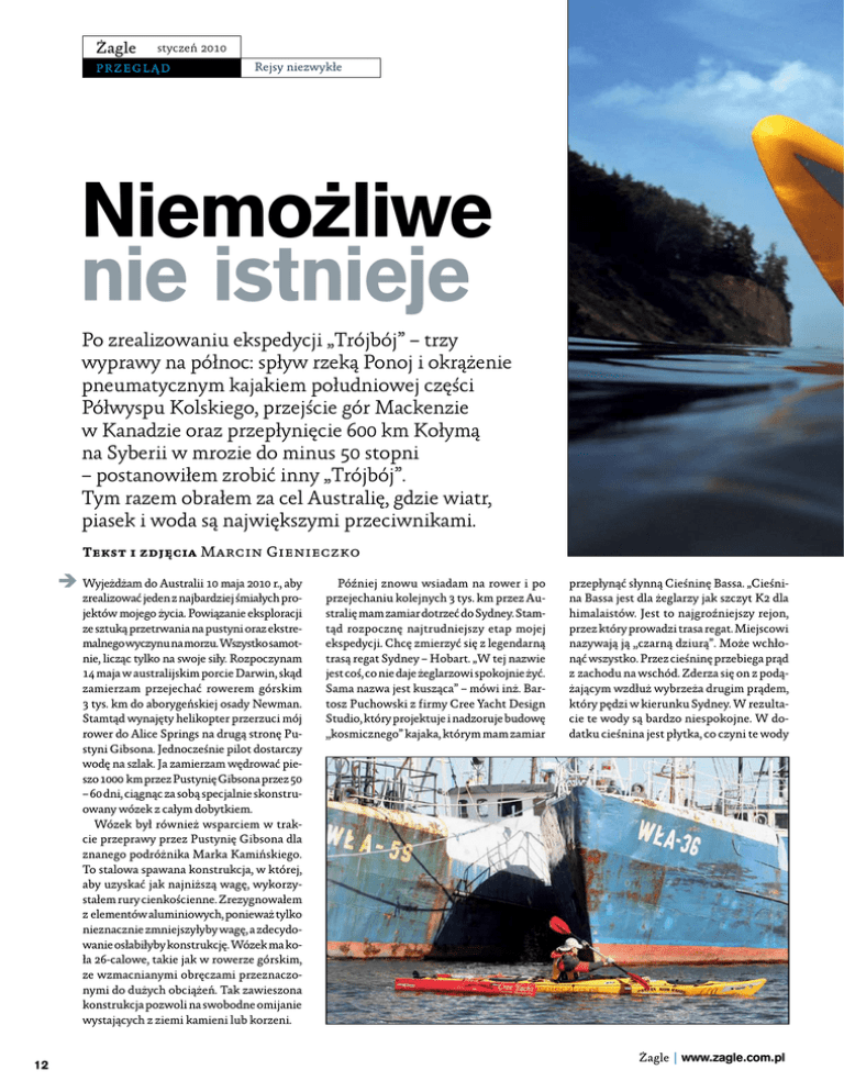 Żagle styczeń 2010 przegląd Rejsy niezwykłe Niemożliwe nie istnieje Po zrealizowaniu ekspedycji „Trójbój” – trzy wyprawy na północ: spływ rzeką Ponoj i okrążenie pneumatycznym kajakiem południowej części Półwyspu Kolskiego, przejście gór Mackenzie w Kanadzie oraz przepłynięcie 600 km Kołymą na Syberii w mrozie do minus 50 stopni – postanowiłem zrobić inny „Trójbój”. Tym razem obrałem za cel Australię, gdzie wiatr, piasek i woda są największymi przeciwnikami. Tekst i zdjęcia Marcin Gienieczko Wyjeżdżam do Australii 10 maja 2010 r., aby zrealizować jeden z najbardziej śmiałych projektów mojego życia. Powiązanie eksploracji ze sztuką przetrwania na pustyni oraz ekstremalnego wyczynu na morzu. Wszystko samotnie, licząc tylko na swoje siły. Rozpoczynam 14 maja w australijskim porcie Darwin, skąd zamierzam przejechać rowerem górskim 3 tys. km do aborygeńskiej osady Newman. Stamtąd wynajęty helikopter przerzuci mój rower do Alice Springs na drugą stronę Pustyni Gibsona. Jednocześnie pilot dostarczy wodę na szlak. Ja zamierzam wędrować pieszo 1000 km przez Pustynię Gibsona przez 50 – 60 dni, ciągnąc za sobą specjalnie skonstruowany wózek z całym dobytkiem. Wózek był również wsparciem w trakcie przeprawy przez Pustynię Gibsona dla znanego podróżnika Marka Kamińskiego. To stalowa spawana konstrukcja, w której, aby uzyskać jak najniższą wagę, wykorzystałem rury cienkościenne. Zrezygnowałem z elementów aluminiowych, ponieważ tylko nieznacznie zmniejszyłyby wagę, a zdecydowanie osłabiłyby konstrukcję. Wózek ma koła 26-calowe, takie jak w rowerze górskim, ze wzmacnianymi obręczami przeznaczonymi do dużych obciążeń. Tak zawieszona konstrukcja pozwoli na swobodne omijanie wystających z ziemi kamieni lub korzeni. 12 Później znowu wsiadam na rower i po przejechaniu kolejnych 3 tys. km przez Australię mam zamiar dotrzeć do Sydney. Stamtąd rozpocznę najtrudniejszy etap mojej ekspedycji. Chcę zmierzyć się z legendarną trasą regat Sydney – Hobart. „W tej nazwie jest coś, co nie daje żeglarzowi spokojnie żyć. Sama nazwa jest kusząca” – mówi inż. Bartosz Puchowski z firmy Cree Yacht Design Studio, który projektuje i nadzoruje budowę ,,kosmicznego” kajaka, którym mam zamiar przepłynąć słynną Cieśninę Bassa. „Cieśnina Bassa jest dla żeglarzy jak szczyt K2 dla himalaistów. Jest to najgroźniejszy rejon, przez który prowadzi trasa regat. Miejscowi nazywają ją ,,czarną dziurą”. Może wchłonąć wszystko. Przez cieśninę przebiega prąd z zachodu na wschód. Zderza się on z podążającym wzdłuż wybrzeża drugim prądem, który pędzi w kierunku Sydney. W rezultacie te wody są bardzo niespokojne. W dodatku cieśnina jest płytka, co czyni te wody Żagle | www.zagle.com.pl