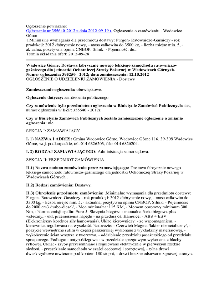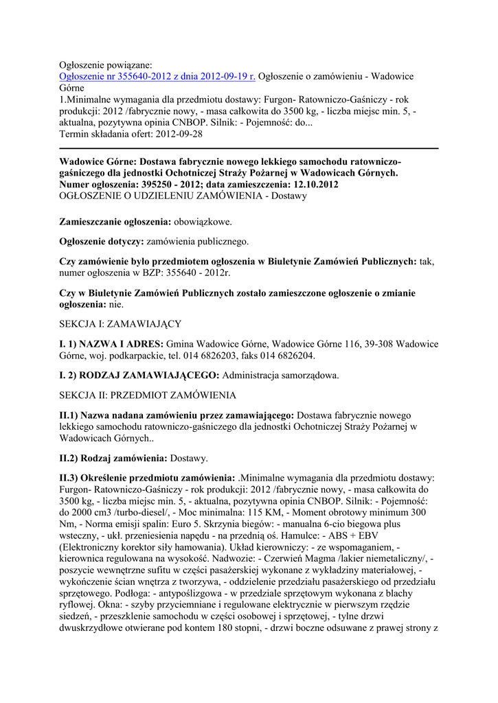 Ogłoszenie powiązane: Ogłoszenie nr 355640-2012 z dnia 2012-09-19 r. Ogłoszenie o zamówieniu - Wadowice Górne 1.Minimalne wymagania dla przedmiotu dostawy: Furgon- Ratowniczo-Gaśniczy - rok produkcji: 2012 /fabrycznie nowy, - masa całkowita do 3500 kg, - liczba miejsc min. 5, aktualna, pozytywna opinia CNBOP. Silnik: - Pojemność: do... Termin składania ofert: 2012-09-28 Wadowice Górne: Dostawa fabrycznie nowego lekkiego samochodu ratowniczogaśniczego dla jednostki Ochotniczej Straży Pożarnej w Wadowicach Górnych. Numer ogłoszenia: 395250 - 2012; data zamieszczenia: 12.10.2012 OGŁOSZENIE O UDZIELENIU ZAMÓWIENIA - Dostawy Zamieszczanie ogłoszenia: obowiązkowe. Ogłoszenie dotyczy: zamówienia publicznego. Czy zamówienie było przedmiotem ogłoszenia w Biuletynie Zamówień Publicznych: tak, numer ogłoszenia w BZP: 355640 - 2012r. Czy w Biuletynie Zamówień Publicznych zostało zamieszczone ogłoszenie o zmianie ogłoszenia: nie. SEKCJA I: ZAMAWIAJĄCY I. 1) NAZWA I ADRES: Gmina Wadowice Górne, Wadowice Górne 116, 39-308 Wadowice Górne, woj. podkarpackie, tel. 014 6826203, faks 014 6826204. I. 2) RODZAJ ZAMAWIAJĄCEGO: Administracja samorządowa. SEKCJA II: PRZEDMIOT ZAMÓWIENIA II.1) Nazwa nadana zamówieniu przez zamawiającego: Dostawa fabrycznie nowego lekkiego samochodu ratowniczo-gaśniczego dla jednostki Ochotniczej Straży Pożarnej w Wadowicach Górnych.. II.2) Rodzaj zamówienia: Dostawy. II.3) Określenie przedmiotu zamówienia: .Minimalne wymagania dla przedmiotu dostawy: Furgon- Ratowniczo-Gaśniczy - rok produkcji: 2012 /fabrycznie nowy, - masa całkowita do 3500 kg, - liczba miejsc min. 5, - aktualna, pozytywna opinia CNBOP. Silnik: - Pojemność: do 2000 cm3 /turbo-diesel/, - Moc minimalna: 115 KM, - Moment obrotowy minimum 300 Nm, - Norma emisji spalin: Euro 5. Skrzynia biegów: - manualna 6-cio biegowa plus wsteczny, - ukł. przeniesienia napędu - na przednią oś. Hamulce: - ABS + EBV (Elektroniczny korektor siły hamowania). Układ kierowniczy: - ze wspomaganiem, kierownica regulowana na wysokość. Nadwozie: - Czerwień Magma /lakier niemetaliczny/, poszycie wewnętrzne sufitu w części pasażerskiej wykonane z wykładziny materiałowej, wykończenie ścian wnętrza z tworzywa, - oddzielenie przedziału pasażerskiego od przedziału sprzętowego. Podłoga: - antypoślizgowa - w przedziale sprzętowym wykonana z blachy ryflowej. Okna: - szyby przyciemniane i regulowane elektrycznie w pierwszym rzędzie siedzeń, - przeszklenie samochodu w części osobowej i sprzętowej, - tylne drzwi dwuskrzydłowe otwierane pod kontem 180 stopni, - drzwi boczne odsuwane z prawej strony z oknem przesuwnym. Ogrzewanie : - ogrzewanie w części osobowej samochodu, klimatyzacja. Wyposażenie fabryczne : - radio-odtwarzacz CD + głośniki, - komputer pokładowy, - centralny zamek + immobiliser, - fotel kierowcy z regulacją, - poduszka powietrzna kierowcy, - lusterka podgrzewane, regulowane elektrycznie - trójkąt ostrzegawczy, apteczka, gaśnica, - opony wielosezonowe Wyposażenie dodatkowe : - belka świetlna LED z napisem /Straż/ z przodu pojazdu, lampa błyskowa z tyłu pojazdu lampy stroboskopowe zamontowane nad przednim zderzakiem, - generator sygnałów świetlnych i dźwiękowych z możliwością podawania komunikatów, - oświetlenie przedziału pasażerskiego włącznie z kabiną kierowcy i niezależnie przedziału sprzętowego, - oświetlenie przedziału sprzętowego typu LED włączane automatycznie po otwarciu tylnych drzwi, główny włącznik oświetlenia przedziału sprzętowego zainstalowany w kabinie kierowcy, - główny włącznik prądu zainstalowany w kabinie kierowcy, - ładowarka buforowa podtrzymująca napięcie w akumulatorach, - dodatkowe gniazda zapalniczki zainstalowane w przedziale osobowym i sprzętowym, - halogen przenośny typu /szperacz/ w przedziale sprzętowym, - regały boczne wykonane z materiałów niekorodujących z przegrodami na węże tłoczne i uchwytami na sprzęt p/pożarowy, - instalacja do radiotelefonu samochodowego typu MOTOROLA wraz z anteną, - radiotelefon samochodowy MOTOROLA GM360, - ładowarki do 2 sztuk radiotelefonów przenośnych typu GP 360 - platforma dachowa do przewozu drabiny pożarniczej wężów ssawnych i innego sprzętu ppoż. wykonana z blachy ryflowej plus drabina wejściowa zamontowana z tyłu pojazdu, - wyciągarka samochodowa 5,5 KM do 3500 KG z pokrowcem, - hak holowniczy, - orurowanie zderzaka przedniego, - drabina aluminiowa trzyelementowa, - oznakowanie pojazdu numerami operacyjnymi z tyłu, po bokach, obustronny napis OSP Wadowice Górne na drzwiach bocznych, - umieszczona w widocznym miejscu naklejka z napisem /Zakup pojazdu dofinansowany przez WFOŚiGW w Rzeszowie/ zgodnie ze wzorem nr 7. Wymiary pojazdu: - rozstaw osi min. 3400 mm, - wysokość zewnętrzna całkowita na pusto max.1954 mm, - szerokość max. 2100 mm. bez lusterek, max. długość 5500 mm. bez dodatkowego osprzętu, - objętość przedziału ładunkowego min. 5,3 m3. Warunki i okres gwarancji: - gwarancja na silnik i podzespoły 24 miesiące, gwarancja na nadwozie /erforację blach/ 144 miesięcy /12 lat/, - gwarancja na powłokę lakierniczą 36 miesiące, Parametry nie określone w powyższej specyfikacji muszą być zgodne z Wymaganiami dla samochodów ratowniczo-gaśniczych i sprzętu ppoż zawartymi w Rozporządzeniu Ministra Spraw Wewnętrznych i Administracji z dnia 20 czerwca 2007 r. w sprawie wykazu wyrobów służących zapewnieniu bezpieczeństwa publicznego lub ochronie zdrowia i życia oraz mienia, a także zasad wydawania dopuszczenia tych wyrobów do użytkowania /Dz. U. Nr. 143 poz. 1002 z późn. zm./.. II.4) Wspólny Słownik Zamówień (CPV): 34.14.42.10-3. SEKCJA III: PROCEDURA III.1) TRYB UDZIELENIA ZAMÓWIENIA: Przetarg nieograniczony III.2) INFORMACJE ADMINISTRACYJNE Zamówienie dotyczy projektu/programu finansowanego ze środków Unii Europejskiej: nie SEKCJA IV: UDZIELENIE ZAMÓWIENIA IV.1) D