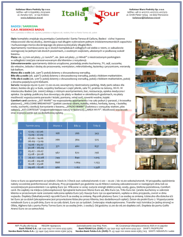 Italiatour Biuro Podróży Sp z o.o. tel/fax +48 12 6330663 ; 6237400 ul. Asnyka 10/1; 31-144 Kraków www.italiatour.travel Italiatour Biuro Podróży Sp. z o.o. tel/fax +48 22 4127171; 4127272; 4127373 ul. Emilii Plater 10/54; 00-669 Warszawa [email protected] BADESI / SARDEGNA C.A.V. RESIDENCE BADUS Port i Lotnisko w Olbia ok. 135 km; Lotnisko w Alghero ok. 100km; Port w Porto Torres ok. 50km Opis: kompleks znajduje się pomiędzy Castelsardo i Santa Teresa di Gallura, Badesi - cicha i typowa miejscowość dla tej okolicy, dominująca nad długim wybrzeżem pełnym śródziemnomorskich zapachów i turkusowego morza docierającego do piaszczystej plaży długiej 8km. Apartamenty rozmieszczone są w dwóch kompleksach odległych od siebie o 100m, w zabudowie szeregowej na jednym lub dwóch poziomach, z osobnym wejściem, ułożonych w podkowę wokół basenu. Plaża: ok. 2,5 km od plaży „Li Junchi”, ok. 3km od plaży „Li Mindi” z niestrzeżonym parkingiem w odległości 200/300 zarezerwowanym dla klientów z rezydencji. Zakwaterowanie: apartamenty dobrze urządzone, posiadają aneks kuchenny, TV, sejf, suszarkę do włosów, żelazko i deskę do prasowania, wentylator, mikrofalówkę, łazienkę z prysznicem, werandę lub balkon. Mono dla 2 osób (ok. 33m2): pokój dzienny z dwuosobową wersalką. Bilo dla 4 osób (ok. 44m2): pokój dzienny z dwuosobową wersalką, pokój z łóżkiem małżeńskim. Trilo dla 6 osób (ok. 51m2): pokój dzienny z dwuosobową wersalką, pokój z łóżkiem małżeńskim, pokój z dwoma pojedynczymi łóżkami. Serwis: recepcja 09.00-13.00 i 17.00-20.00; zewnętrzny niestrzeżony parking. Mały park zabaw dla dzieci, boisko do gry w bule, wspólny barbecue i część piknik, sala TV, pralnia na żetony, Wi-Fi. W miasteczku Badesi (ok. 200m) sklepy z różnym asortymentem, bar, restauracja, opieka medyczna i apteka. Za opłatą: publiczny bus dowożący do plaży w Badesi w określonych godzinach, na plaży możliwość wypożyczenia parasole i leżaki, pontony, wind surf, rowerki wodne, kajaki. Comfort card zawiera: „SET MARE” na wyposażeniu apartamentu i na cały pobyt (1 parasol, 2 krzesełka plażowe), „WELCOME BREAKFAST” (pakiet zawiera: dżem, nutella, mleko, herbatę, kawę, 1 butelkę wody, sucharki, ciastka); korzystanie z basenu, „SPAZIO BIMBI” (ludoteca z zoną play station, plac zabaw), „KIT CORTESIA” (najpotrzebniejsze rzeczy w łazience), „AREA WI-FI”. Możliwość wycieczek oraz wypożyczenie aut za dodatkową opłatą. Termin 2014 A B C D E F G 17.05 – 07.06 13.09 – 27.09 07.06 – 14.06 06.09 – 13.09 14.06 – 05.07 30.08 – 06.09 05.07 – 26.07 23.08 – 30.08 26.07 – 02.08 02.08 – 09.08 16.08 – 23.08 09.08 – 16.08 Mono 2 Bilo 4 Trilo 6 168 266 343 266 364 525 371 462 637 567 672 756 749 840 1.015 868 1.064 1.253 966 1.162 1.358 Cena w Euro za apartament za tydzień. Check in / Check out: sobota/wtorek 17.00 – 20.00 / do 10.00 sobota/wtorek. W przypadku opóźnienia należy wcześniej poinformować strukturę. Przy przyjazdach po godzinie 24.00 Klienci zostaną zakwaterowani w następnym dniu lub za wcześniejszym pozwoleniem i za opłatą Euro 50. Wliczone w cenę: zużycie energii elektrycznej, wody, gazu, bielizna pościelowa, Comfort card. Do zapłaty na miejscu (obowiązkowo): Sprzątanie końcowe Mono Euro 40, Bilo Euro 50, Trilo Euro 60 (aneks kuchenny w zakresie klienta w przeciwnym razie zostanie naliczona opłata Euro 50). Kaucja Euro 150 za apartament, wpłata w dniu przyjazdu, zwrot w dniu wyjazdu. Dopłaty (fakultatywnie): ręczniki Euro 8 za osobę za zmianę. Ręcznik plażowy Euro 7 za osobę za zmianę. Łóżeczko dla dziecka 0/2 lat Euro 30 za dzień (akceptowane jest przywiezione łóżeczko przez Klienta, bez dodatkowych opłat). Żeton do pralni Euro 7. Wypożyczenie notebook Euro 5 za pół dnia, Euro 10 za cały dzień, Euro 50 za tydzień. Zwierzęta: nieakceptowane. Transfer na/z lotniska (w jedną stronę) w Olbia, Alghero lub z portu Portu Torres Euro 70 za osobę (min. 2 osoby). Od godziny 22.00 do 06.00 dopłata 20%. Dopłata do portu Golfo Aranci Euro 20 za samochód. NIP: PL583-287-63-43 REGON 193092274 Bank PEKAO S.A. : 96 1240 1037 1111 0010 4253 5361; Nordea Bank Polska S.A. : 33 1440 1345 0000 0000 0360 3474; Zaświadczenie 204 Woj. Pom. OC Gwarancja Ubezpieczeniowa AXA nr 01.495160 Bank PEKAO S.A. (EUR): PL 93 1240 1037 1978 0010 4253 5521 SWIFT: PKOPPLPW Nordea Bank Polska S.A. (EUR): PL 43 1440 1101 0000 0000 0583 7103 SWIFT: NDEAPLP2 I oddz