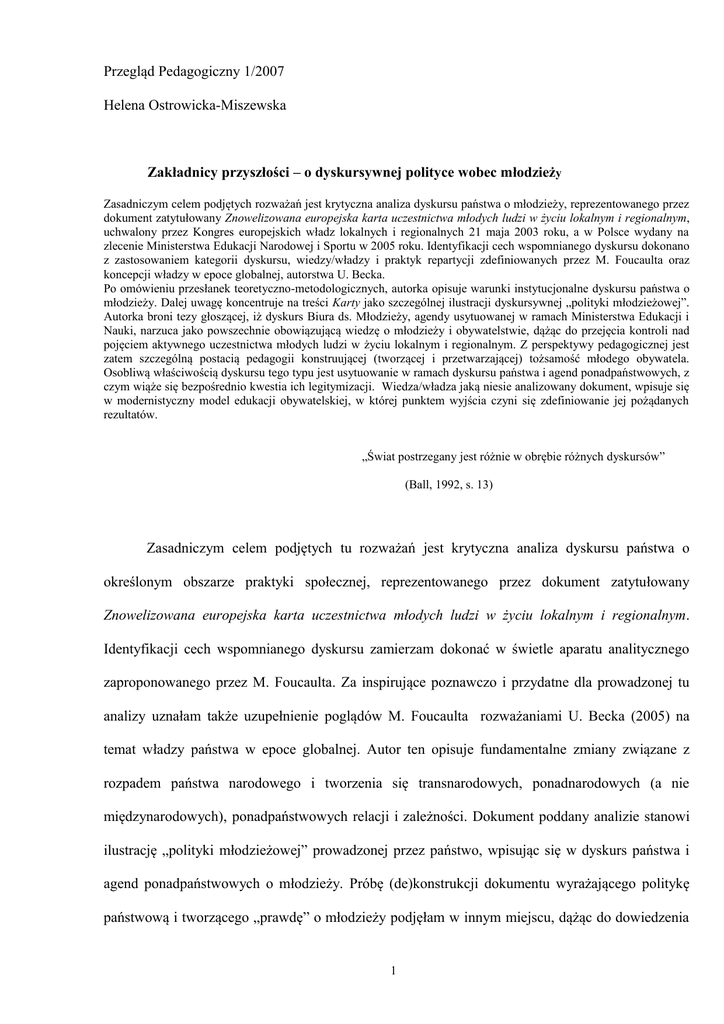 Przegląd Pedagogiczny 1/2007 Helena Ostrowicka-Miszewska Zakładnicy przyszłości – o dyskursywnej polityce wobec młodzieży Zasadniczym celem podjętych rozważań jest krytyczna analiza dyskursu państwa o młodzieży, reprezentowanego przez dokument zatytułowany Znowelizowana europejska karta uczestnictwa młodych ludzi w życiu lokalnym i regionalnym, uchwalony przez Kongres europejskich władz lokalnych i regionalnych 21 maja 2003 roku, a w Polsce wydany na zlecenie Ministerstwa Edukacji Narodowej i Sportu w 2005 roku. Identyfikacji cech wspomnianego dyskursu dokonano z zastosowaniem kategorii dyskursu, wiedzy/władzy i praktyk repartycji zdefiniowanych przez M. Foucaulta oraz koncepcji władzy w epoce globalnej, autorstwa U. Becka. Po omówieniu przesłanek teoretyczno-metodologicznych, autorka opisuje warunki instytucjonalne dyskursu państwa o młodzieży. Dalej uwagę koncentruje na treści Karty jako szczególnej ilustracji dyskursywnej „polityki młodzieżowej”. Autorka broni tezy głoszącej, iż dyskurs Biura ds. Młodzieży, agendy usytuowanej w ramach Ministerstwa Edukacji i Nauki, narzuca jako powszechnie obowiązującą wiedzę o młodzieży i obywatelstwie, dążąc do przejęcia kontroli nad pojęciem aktywnego uczestnictwa młodych ludzi w życiu lokalnym i regionalnym. Z perspektywy pedagogicznej jest zatem szczególną postacią pedagogii konstruującej (tworzącej i przetwarzającej) tożsamość młodego obywatela. Osobliwą właściwością dyskursu tego typu jest usytuowanie w ramach dyskursu państwa i agend ponadpaństwowych, z czym wiąże się bezpośrednio kwestia ich legitymizacji. Wiedza/władza jaką niesie analizowany dokument, wpisuje się w modernistyczny model edukacji obywatelskiej, w której punktem wyjścia czyni się zdefiniowanie jej pożądanych rezultatów. „Świat postrzegany jest różnie w obrębie różnych dyskursów” (Ball, 1992, s. 13) Zasadniczym celem podjętych tu rozważań jest krytyczna analiza dyskursu państwa o określonym obszarze praktyki społecznej, reprezentowanego przez dokument zatytułowany Znowelizowana europejska karta uczestnictwa młodych ludzi w życiu lokalnym i regionalnym. Identyfikacji cech wspomnianego dyskursu zamierzam dokonać w świetle aparatu analitycznego zaproponowanego przez M. Foucaulta. Za inspirujące poznawczo i przydatne dla prowadzonej tu analizy uznałam także uzupełnienie poglądów M. Foucaulta rozważaniami U. Becka (2005) na temat władzy państwa w epoce globalnej. Autor ten opisuje fundamentalne zmiany związane z rozpadem państwa narodowego i tworzenia się transnarodowych, ponadnarodowych (a nie międzynarodowych), ponadpaństwowych relacji i zależności. Dokument poddany analizie stanowi ilustrację „polityki młodzieżowej” prowadzonej przez państwo, wpisując się w dyskurs państwa i agend ponadpaństwowych o młodzieży. Próbę (de)konstrukcji dokumentu wyrażającego politykę państwową i tworzącego „prawdę” o młodzieży podjęłam w innym miejscu, dążąc do dowiedzenia 1 tezy, iż młodzież jest „prześladowana” (Ostrowicka-Miszewska, 2004). Tekstem poddanym krytycznej analizie była Strategia Państwa dla Młodzieży na lata 2003-2012 – dokument przygotowany przez Ministerstwo Edukacji Narodowej i Sportu, przyjęty przez Radę Ministrów 19 sierpnia 2003 roku. Badając politykę państwa wobec młodzieży uznałam, że warto odpowiedzieć na zaproszenie M. Foucaulta do podjęcia „gry” (Foucault, 1995), tym bardziej, iż koncepcja teoretyczna stworzona przez tego autora okazuje się niezwykle pomocna w analizie mechanizmów praktyki dyskursywnej instytucji państwowych. Analiza dyskursu Strategii… ujawniła, że w dyskursie państwa uobecnia się dążenie do przedstawiania świata w kategoriach naturalnych i oczywistych faktów. Dyskurs tego typu wabi i uwodzi społeczeństwo poprzez gwarancje „prawdy” o młodzieży oraz skuteczności podejmowanych działań. Kontynuując penetracje dyskursu państwa o młodzieży, przedmiotem poznania uczyniłam Znowelizowaną europejską kartę uczestnictwa młodych ludzi w życiu lokalnym i regionalnym1 uchwaloną przez Kongres europejskich władz lokalnych i regionalnych 21 maja 2003 roku, a w Polsce wydaną na zlecenie MENiS w 2005 roku (ss. 38). Dokument ten jest elementem wieloletniego dyskursu Stałej Konferencji Europejskich Władz Lokalnych i Regionalnych (kolejno w Lozannie w 1988 roku i w Langollen w 1991, w Krakowie w 2002 roku zorganizowanej pod Patronatem Dyrektoriatu Młodzieży i Sportu Rady Europy). W Polsce wiedzę/władzę konstruowaną w Karcie legitymizuje Biuro ds. Młodzieży – agenda usytuowana w ramach Ministerstwa Edukacji i Nauki. W dalszej części artykułu, po krótkim omówieniu przesłanek teoretycznometodologicznych, na których opiera się moja analiza, opisuję warunki instytucjonalne dyskursu państwa o młodzieży. Dalej uwagę koncentruję na treści Znowelizowanej europejskiej karty uczestnictwa młodych ludzi w życiu lokalnym i regionalnym jako szczególnej ilustracji dyskursywnej „polityki młodzieżowej”. Zamierzam bronić tezy głoszącej, iż dyskurs Biura ds. Młodzieży narzuca jako powszechnie obowiązującą wiedzę o młodzieży i obywatelstwie, dążąc do przejęcia kontroli nad pojęciem aktywnego uczestnictwa młodych ludzi w życiu lokalnym i 1 Zamiennie używam w tekście skrótu: Karta 2 regionalnym. Z perspektywy pedagogicznej jest zatem szczególną postacią pedagogii konstruującej (tworzącej i przetwarzającej) tożsamość młodego obywatela. Przesłanki Inspiracją dla analizy badanej praktyki dyskursywnej są twierdzenia M. Foucaulta na temat dyskursu, wiedzy/władzy i praktyk repartycji. Kategoria dyskursu zajmuje centralne miejsce w wypowiedziach M. Foucaulta na temat wiedzy i władzy. Badając sposoby tworzenia wiedzy, autor ten dowodzi, że reguły organizacji konkretnego dyskursu są formami sprawowania władzy poprze