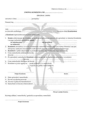 Dąbrowa Górnicza, dn. ………………………… UMOWA KOMISOWA NR …………………………… ORYGINAŁ \ KOPIA zawarta w dniu ……………………… pomiędzy: Panem/nią ………………………………………………………………………………………………………. …………………………………………………………………………………………………………………….. zam. ………………………………………………………………………………………………………………. nr dowodu osobistego ………………………………………………………… zwanym dalej Komitentem a Komisem reprezentowanym przez właściciela. 1. Komis zobowiązuje się, działając na podstawie powyższej umowy, do sprzedaży w imieniu Komitenta i na jego rachunek samochodu marki …………………………………………………………………..... nr rejestracyjny ……………………………… rok produkcji …………………………………….... nr nadwozia …………………………………………………………………………………………… 2. Komitent oświadcza, iż wyżej wymieniony samochód stanowi jego prywatną własność i nie jest obciążony żadnymi roszczeniami osób trzecich oraz nie stanowi zastawu bankowego. 3. Komitent w pełni odpowiada za pochodzenie oraz stan techniczny tego samochodu. 4. Cenę samochodu ustalono na kwotę ……………………………………………………………………. słownie ……………………………………………………………………………………………………… 5. Po sprzedaży samochodu Komitent zobowiązuje się do zapłacenia prowizji w wysokości: ………………………. słownie …………………………………………………………………………… 6. Cenę samochodu obniżono do kwoty …………………………………………………………………... 7. Komitent wyraża zgodę na : - jazdę próbną w/w samochodu - wyjazdy na giełdy samochodowe …………………………………………. ………………………………………… Podpis Komitenta 8. 9. 10. 11. Komis Data sprzedaży samochodu ………………………………………………………………………………… Kwota uzyskanej prowizji …………………………………………………………………………………... Kwota wypłacona Komitentowi …………………………………………………………………………… Samochód zwrócono właścicielowi ………………………………………………………………………… …………………………………………………… Pieczęć i podpis Komisu Kwituję odbiór/ samochodu/ gotówki za sprzedany samochód. ……………………………………………… Podpis Komitenta