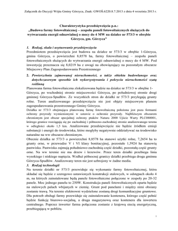 Załącznik do Decyzji Wójta Gminy Górzyca, Znak: GWOŚ.6220.8.7.2013 z dnia 4 września 2013 r. Charakterystyka przedsięwzięcia p.n.: „Budowa farmy fotowoltaicznej – zespołu paneli fotowoltaicznych służących do wytwarzania energii odnawialnej o mocy do 4 MW na działce nr 573/3 w obrębie Górzyca, gm. Górzyca” 1. Rodzaj, skala i usytuowanie przedsięwzięcia Przedmiotem przedsięwzięcia jest budowa na działce nr 573/3 w obrębie 1-Górzyca, gmina Górzyca, o powierzchni 8,8578 ha, farmy fotowoltaicznej – zespołu paneli fotowoltaicznych służących do wytwarzania energii odnawialnej o mocy do 4 MW. Pod inwestycję przeznacza się 8,0219 ha z uwagi na obowiązujący na pozostałym obszarze Miejscowy Plan Zagospodarowania Przestrzennego 2. Powierzchnia zajmowanej nieruchomości, a także obiektu budowlanego oraz dotychczasowym sposobie ich wykorzystywania i pokryciu nieruchomości szatą roślinną Planowana farma fotowoltaiczna zlokalizowana będzie na działce nr 573/3 w obrębie 1Górzyca, po wschodniej stronie miejscowości Górzyca, po południowej stronie drogi gminnej Górzyca-Spudłów. Ze wszystkich stron do działki nr 573/3 przylegają grunty rolne. Teren analizowanego przedsięwzięcia nie jest objęty miejscowym planem zagospodarowania przestrzennego Gminy Górzyca. Działka nr 573/3 obejmująca planowaną farmę fotowoltaiczną położona jest poza formami ochrony przyrody wymienionymi w ustawie o ochronie przyrody. Najbliższym obszarem chronionym jest obszar specjalnej ochrony ptaków Natura 2000 Ujście Warty PLC080001, którego granice rozciągają się po zachodniej i północno-zachodniej stronie analizowanego terenu w odległości około 1,5 km. Analizowane przedsięwzięcie nie będzie źródłem emisji substancji i energii do środowiska, które mogłyby negatywnie oddziaływać na środowisko naturalne na ww obszarze chronionym. Obecnie działka nr 573/3 o powierzchni 8,8578 ha stanowi użytki rolne, 7,2654 ha to grunty orne, w przewadze V i VI klasy bonitacyjnej, pozostałe 1,5924 ha stanowią pastwiska. Pastwiska zajmują południowo-zachodnią część działki, pozostałą część grunty orne. Na ww terenie nie ma drzew i krzewów. Przez teren działki przebiega linia wysokiego i niskiego napięcia. Wzdłuż północnej granicy działki przebiega droga gminna Górzyca-Spudłów. Analizowany teren nie jest uzbrojony w żadne media. 3. Rodzaj technologii Na terenie działki nr 573/3 przewiduje się wykonanie farmy fotowoltaicznej, która składać się będzie z szeregowo ustawionych konstrukcji stalowych, w odstępach około 4 m, na których zainstalowane będą panele fotowoltaiczne połączone w zespoły po 20-32 panele. Moc jednego panelu to 250W. Konstrukcja paneli fotowoltaicznych oparta będzie na stalowych palach wbijanych w ziemię. Grunt pod panelami i między nimi obsiany zostanie trawą. Na terenie elektrowni wydzielone zostaną drogi komunikacyjne gruntowe. Dla potrzeb obsługi farmy przewiduje się zainstalowanie kontenera, którego część pełnić będzie funkcję biurowo-socjalną, a druga magazynową oraz kontenera dla inwertera centralnego. Poprzez inwerter farma połączona zostanie z krajową siecią energetyczną, przebiegającą w pobliżu. 1 Załącznik do Decyzji Wójta Gminy Górzyca, Znak: GWOŚ.6220.8.7.2013 z dnia 4 września 2013 r. Dla potrzeb funkcjonowania części socjalnej doprowadzona zostanie woda z wodociągu gminnego. Ścieki bytowe gromadzone będą w zbiorniku bezodpływowym i wywożone na gminną oczyszczalnię ścieków w Górzycy. Zestawienie powierzchni objętych projektem farmy: - Powierzchnia działki nr 573/3: 88578 m2 - powierzchnia dróg wewnętrznych: 3290 m2 - powierzchnia zabudowana panelami: 67431 m2 - powierzchnia zabudowy (kontener): 35 m2 - powierzchnia niezabudowana: 17822 m2 W skład farmy fotowoltaicznej wchodzić będą: panele fotowoltaiczne na konstrukcji stalowej; inwertery; technologiczne połączenia kablowe; wewnętrzne drogi technologiczne; kontener biurowo-socjalno-magazynowy. Farma służyć będzie do komercyjnej produkcji energii elektrycznej, sprzedawanej do sieci publicznej. Wyposażona będzie są w specjalny falownik (inwerter), który przemienia prąd stały na prąd przemienny i synchronizuje system z siecią. Pełni on również rolą zabezpieczenia w przypadku awarii sieci. Bezpośrednim urządzeniem służącym do konwersji energii promieniowania słonecznego na energię elektryczną, jest ogniwo fotowoltaiczne (inaczej fotoogniwo, solar lub ogniwo słoneczne). Najczęściej używanym materiałem do produkcji ogniw fotowoltaicznych jest krzem. Zestaw fotoogniw słonecznych, połączonych ze sobą i zamontowany w konstrukcji nośnej lub na ramie, nosi nazwę modułu fotowoltaicznego. Całość jest hermetycznie laminowana i oprawiona sztywną, lekką ramą, zazwyczaj aluminiową, zapewniającą wytrzymałość mechaniczną modułów i ułatwiającą ich montaż. Elementem ochronnym modułu jest szyba hartowana o grubości 3-4 mm. Na powierzchni szyba posiada zwykle strukturę rozpraszającą promienie słoneczne (powłokę antyrefleksyjną), gwarantującą minimalizację odbicia promieni słonecznych padających na moduł i tym samym strat energii. Konstrukcja modułów zapewnia dobrą odporność na warunki atmosferyczne przez cały okres eksploatacji, który wynosi zazwyczaj min. 25 lat. Projektowana instalacja fotowoltaiczna wykonana zostanie poprzez zamontowanie stalowej konstrukcji mocującej opartej na stalowych palach wbijanych kafarem w ziemię na głębokość 160 cm. Na palach tych zamontowane będą specjalne stoły montażowe pod panele w 2 rzędach w układzie pionowym. Stoły będą zamontowane pod kątem ok. 35°. Najniższy punkt stołu znajduje się na wysokości 60 cm. Wymiar 2 paneli w układzie pionowym to 164 cm x 2. W poziomie panele będą montowane na stołach krótszym bokiem tj. 992 mm i na jednym stole będzie się mieścić od 20-32 p