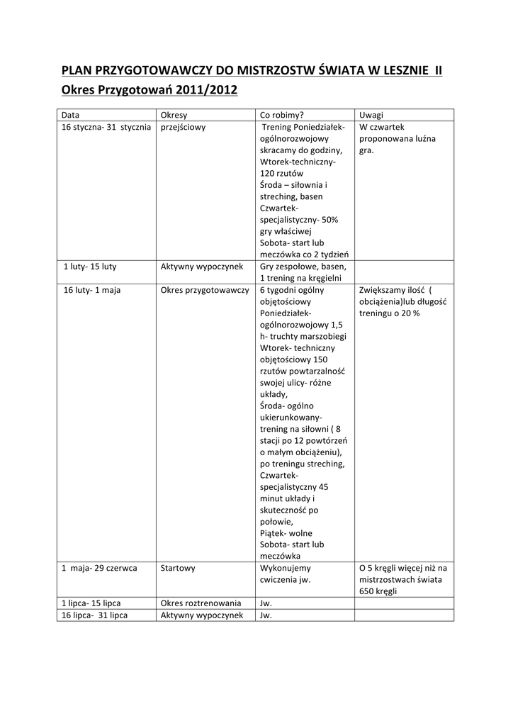 plan przygotowawczy do mistrzostw świata w lesznie2011-12