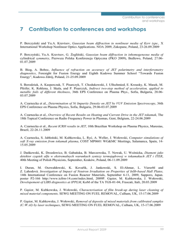 Contribution to conferences and workshops 7 Contribution to conferences and workshops P. Berczyński and Yu.A. Kravtsov, Gaussian beam diffraction in nonlinear media of Kerr type., X International Workshop Nonlinear Optics Applications. NOA 2009, Zakopane, Poland, 23-26.09.2009 P. Berczyński, Yu.A. Kravtsov, G. Żegliński, Gaussian beam diffraction in inhomogeneous media of cylindrical symmetry, Pierwsza Polska Konferencja Optyczna (PKO 2009), Bedlewo, Poland, 27.0601.07.2009 B. Bieg, A. Boboc, Influence of refraction on accuracy of JET polarimetry and interferometry diagnostics, Foresight for Fusion Energy and Eighth Kudowa Summer School “Towards Fusion Energy”, Kudowa Zdrój, Poland, 21-25.09.2009 S. Borodziuk, A. Kasperczuk, T. Pisarczyk, T. Chodukowski, J. Ullschmied, E. Krousky, K. Masek, M. Pfeifer, K. Rohlena, J. Skala, and P. Pisarczyk, Indirect two-step method of acceleration, applied to metallic foils of different thickness, 36th EPS Conference on Plasma Phys., Sofia, Bulgaria, 28.0603.07.2009 A. Czarnecka et al., Determination of Ni Impurity Density on JET by VUV Emission Spectroscopy, 36th EPS Conference on Plasma Physics, Sofia, Bulgaria, 29.06-03.07.2009 A. Czarnecka et al., Overview of Recent Results on Heating and Current Drive in the JET tokamak, The 18th Topical Conference on Radio Frequency Power in Plasmas, Gent, Belgium, 22-24.06.2009 A. Czarnecka et al., Recent ICRH results in JET, 10th Brazilian Workshop on Plasma Physics, Maresias, Brazil, 22-26.11.2009 A. Czarnecka, S. Jabłoński, M. Kubkowska, L. Ryć, A. Weller, J. Wołowski, Computer simulations of soft X-ray emission from tokamak plasma, COST MP0601 WG&MC Meetings, Salamanca, Spain, 1415.05.2009 J. Dańkowski, K. Drozdowicz, B. Gabańska, B. Marczewska, T. Nowak, U. Woźnicka, Diament jako detektor cząstek alfa w ekstremalnych warunkach syntezy termojądrowej w tokamakach JET i ITER, 40th Meeting of Polish Physicists, September, Kraków, Poland, 06-11.09.2009 I. Duran, M. Oszwałdowski, K. Kovařík, J. Jankowski, S. El-Ahmar, L. Viererbl and Z. Lahodová. Investigation of Impact of Neutron Irradiation on Properties of InSb-based Hall Plates, 14th International Conference on Fusion Reactor Materials, September 6-11, 2009, Sapporo, Japan. poster P2-166 http://www.icfrm-14.com/index.html, 2009P. Gąsior, M. Kubkowska, J. Wołowski, Developement of LIBS disgnostics at IPPLM, KoM of the TA TGS-01-04, Frascati, Itali, 20.03.2009 P. Gąsior, M. Kubkowska, J. Wołowski, Characterisation of film break-up during laser cleaning of mixed material components, SEWG MEETING ON FUEL REMOVAL, Culham, UK, 15-17.06.2009 P. Gąsior, M. Kubkowska, J. Wołowski, Removal of deposits of mixed materials from calibrated samples (C:W:Al) by laser techniques, SEWG MEETING ON FUEL REMOVAL, Culham, UK, 15-17.06.2009 Annual Report 2009 99 Contribution to conferences and workshops P. Gąsior, M. Kubkowska, J. Wołowski, LIBS and TOF analysis of mixed layer AUG divertor samples, Joint TFE-SEWG Material Migration and Material Mixing meeting, Culham, UK, 07-08.07.2009 L. Jakubowski, K. Malinowski, J. Żebrowski, V.V. Plyusnin, M.J. Sadowski, M. Rabiński, H. Fernandes, C. Silva, P. Duarte, M.J. Jakubowski, Study of electron beams within ISTTOK tokamak by means of a multi-channel Cherenkov detector; their correlation with hard X-rays, 1st International Conf. on Frontiers in Diagnostic Technologies, Frascati, Italy, 25-27.11.2009 L. Jakubowski, M.J. Sadowski, K. Malinowski, M. Rabiński, J. Żebrowski, M.J. Jakubowski, Badania szybkich elektronów w układach typu tokamak przy wykorzystaniu efektu czerenkowa (In polish), XL Zjazd Fizyków Polskich, Kraków, Polska, 06-11.09.2009 L. Jakubowski, J. Żebrowski, V.V. Plyusnin, K. Malinowski, M.J. Sadowski, M. Rabiński, H. Fernandes, C. Silva, P. Duarte, A detection method for direct measurements of fast electrons via Cherenkov effect in the ISTTOK tokamak, 11th IAEA Technical Meeting on “Energetic Particles in Magnetic Confinement Systems”, Kiev, Ukraine, 21-23.09.2009 S. Jednoróg, M. Scholz, S. Popovichev, A. Murari and JET EFDA contributors, Numerical optimization of activation samples for the application of the activation technique to measure neutrons in large fusion devices like JET and ITER, 36th EPS Conference on Plasma Physics, Sofia, Bulgaria, 29.06-03.07.2009 A. Kasperczuk, T. Pisarczyk, N.N. Demchenko, S.Yu. Gus’kov, M. Kalal, J. Ullschmied, E. Krousky, K. Masek, M. Pfeifer, K. Rohlena, J. Skala, and P. Pisarczyk, Influence of target material on structure of partly defocused laser beam produced plasma outflow, 36th EPS Conference on Plasma Phys., Sofia, Bulgaria, 28.06-03.07.2009 P. Kozikowski, A. Krawczyńska, M. Kulczyk, M. Lewandowska, K.J. Kurzydłowski, Tayloring mechanical properties of nano-structured Eurofer 97 steel for fusion applications, EMRS Fall Meeting, Warsaw, Poland, 13-18.09.2009 Yu.A. Kravtsov, B. Bieg, Electromagnetic waves propagation in weakly anisotropic media: Theory and applications, Pierwsza Polska Konferencja Optyczna (PKO 2009), Bedlewo, Poland, 27.06-01.07.2009 Yu.A. Kravtsov, M.D. Raev, E.I. Skvortsov, Manifestations of the resonant (Bragg) and non-resonant mechanisms of scattering on radar images of the sea surface, Internat. Radar Symposium’09, Hamburg, Germany, 09-11.09.2009 Yu.A. Kravtsov, B. Bieg, Electromagnetic waves reflection from a target in magnetized plasma with application to plasma diagnostics, Internat. Radar Symposium’09, Hamburg, Germany, 09-11.09.2009 Yu.A. Kravtsov, B. Bieg, Microwave plasma polarimetry, using double passage regime, Foresight for Fusion Energy and Eighth Kudowa Summer School “Towards Fusion Energy”, Kudowa Zdrój, Poland, 21-25.09.2009 Yu.A. Kravtsov, M.V. Tinin, K. Makles, Tomography-like approach to the super Fresnel resolution of phase screen fine structure, Foresight for Fusion Energy and Eighth Kudowa Summer School “Towards Fusion Energy”, Kudowa Zdrój, Poland, 21-25.09.2009 I. Książek, S