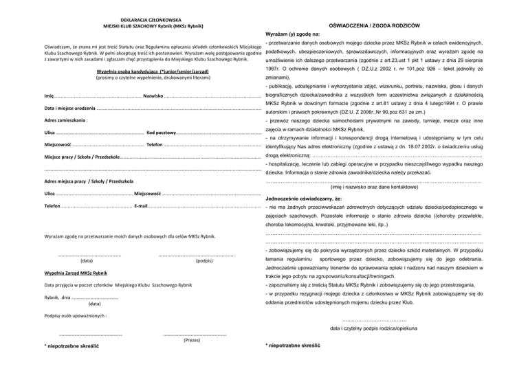 DEKLARACJA CZŁONKOWSKA MIEJSKI KLUB SZACHOWY Rybnik (MKSz Rybnik) OŚWIADCZENIA / ZGODA RODZICÓW Wyrażam (y) zgodę na: - przetwarzanie danych osobowych mojego dziecka przez MKSz Rybnik w celach ewidencyjnych, Oświadczam, że znana mi jest treść Statutu oraz Regulaminu opłacania składek członkowskich Miejskiego Klubu Szachowego Rybnik. W pełni akceptuję treść ich postanowień. Wyrażam wolę postępowania zgodnie podatkowych, ubezpieczeniowych, sprawozdawczych, informacyjnych oraz wyrażam zgodę na z zawartymi w nich zasadami i zgłaszam chęć przystąpienia do Miejskiego Klubu Szachowego Rybnik. umożliwienie ich dalszego przetwarzania (zgodnie z art.23.ust 1 pkt 1 ustawy z dnia 29 sierpnia Wypełnia osoba kandydująca (*junior/senior/zarząd) (prosimy o czytelne wypełnienie, drukowanymi literami) 1997r. O ochronie danych osobowych ( DZ.U.z 2002 r. nr 101,poz 926 – tekst jednolity ze zmianami), - publikację, udostępnianie i wykorzystania zdjęć, wizerunku, portretu, nazwiska, głosu i danych Imię...................................................................... Nazwisko ............................................................................. biograficznych dziecka/zawodnika z wszystkich form uczestnictwa związanych z działalnością Data i miejsce urodzenia …................................................................................................................................ Adres zamieszkania : MKSz Rybnik w dowolnym formacie (zgodnie z art.81 ustawy z dnia 4 lutego1994 r. O prawie autorskim i prawach pokrewnych (DZ.U. Z 2006r.,Nr 90,poz 631 ze zm.) - przewóz naszego dziecka samochodami prywatnymi na zawody, turnieje, mecze oraz inne Ulica ...................................................................... Kod pocztowy.................................................................... zajęcia w ramach działalności MKSz Rybnik, - na otrzymywanie informacji i korespondencji drogą internetową i udostępniamy w tym celu Miejscowość ......................................................... Telefon …........................................................................... identyfikujący Nas adres elektroniczny (zgodnie z ustawą z dn. 18.07.2002r. o świadczeniu usług Miejsce pracy / Szkoła / Przedszkole................................................................................................................ drogą elektroniczną: ………………………………………………………………………......................... - hospitalizację, leczenie lub zabiegi operacyjne w przypadku nieszczęśliwego wypadku naszego ............................................................................................................................................................................ dziecka. Informacja o stanie zdrowia zawodnika/dziecka należy przekazać: Adres miejsca pracy / Szkoły / Przedszkola ………………………………………………………………………………………………………………… (imię i nazwisko oraz dane kontaktowe) Ulica ............................................................. Miejscowość …............................................................................ Jednocześnie oświadczamy, że: Telefon......................................................... E-mail.......................................................................................... - nie ma żadnych przeciwwskazań zdrowotnych dotyczących udziału dziecka/podopiecznego w zajęciach szachowych. Pozostałe informacje o stanie zdrowia dziecka ((choroby przewlekłe, choroba lokomocyjna, krwotoki, przyjmowane leki, itp..) Wyrażam zgodę na przetwarzanie moich danych osobowych dla celów MKSz Rybnik. .................................................. (data) ............................................................ (podpis) ………………………………………………………………………………………………………………… …………………………………………………………………………………………………………………. - zobowiązujemy się do pokrycia wyrządzonych przez dziecko szkód materialnych. W przypadku łamania regulaminu sportowego przez dziecko, zobowiązujemy się do jego odebrania. Jednocześnie upoważniamy trenerów do sprawowania opieki i nadzoru nad naszym dzieckiem w Wypełnia Zarząd MKSz Rybnik trakcie jego pobytu na zgrupowaniu/konsultacji/treningach. Data przyjęcia w poczet członków Miejskiego Klubu Szachowego Rybnik - zapoznaliśmy się z treścią Statutu MKSz Rybnik i zobowiązujemy się do jego przestrzegania, - w przypadku rezygnacji mojego dziecka z członkostwa w MKSz Rybnik zobowiązujemy się do Rybnik, dnia ..................................... (data) oddania przedmiotów udostępnionych mojemu dziecku przez Klub. Podpisy osób upoważnionych : .................................................. * niepotrzebne skreślić …...…………………………… .................................................. (Prezes) data i czytelny podpis rodzica/opiekuna * niepotrzebne skreślić