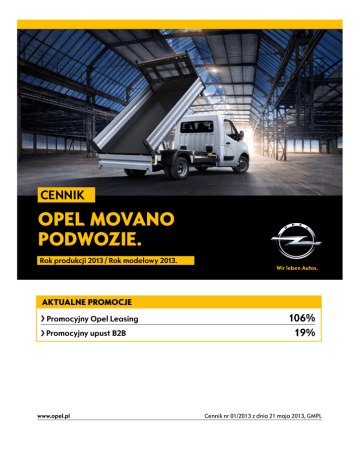 Cennik OPEL MOVANO PODWOZIE. Rok produkcji 2013 / Rok modelowy 2013. AKTUALNE PROMOCJE Promocyjny Opel Leasing Promocyjny upust B2B www.opel.pl 106% 19% Cennik nr 01/2013 z dnia 21 maja 2013, GMPL Cennik – Opel Movano – podwozie do zabudowy z pojedynczą kabiną/z kabiną załogową 1 , rok produkcji 2013, rok modelowy 2013 Modele i wersje L2H1 FWD 2.3 CDTI 3,5t 100KM Euro 5 M6/MA6 2 106 140 – 115 690 117 540 – – 119 240 121 090 – – 124 140 125 990 – 115 440 – L2H1 RWD TW 2.3 CDTI 3,5t M6/MA6 2 L2H1 RWD TW 2.3 CDTI 4,5t M6/MA6 2 L3H1 FWD 2.3 CDTI 3,5t M6/MA6 107 940 109 890 150KM Euro 5 113 640 M6/MA6 2 125 KM Euro 5 z chłodzeniem3 – 2 L2H1 RWD SW 2.3 CDTI 3,5t 125KM Euro 5 111 690 L3H1 RWD SW 2.3 CDTI 3,5t M6 – – 117 940 119 790 L3H1 RWD TW 2.3 CDTI 3,5t M6/MA6 2 – – 118 190 121 790 L3H1 RWD TW 2.3 CDTI 4,5t M6/MA6 2 – – 124 190 127 790 L4H1 RWD TW 2.3 CDTI 3,5t M6/MA6 2 – – 120 740 122 590 L4H1 RWD TW 2.3 CDTI 4,5t 2 – – 126 740 128 590 M6/MA6 L – dostępne długości nadwozia: 2 = średnia, 3 = długa, 4 = przedłużona H – dostępna wysokość nadwozia: 1 = podstawowa FWD = napęd na przednie koła RWD = napęd na tylne koła SW = pojedyncze koła na osi tylnej TW = podwójne koła na osi tylnej 1) Wersja z kabiną załogową: dopłata 6 000 zł – niedostępna w wersji L2H1 RWD 2) MA6 = 6-biegowa zautomatyzowana skrzynia biegów: dopłata 6 000 zł – dostępna tylko z silnikami 125 KM oraz 150 KM. 3) System dodatkowego chłodzenia niezbędny jest do zachowania normy Euro 5 przy konwersjach powodujących zwiększenie masy własnej pojazdu. Dane techniczne silników 2.3 CDTI Ecotec 100 KM Typ silnika 2.3 CDTI Ecotec 125 KM 2.3 CDTI Ecotec 150 KM turbodiesel turbodiesel turbodiesel 6-biegowa manualna 6-biegowa manualna / zautomatyzowana Easytronic® 6-biegowa manualna / zautomatyzowana Easytronic® 2 298 2 298 2 298 74 / 100 przy 3 500 92 / 125 przy 3 500 110 / 150 przy 3 500 285 przy 1 250-2 000 310 przy 1 250-2 500 350 przy 1 500-2 750 Euro 5 Euro 5 Euro 5 Zużycie paliwa, miasto, l/100 km* FWD: 9,3 FWD: 10,3/8,8; RWD: 10,8/10,6 FWD: 10,3/8,8; RWD: 10,8/10,6 Zużycie paliwa, autostrada, l/100 km* FWD: 7,4 FWD: 7,8/8,0; RWD: 8,7/8,9 FWD: 7,8/8,0; RWD: 8,7/8,9 Zużycie paliwa, cykl mieszany, l/100 km* FWD: 8,0 FWD: 8,8/8,3; RDW: 9,5/9,5 FWD: 8,8/8,3; RDW: 9,5/9,5 Emisja CO2, cykl mieszany, g/km* FWD: 211 FWD: 229/217; RWD: 248/249 FWD: 229/217; RWD: 248/249 Skrzynie biegów Pojemność skokowa, cm3 Moc maksymalna, kW/KM przy obr./min Maks. moment obrotowy, Nm przy obr./min Norma emisji spalin Obowiązkowe przeglądy okresowe co 40 000 km lub 1 rok * dane dla silników Euro 5 zgodnie z normami 2007/715/EC i 2008/692/EC. Wymiary, masy, pojemności Nadwozie Długość całkowita (mm): L2: 5 643; L3: 6 193-6 293; L4: 6 848 Wysokość całkowita (mm, bez obciążenia): dla FWD – H1: 2 258-2 272 dla RWD – H1: 2 273-2 301 Szerokość ze złożonymi/rozłożonymi lusterkami (mm): 2 070/2 470 Rozstaw osi (mm): L2: 3 682; L3: 3 682-4 332; L4: 4 332 Rozstaw kół przód/tył (mm): 1 750/ 1 612(TW)1 730(SW) Przestrzeń ładunkowa (wg ECIE, w zależności od wersji) Szerokość między nadkolami (mm): 1 080(TW)/1 380(SW) Masy (wg ECE) Dopuszczalna masa całkowita (w zależności od wersji): 3 500-4 500 kg Ładowność (w zależności od wersji): 1 277-2 223 kg Promień zawracania (w zależności od wersji) Między krawężnikami: 13,6-15,7 m Między ścianami: 14,1-16,2 m Cennik Opla Movano – Podwozie do zabudowy, rok produkcji 2013, nr 01/2013 z dnia 21 maja 2013 1/4 Wyposażenie standardowe / opcje dodatkowe NADWOZIE Lakier metaliczny Zbiornik paliwa 80 litrów Większy zbiornik paliwa 105 litrów Elektrycznie sterowane i podgrzewane lusterka zewnętrzne ze zintegrowanymi kierunkowskazami Reflektory przeciwmgielne Światła do jazdy dziennej Lusterka zewnętrzne na przedłużonych ramionach Chlapacze przeciwbłotne przednie i tylne Hak holowniczy Filtr cząstek stałych Elektryczne złącze odbioru mocy dla konwersji (kontener) Elektryczne złącze odbioru mocy dla konwersji (wywrotka/skrzynia) Przystawka odbioru mocy z silnika (w wersjach FWD tylko z ogrzewaniem C41, w wersjach RWD tylko z klimatyzacją C60/C61, niedostępna z zautomatyzowaną skrzynią biegów). Zawiera: elektryczne złącze odbioru mocy dla konwersji KPD. Przystawka odbioru mocy ze skrzyni biegów – złącze mechaniczne (tylko w wersjach RWD, niedostępne z UF3) Podwyższone obroty biegu jałowego Nadwozie – zawieszenie i koła Podwójne koła na tylnej osi (tylko w wersji RWD TW) Zawieszenie pneumatyczne (tylko w wersjach FWD) Zawieszenie redukujące przechyły nadwozia Blokada mechanizmu różnicowego tylnej osi (tylko w wersji RWD) Opony wielosezonowe (niedostępne z wersją RWD TW) Pełnowymiarowe koło zapasowe (pod podłogą przedziału ładunkowego, niedostępne z zestawem naprawczym WTC) Zestaw naprawczy do opon – brak koła zapasowego P34 (tylko w wersji FWD) Kołpaki piast kół Pełnowymiarowe kołpaki kół WNĘTRZE – tapicerki, fotele i wewnętrzne elementy ozdobne Tapicerka tekstylna Pulse, ciemna Tapicerka winylowa, ciemna (niedostępna z pakietem XAZT i fotelem kierowcy A5Z) Fotel kierowcy z regulacją w 6 kierunkach z podłokietnikiem Podwójne siedzenie pasażera ze składanym oparciem środkowym tworzącym stolik (niedostępny z pakietem XAZT) Podwójne siedzenie pasażera z dolnymi schowkami, składanym oparciem środkowym tworzącym stolik z obrotową podstawką na laptopa Pojedynczy fotel pasażera z przodu (niedostępny z pakietem XAZT) Komfortowy fotel kierowcy z podłokietnikiem (niedostępny z pakietami XAZT/HMG) Komfortowy fotel pasażera z podłokietnikiem (dostępny tylko z fotelem kierowcy B21, niedostępny z pakietem XAZT) Amortyzowany hydraulicznie fotel kierowcy z podłokietnikiem (niedostępny z poduszką AP0, fotelem kierowcy A51, tapicerką TACQ) Podgrzewany fotel kierowcy (tylko z podwójnym siedzeniem pasażera A58 lub ASY i tap